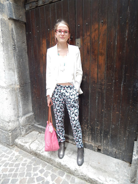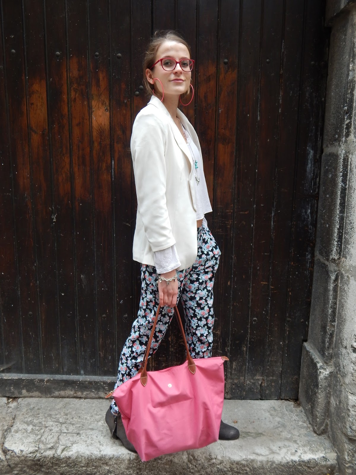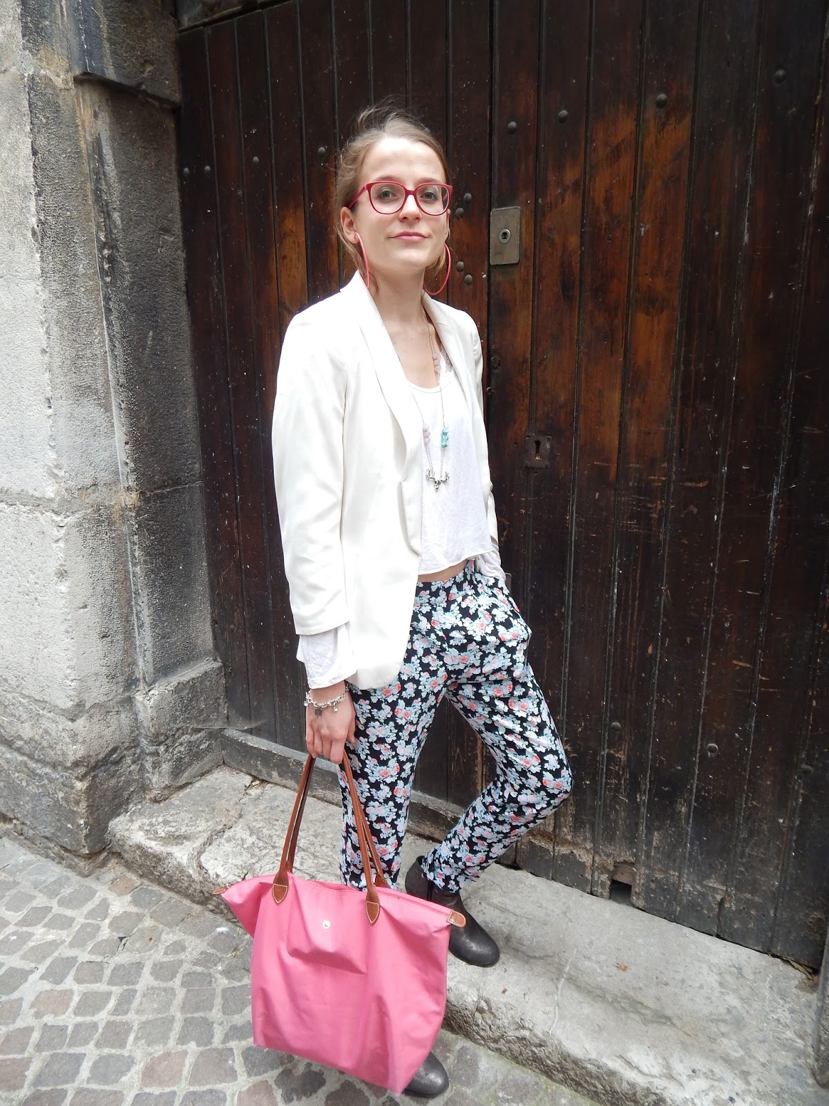 mon pantalon fleuri, des bottines, mon sac Longchamp rose, des énormes boucles d’oreilles que j’ai ressorties pour faire une vidéo et que j’ai gardées, et mon petit bracelet parisien que vous verrez dans un haul prochainement ( ainsi que le soutien-gorge ahah)