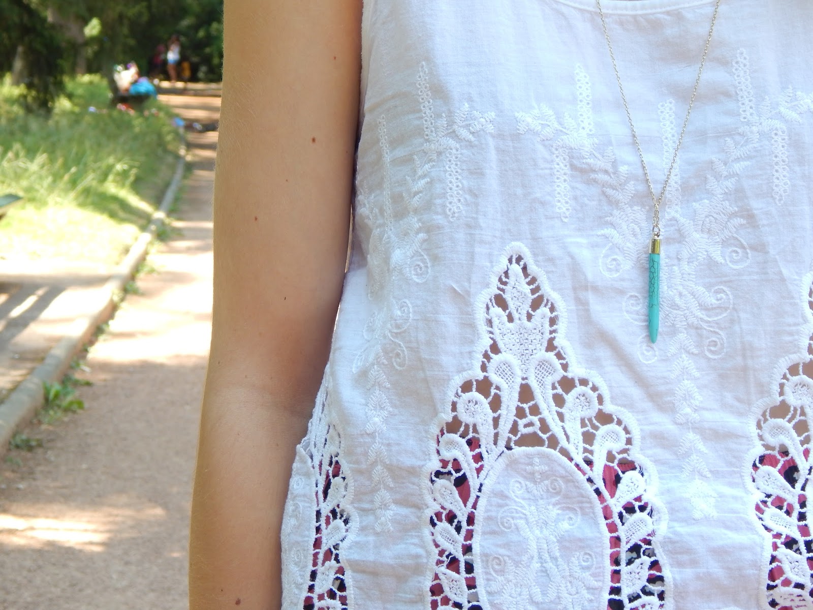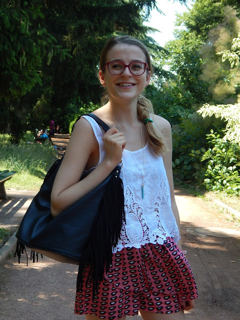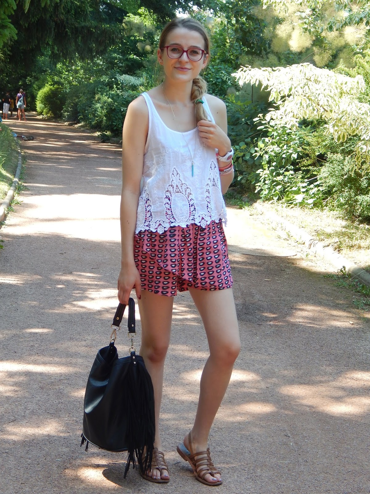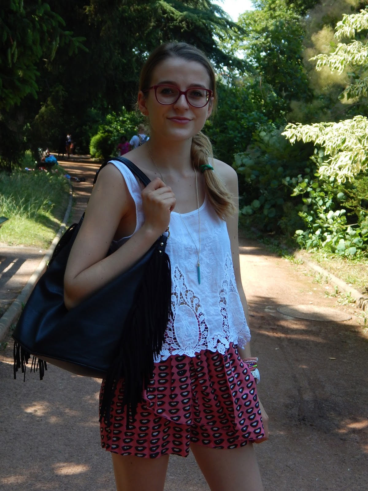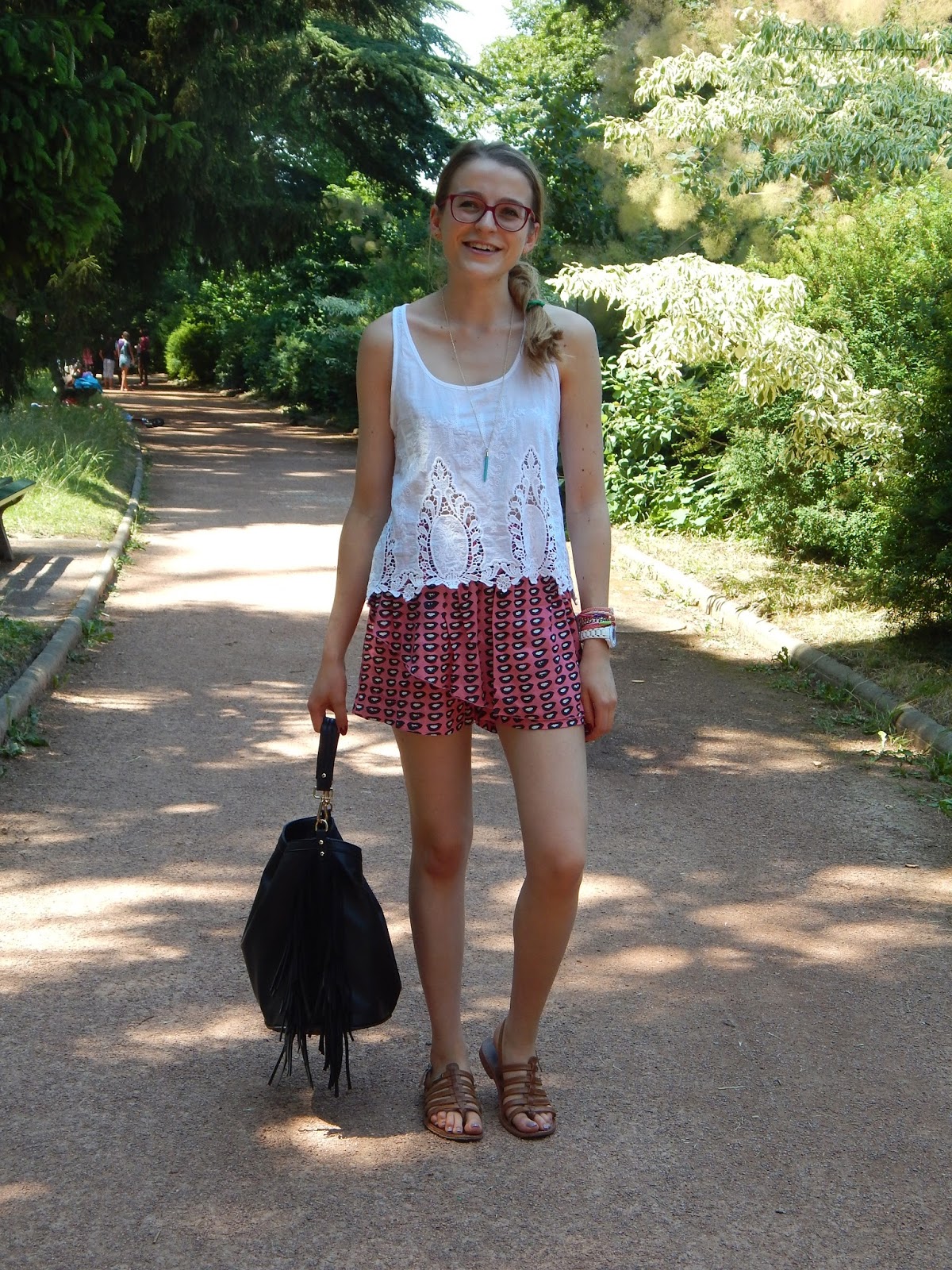 Un chouette midi et après-midi entre blogueuses, en un chaud et beau dimanche à Lyon. Un pique-nique qui a permis de se rencontrer. On était une douzaine, et j’ai donc revu ( Candice ) vu ( Alice) et découvert des filles (et des garçons), ( Ségolène, Nastasia, Valérie, Biche, Léna, Justine, Julia, Maxime et Anthony). J’en ai même profité pour acheter un joli bracelet à Biche dont j’adore le style. Vous ne le verrez pas sur les photos, je l’ai acheté après les photos. C’était vraiment sympa, et on en a profité avec ma Candice pour prendre quelques photos. Du moins, elle a pris mes photos, Alice a pris les siennes. Ce jour-là, lendemain de canicule, la tenue légère était évidente. J’ai sorti ce top en dentelle shoppé 5€ chez Zara cet hiver ( bizarre de trouver ce top en soldes d’hiver mais enfin bref), ce petit short de la collection Andy Warhol pour Pepe Jeans, sur lequel je suis tombée dessus chez Stokomani (enseigne qui revend des marques moins chères). Il était le seul à ma taille, et j’ai adoré l’imprimé original, sa forme ( jupe short et pas trop court), idéal pour travailler quand on ne veut pas mettre quelque chose de trop moulant.