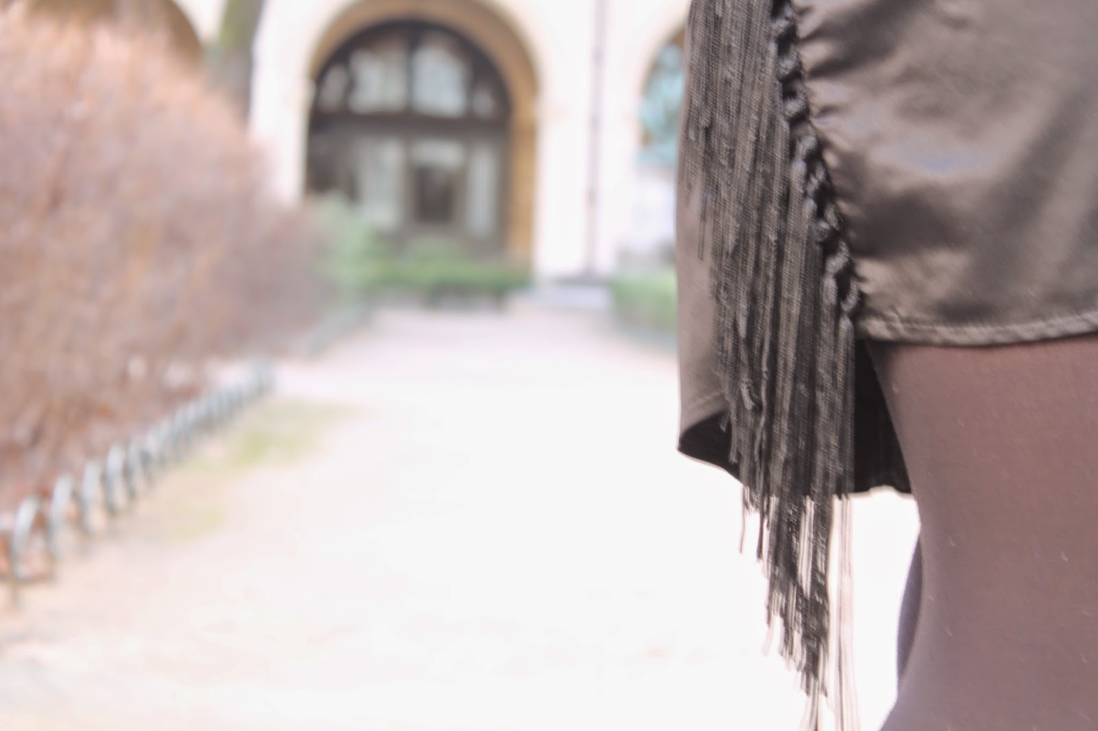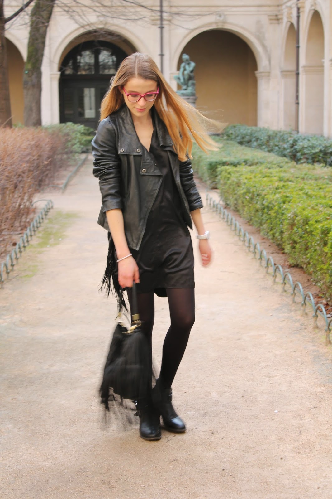 Je portais ce jour-là ma nouvelle robe frangée de chez Urban achetée en soldes, mon perf Mango pour un look rock, des bottines ajourées que vous commencez à connaître ( quoi tu ne les as jamais vues?!), mon sac frangé ( seul petit sac noir). Un look bien dark en somme, ça ne me ressemble pas tellement, je pense qu’en ayant vu mes anciens looks vous l’aurez remarqué.