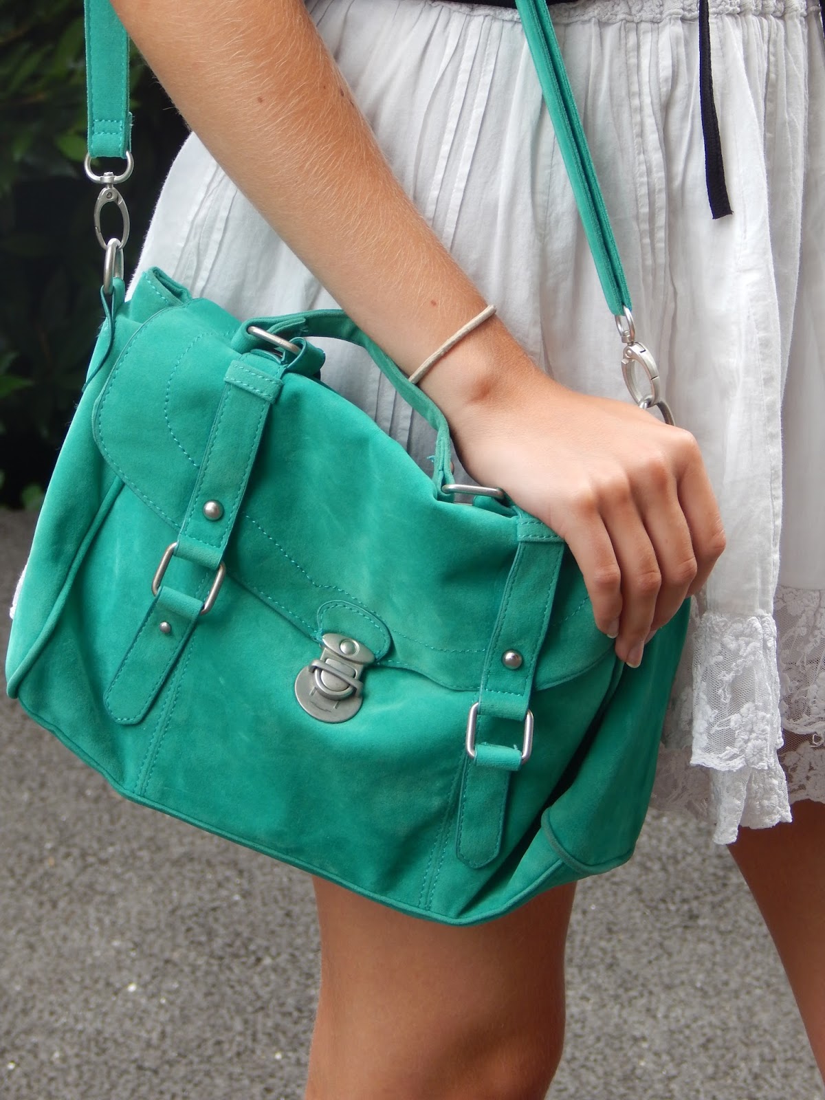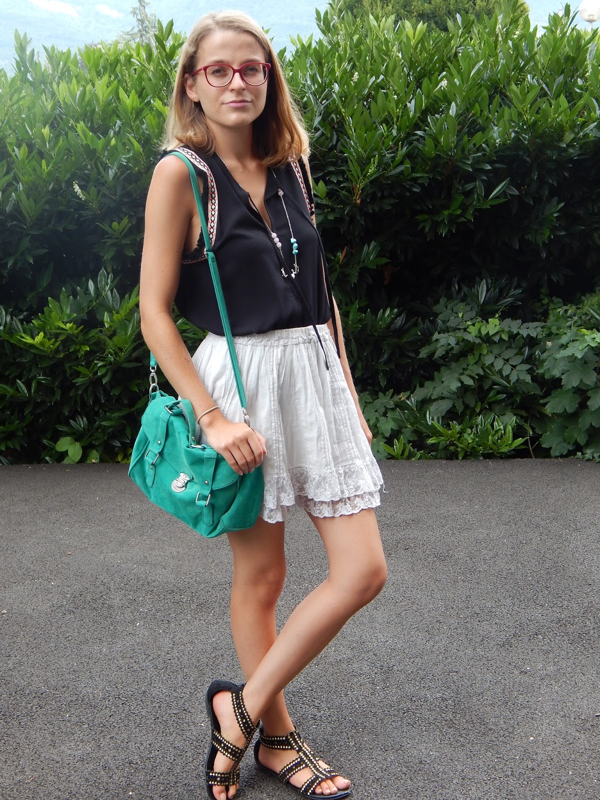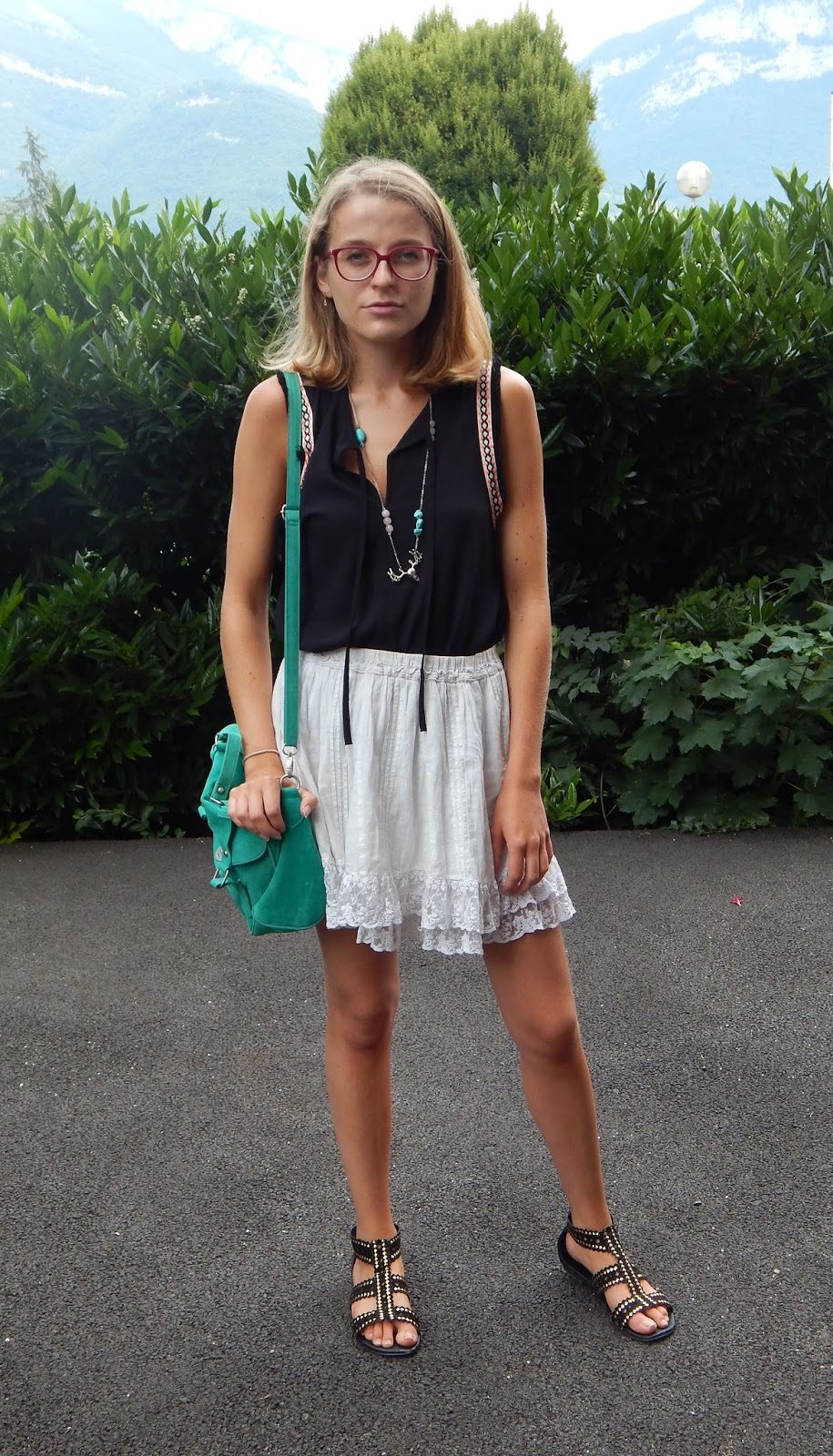 Une tenue sans prise de tête, shootée à mon retour de vacances. Je voulais ressortir ce petit sac vert trop choupi acheté il y a des années, mais que je ne porte que très rarement à cause de la couleur, pas facile à asssocier. Du coup, j’ai dû opter pour un look peu coloré pour aller avec. Ma jupe en dentelle