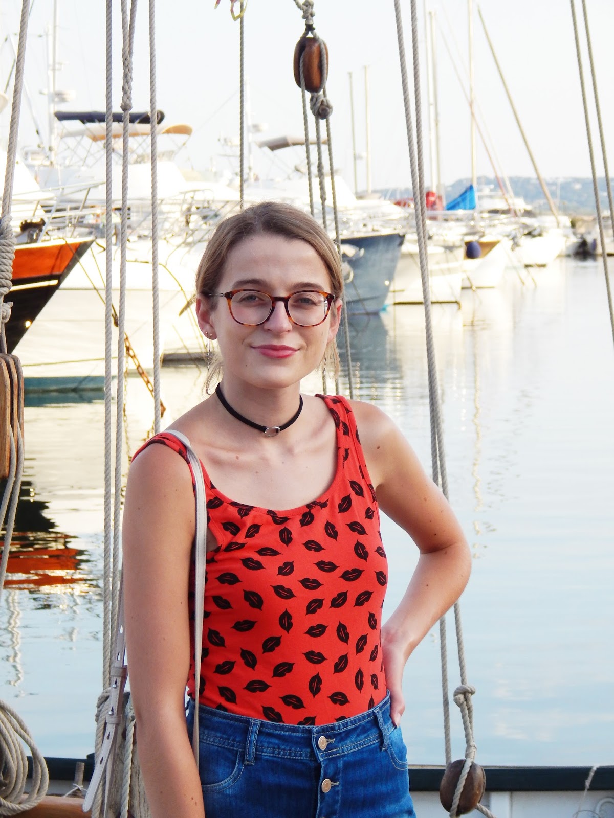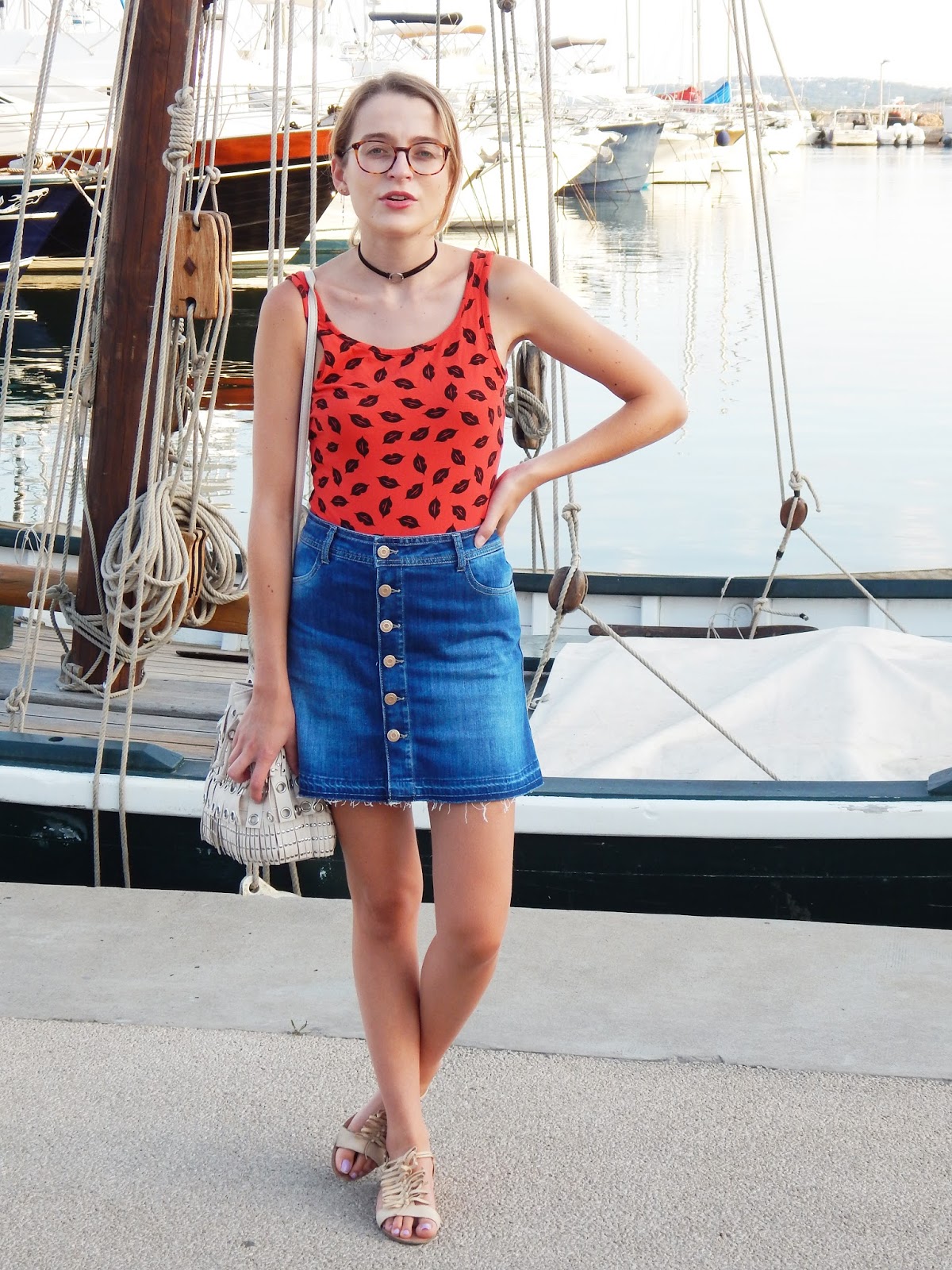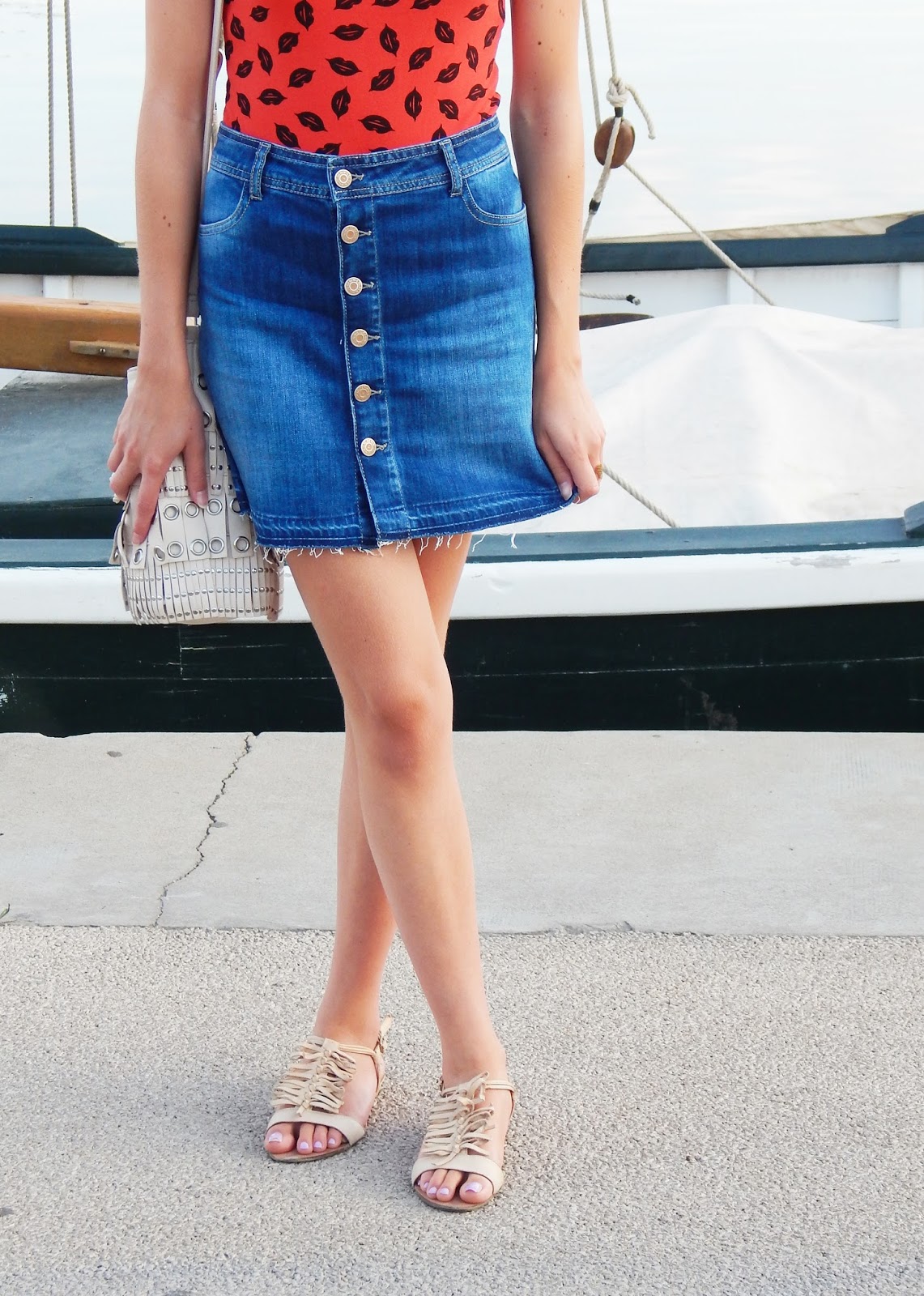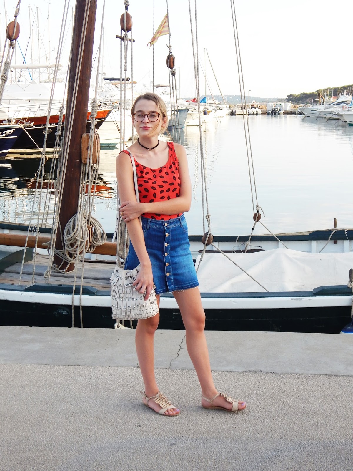 So, we toke this outfit in the South of France, precisely in Hyères, on the harbour, before going to eat at the restaurant. I’m wearing again my new denim skirt from Le temps des cerises (french brand), which I wore in this outfit, and in my last Haul videoI wear it with everything, it fits with everything, I’m delighted. That night then, I wore it with my body which I bought years ago for 5€. I didn’t wear it from a long time, so it was the occasion. And I love the result. Of course I wear my fringed bag from Mango, as well as my fringed sandals. Fringed and me it’s a love story, you could see that in this outfit.For my lips, I changed a little with a red lipstick, which my friend Amy offered me for our swap.