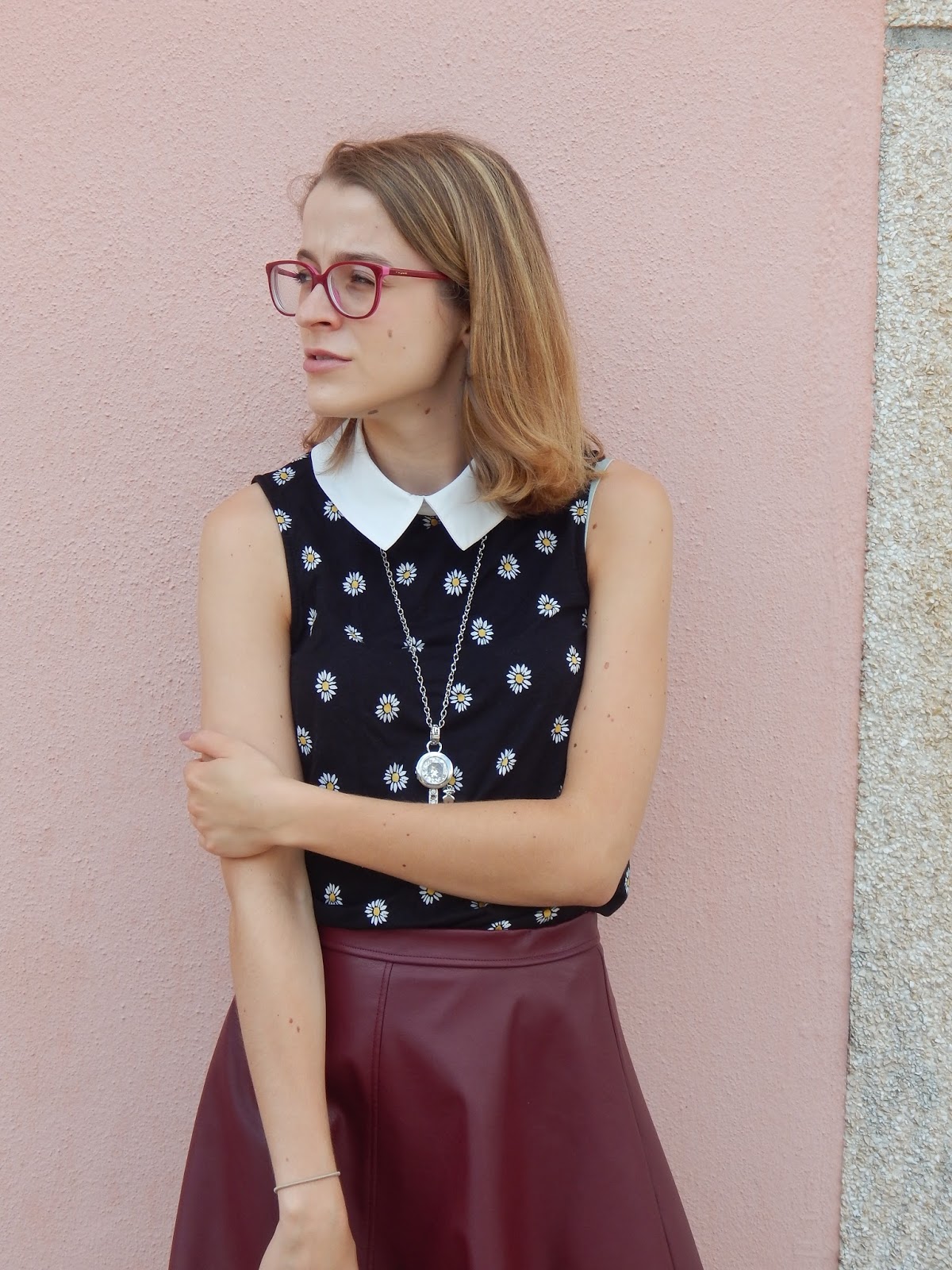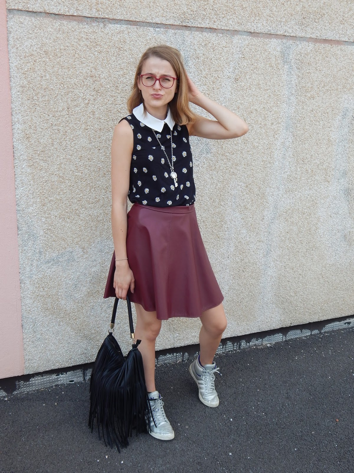 Je vous retrouve cette semaine avec un nouveau look. Toujours un timing assez serré et pas trop l’envie je vous avoue. Le personnel empiète sur le professionnel ahah. Je travaille pas mal dans l’optique de faire la formation que je voudrai dans un an, et pour m’occuper. Mais dans un mois: vacances. Ce jour-là, j’avais voulu ressortir ma jupe patineuse en similicuir New Look.