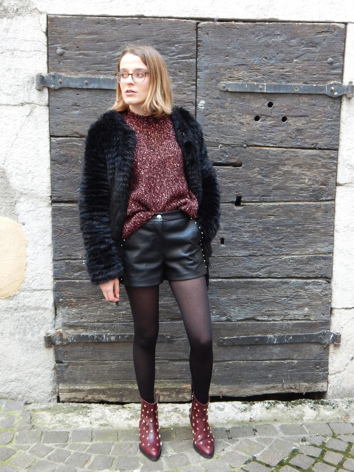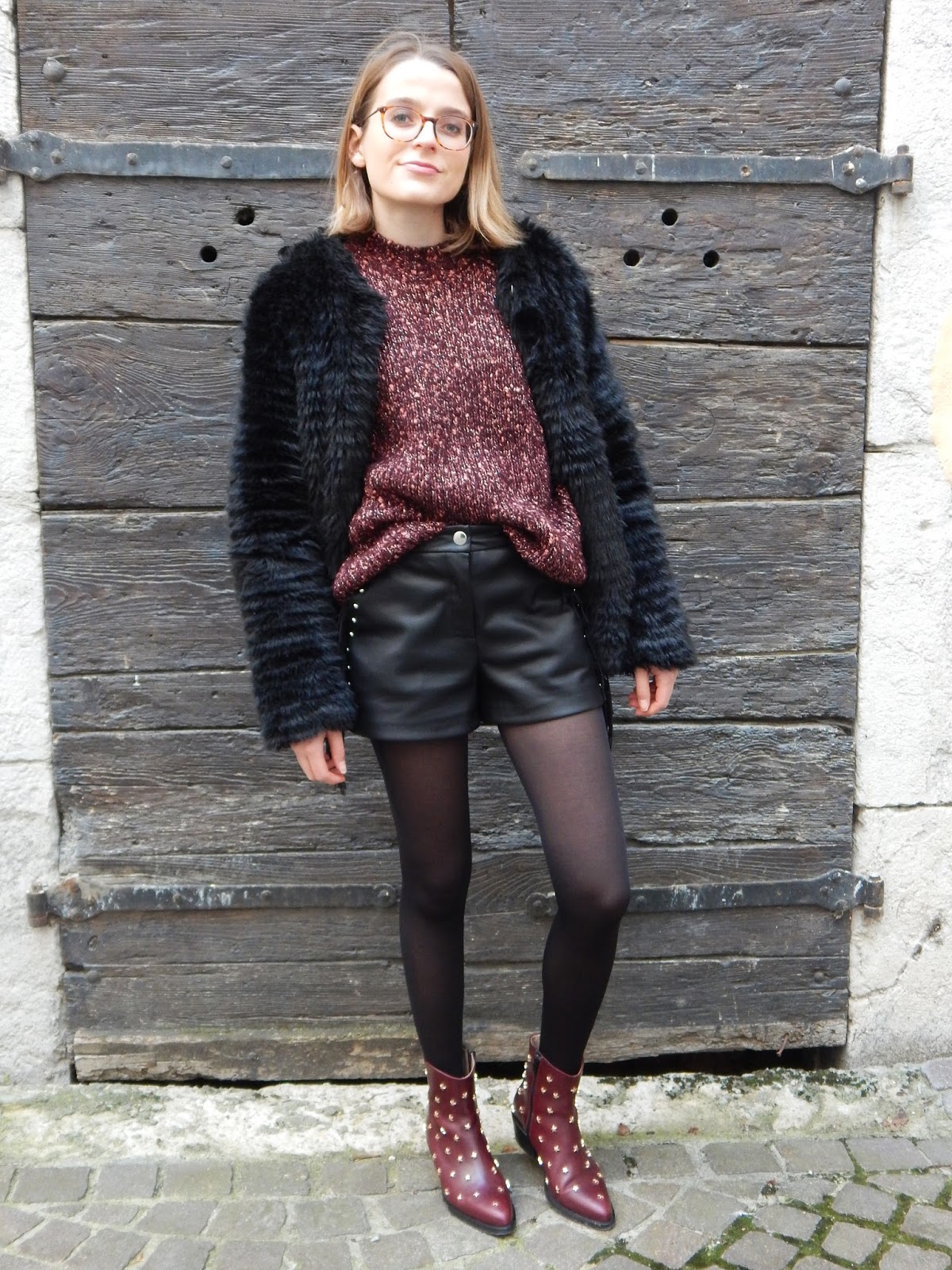 Veste/Faux fur: Pimkie; Pull/Sweater, Short: Mango; Bottines/Booties: Jonak x Collage Vintage