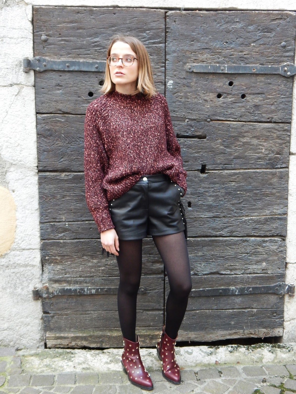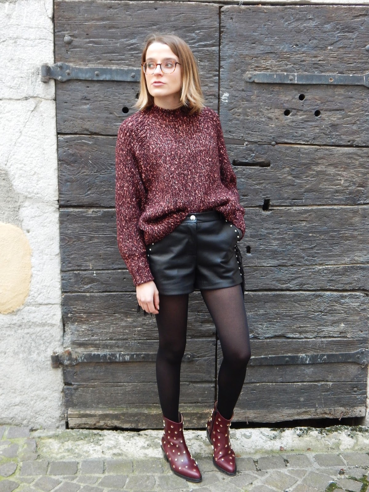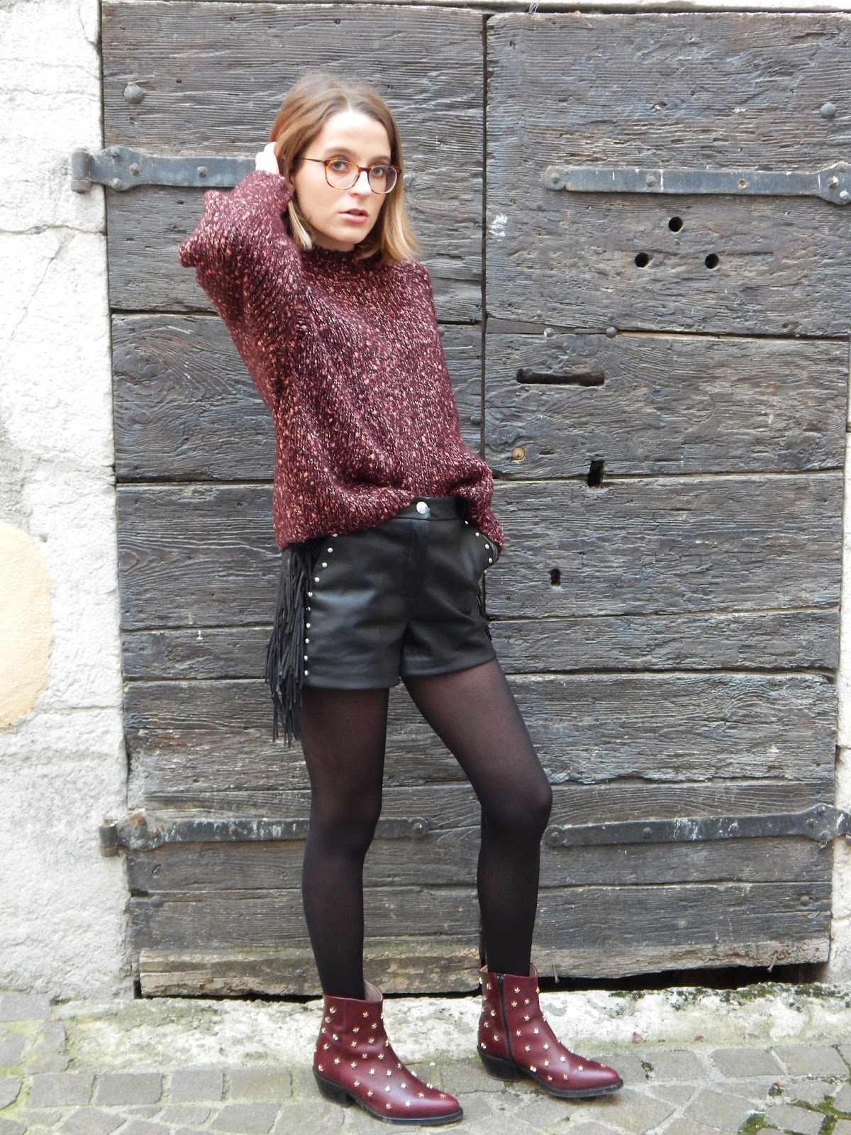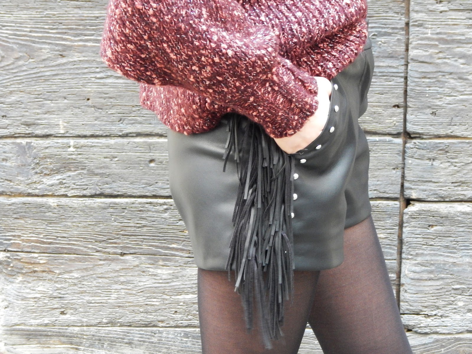 Afin d’inaugurer mon nouveau short en similicuir frangé que j’ai acheté lors d’essayages intempestifs chez Mango, j’avais l’idée de le combiner avec un gros pull. J’ai pensé à celui-ci de chez Mango toujours. Je ne vous ai pas présenté ce short dans un Haul puisque je l’ai acheté après ma vidéo sur le sujet… Par contre vous avez pu voir ce pull dans un autre look que je portais avec mon jean noir perlé ici.