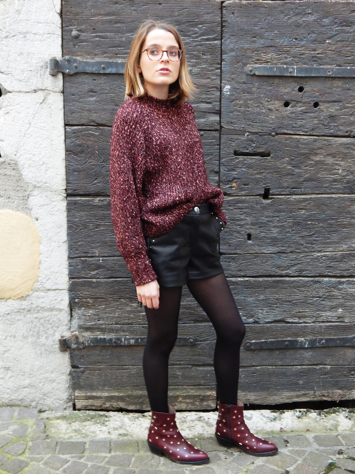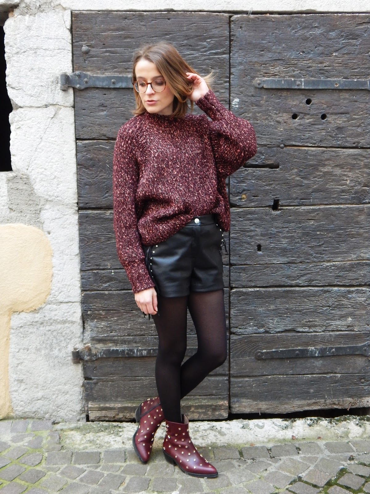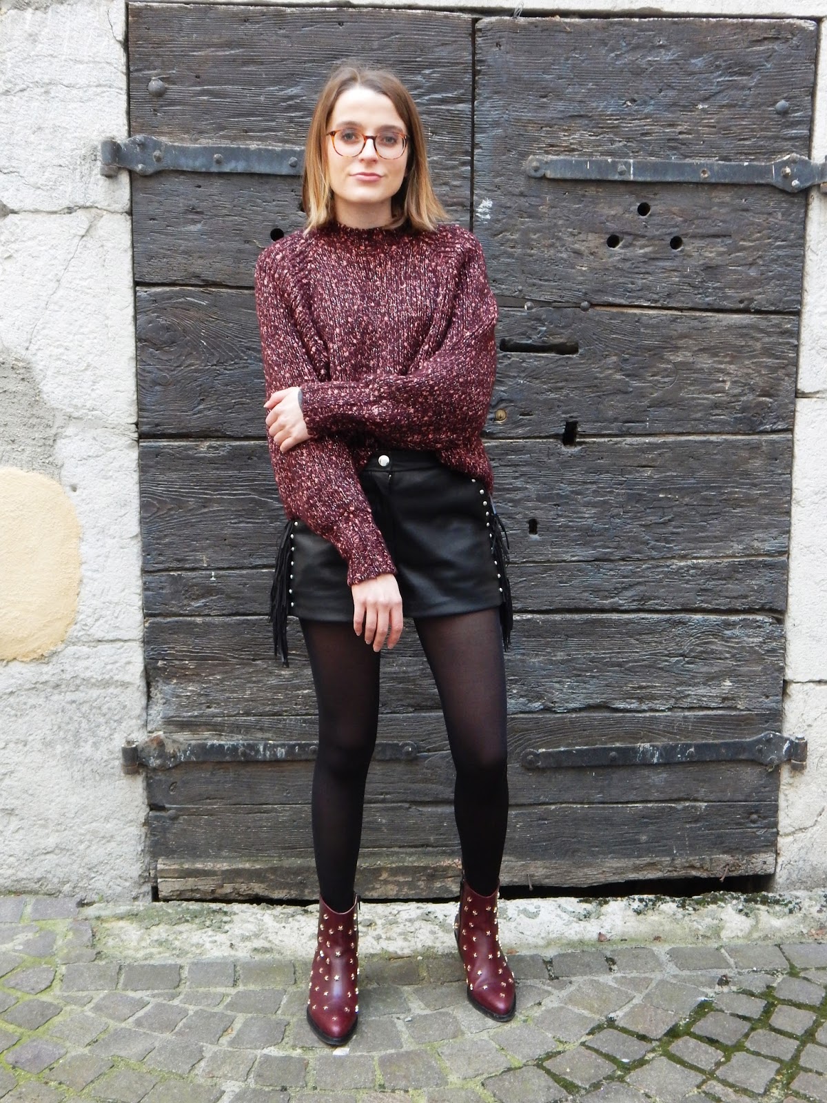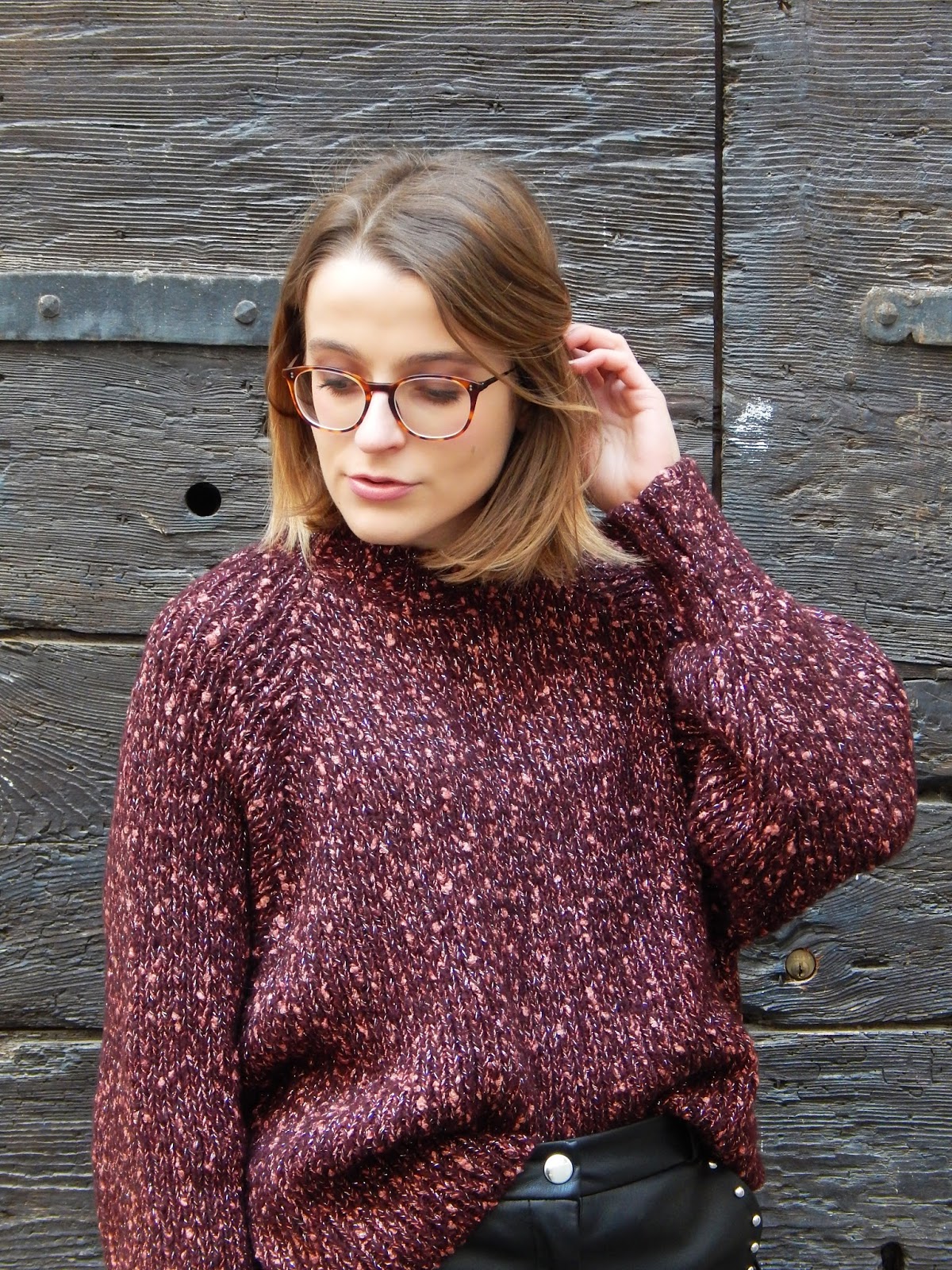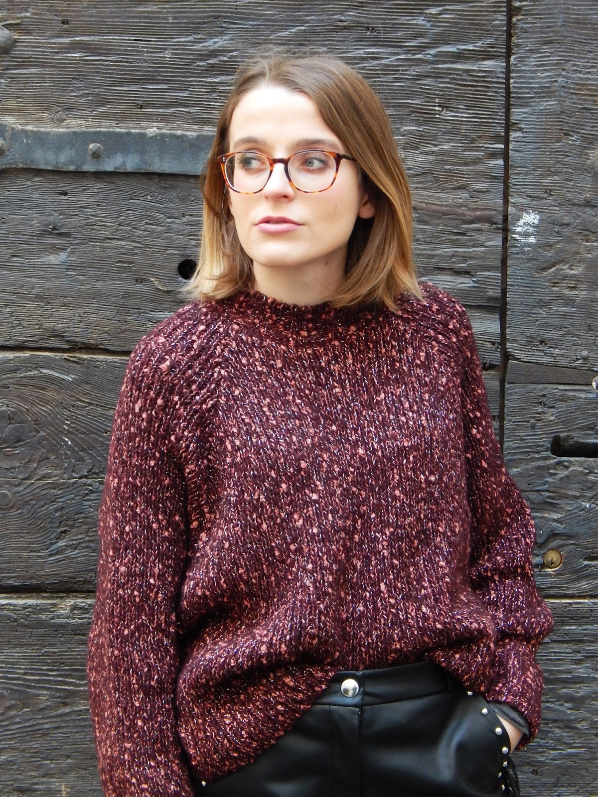 Afin d’inaugurer mon nouveau short en similicuir frangé que j’ai acheté lors d’essayages intempestifs chez Mango, j’avais l’idée de le combiner avec un gros pull. J’ai pensé à celui-ci de chez Mango toujours. Je ne vous ai pas présenté ce short dans un Haul puisque je l’ai acheté après ma vidéo sur le sujet… Par contre vous avez pu voir ce pull dans un autre look que je portais avec mon jean noir perlé ici.