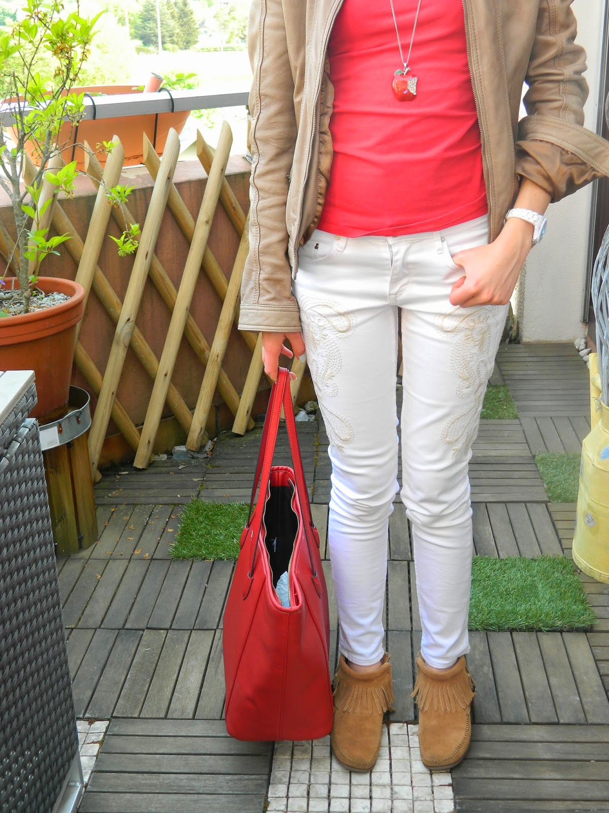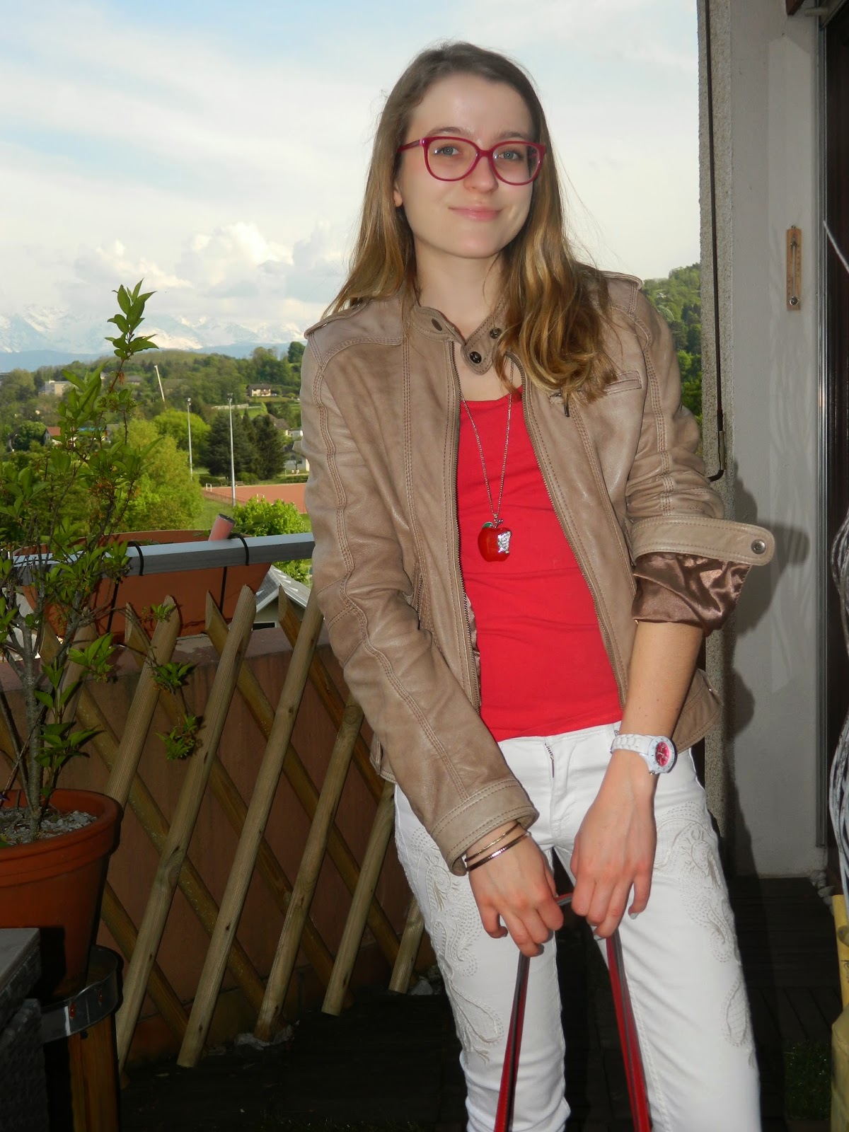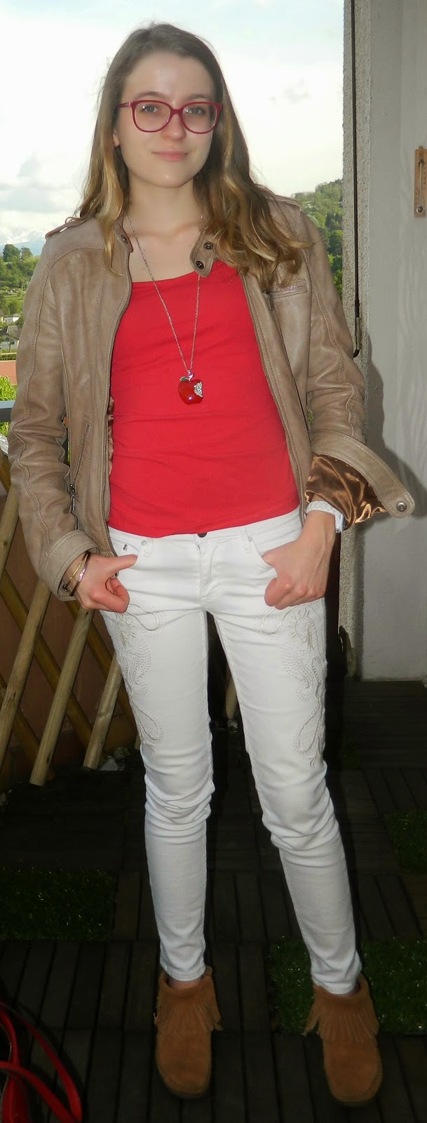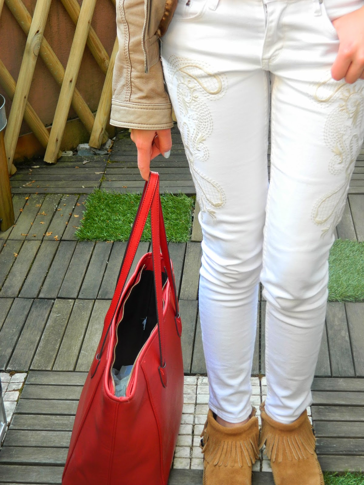 Un look un peu ancien, puisque j’étais en jean et en bottines… Mon haut rouge pas mis il y a un bail, cette veste en simili, mon jean blanc et mes Minnetonka d’amouuuurr.