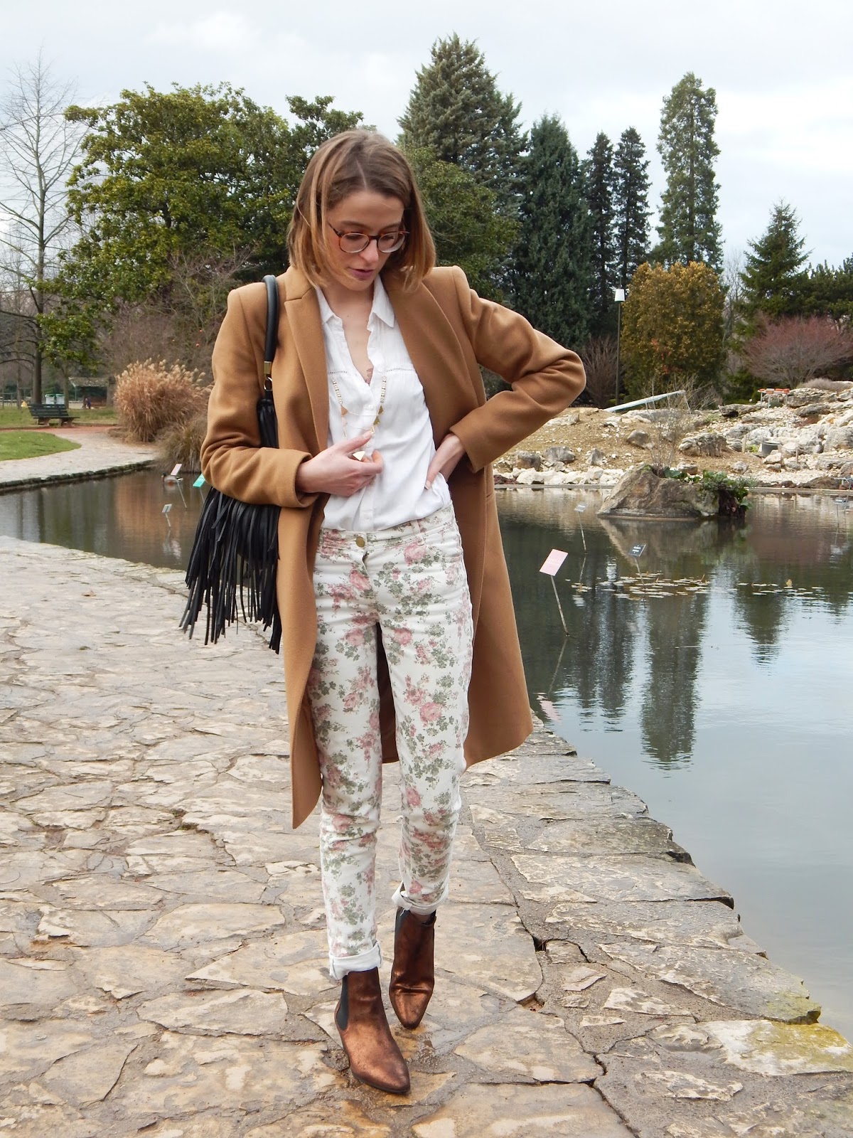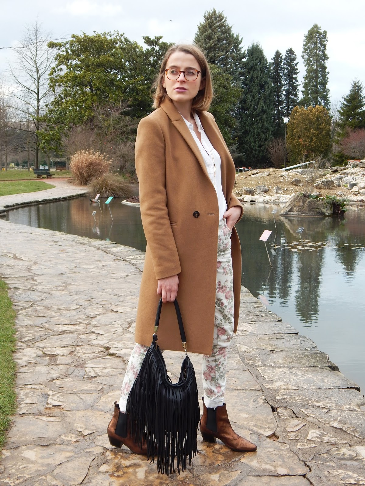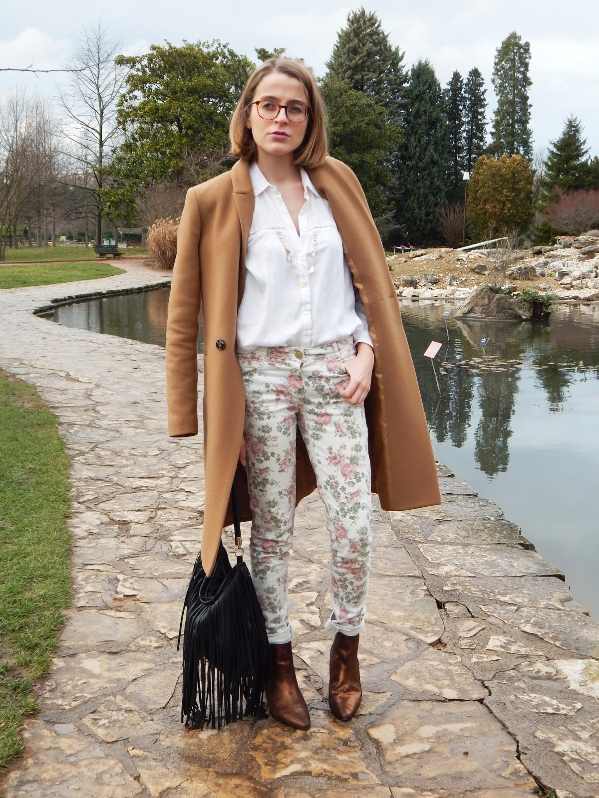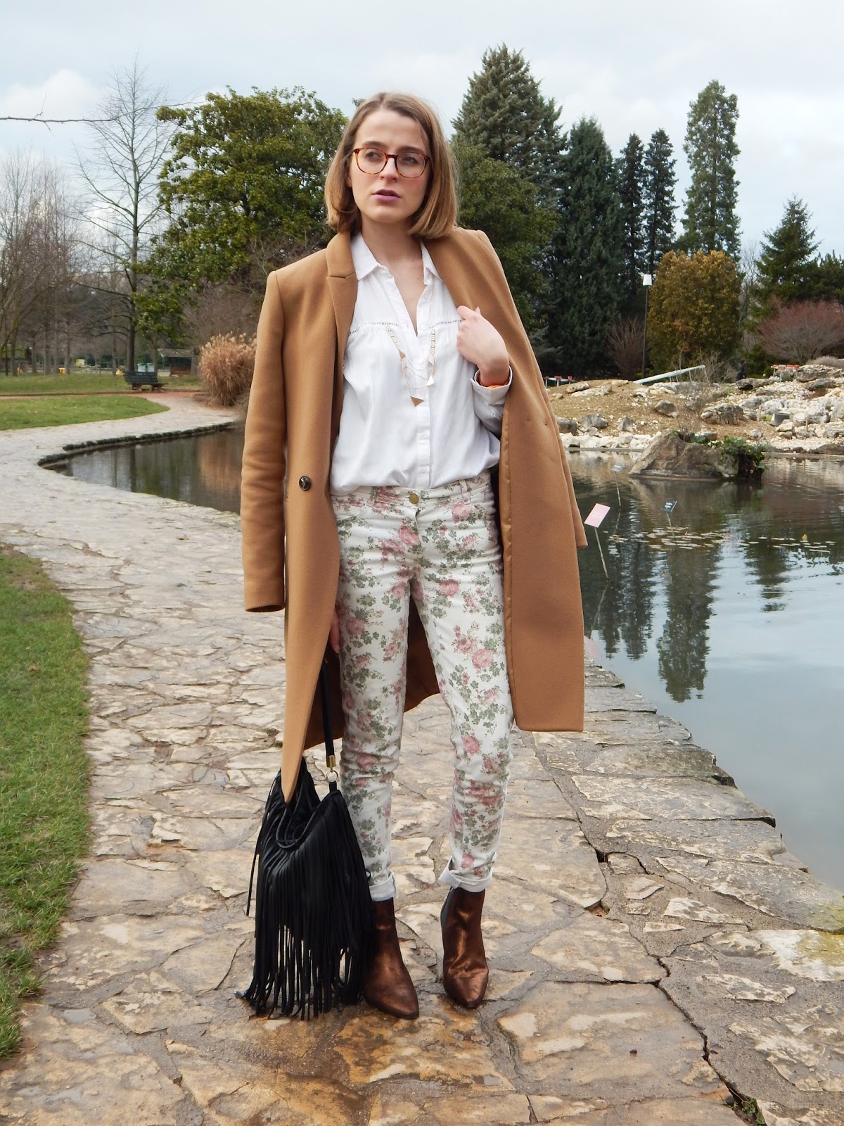 Une série de photos prise à Lyon, devant la jolie mare du début du parc. Ce jour-là, j’avais envie de changer de mes jeans habituels et pas très originaux, pour celui-ci de chez Pimkie que j’ai depuis des années, plus printanier que hivernal mais peu importe. Avec, je porte ma chemise Stradivarius à froufrous qui était d’ailleurs soldée, mais qui est vite partie. Vous pouvez d’ailleurs retrouver ma sélection de soldes juste ici. J’avais envie de couleurs douces. Aux pieds, je reporte mes bottines bronze, seule paire que j’avais apportée pour ces trois jours à Lyon, ce qui explique que vous les reverrez dans le prochain look, et tout simplement aussi parce que je les adore et qu’elles vont avec tout. Je vous prépare bientôt une vidéo Haul, donc n’hésitez pas à vous abonner à ma chaîne Youtube afin d’être informée dès qu’elle sortira.