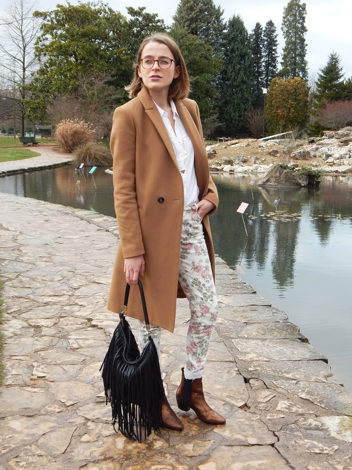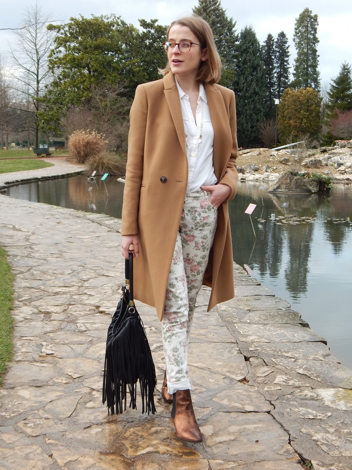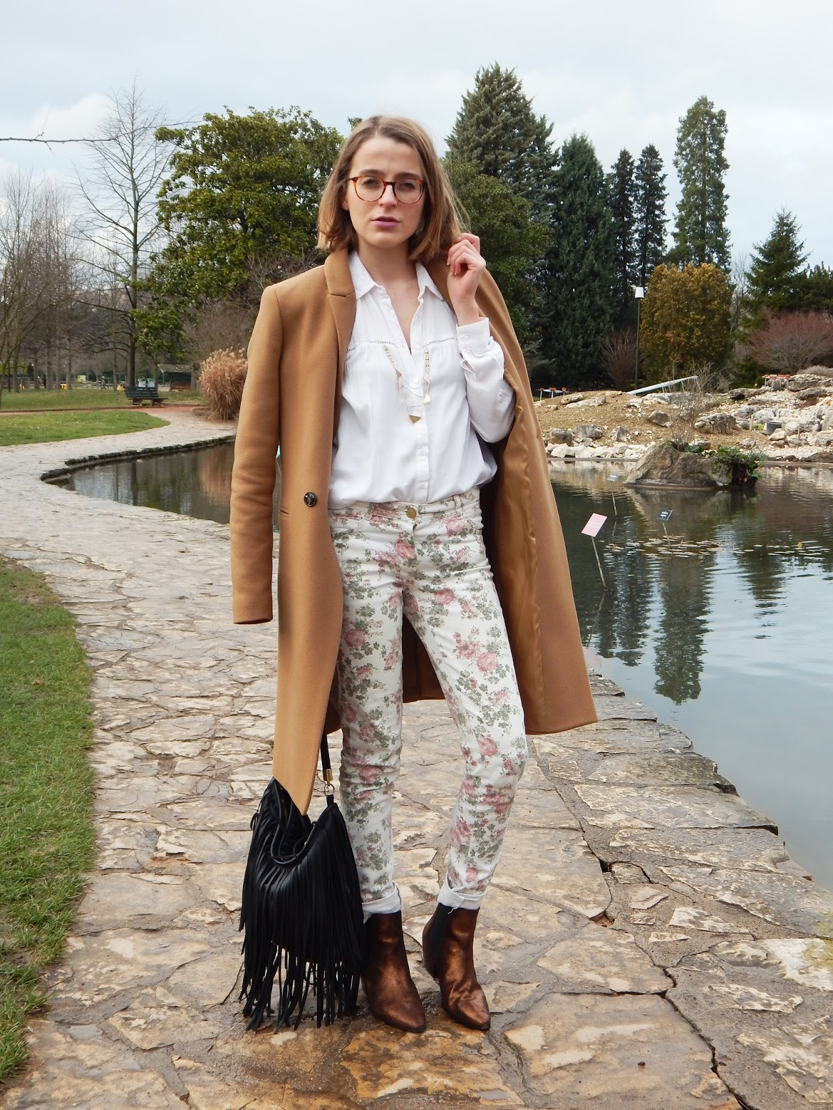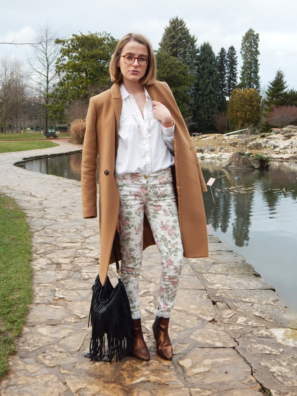 Une série de photos prise à Lyon, devant la jolie mare du début du parc. Ce jour-là, j’avais envie de changer de mes jeans habituels et pas très originaux, pour celui-ci de chez Pimkie que j’ai depuis des années, plus printanier que hivernal mais peu importe. Avec, je porte ma chemise Stradivarius à froufrous qui était d’ailleurs soldée, mais qui est vite partie. Vous pouvez d’ailleurs retrouver ma sélection de soldes juste ici. J’avais envie de couleurs douces. Aux pieds, je reporte mes bottines bronze, seule paire que j’avais apportée pour ces trois jours à Lyon, ce qui explique que vous les reverrez dans le prochain look, et tout simplement aussi parce que je les adore et qu’elles vont avec tout. Je vous prépare bientôt une vidéo Haul, donc n’hésitez pas à vous abonner à ma chaîne Youtube afin d’être informée dès qu’elle sortira.