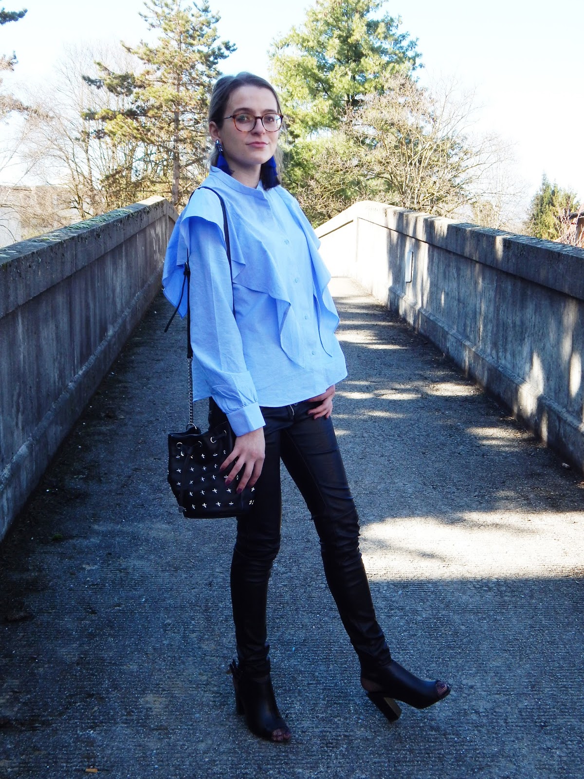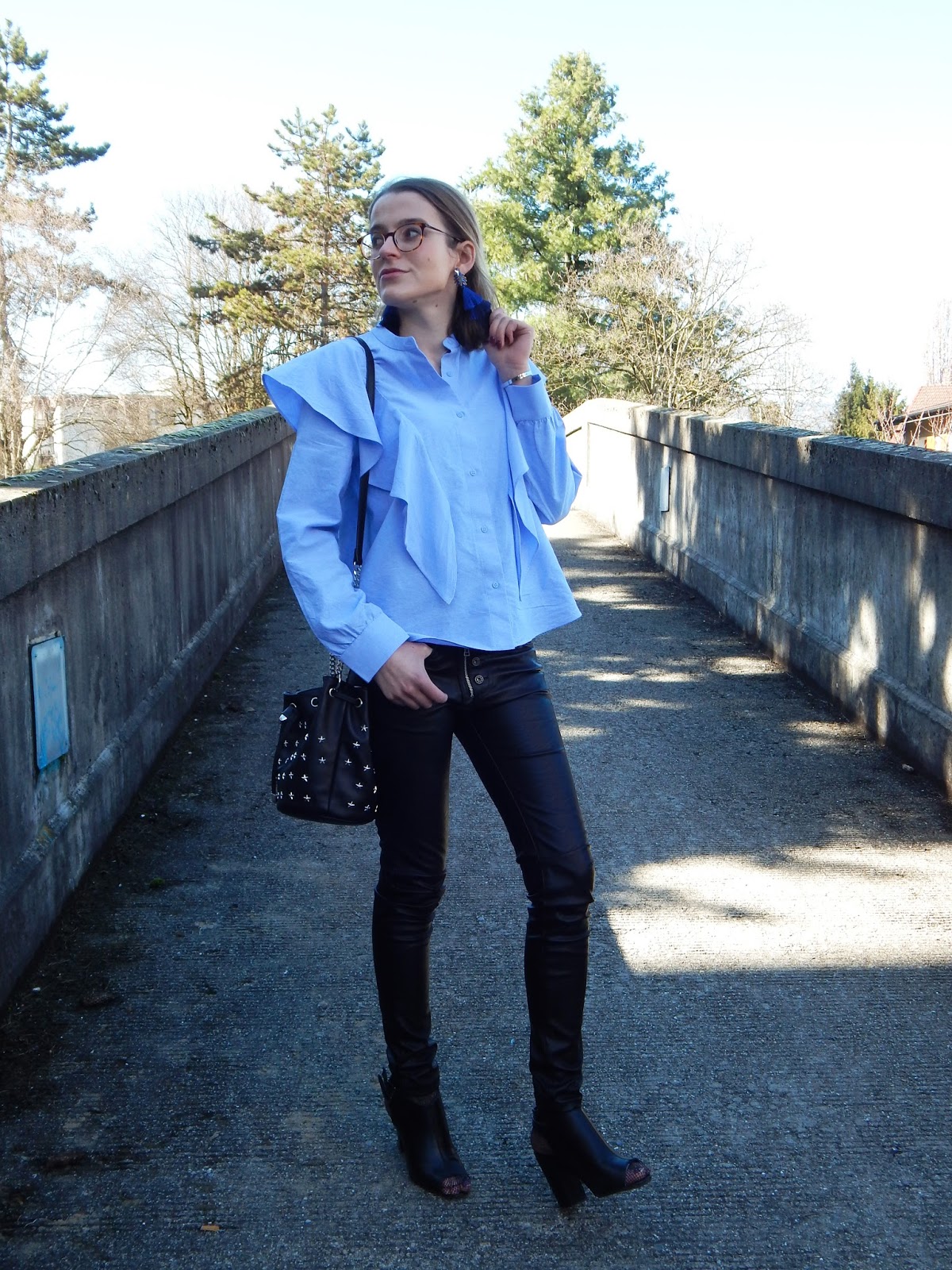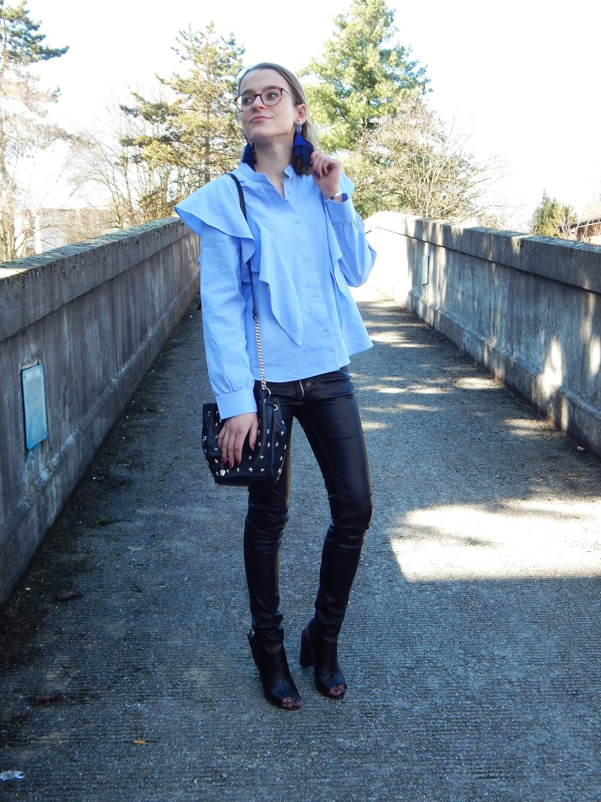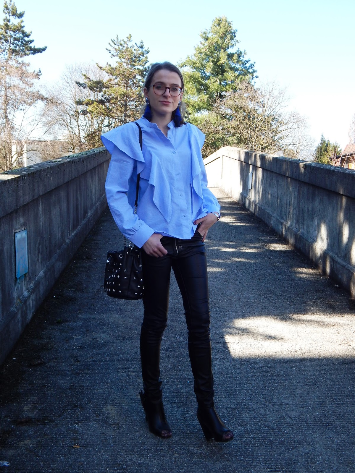 Une tenue avec des mélanges de style que j’ai volontairement souhaitée. En effet, cette chemise à froufrous & Other stories que je vous montrais dans ma vidéo Haul, est assez particulière et peut vite faire mémère. C’est pour ça que j’ai pensé à mon pantalon en similicuir pour aller avec, pour complètement casser ce côté. Je suis plutôt pas mal satisfaite du résultat. J’y ai ajouté ma nouvelle paire de boucles d’oreilles fantaisie de chez Stradivarius. J’ai fait une grosse razzia chez eux dernièrement niveau accessoires, et elles apportent vraiment LE truc en plus. Mes nouvelles petites chaussettes en genre de résille, mes bottines ajourées et voilà!