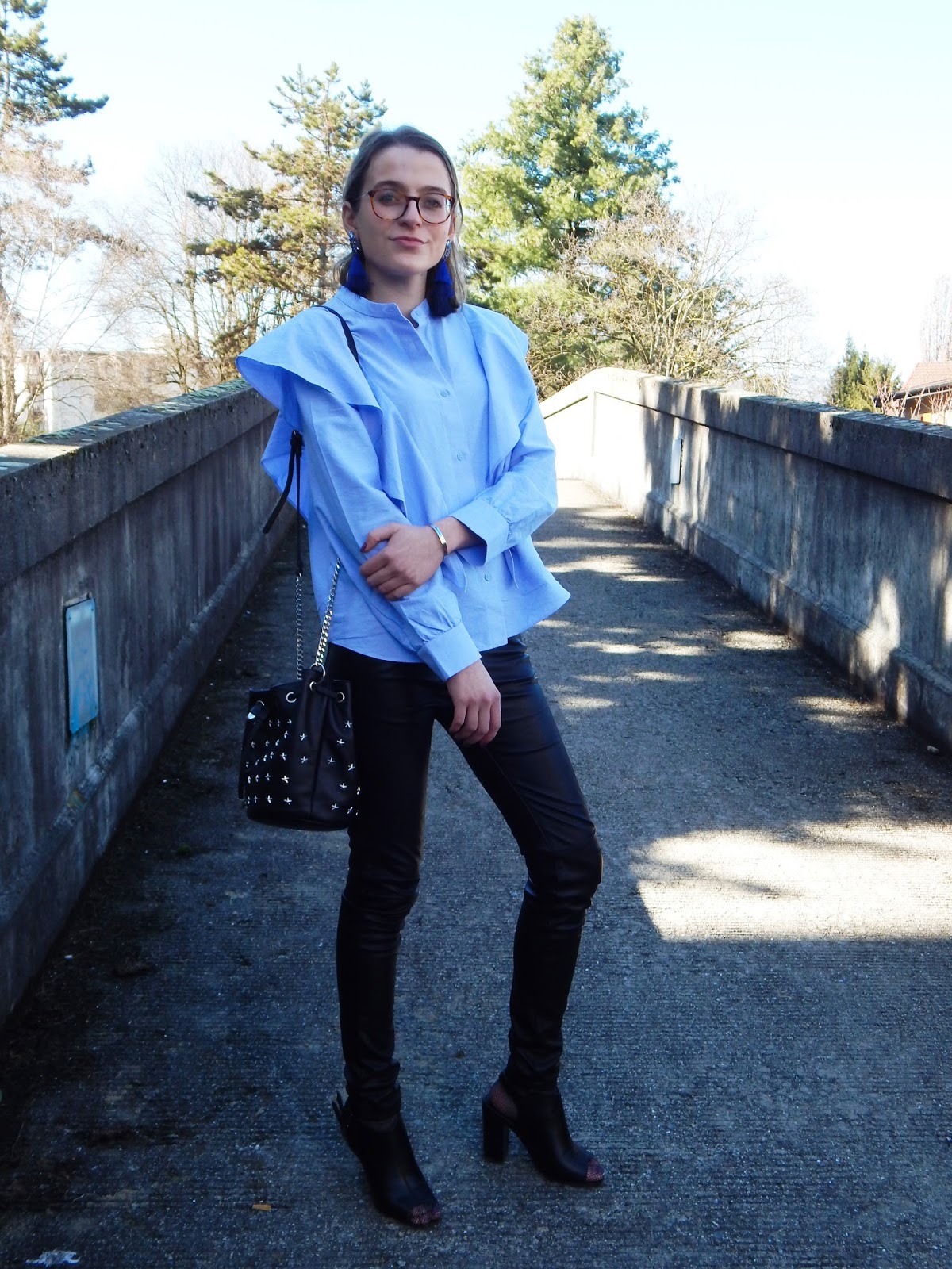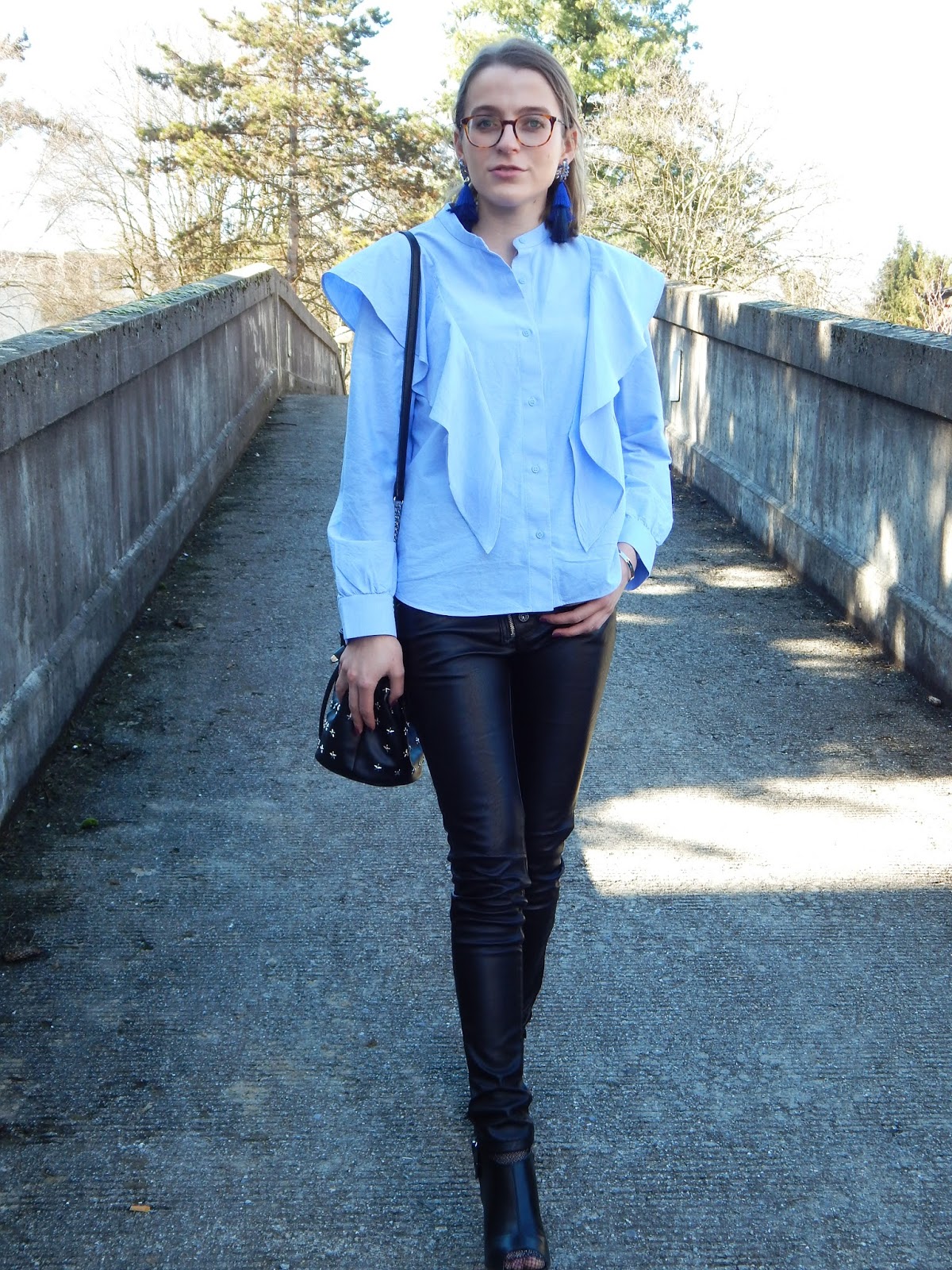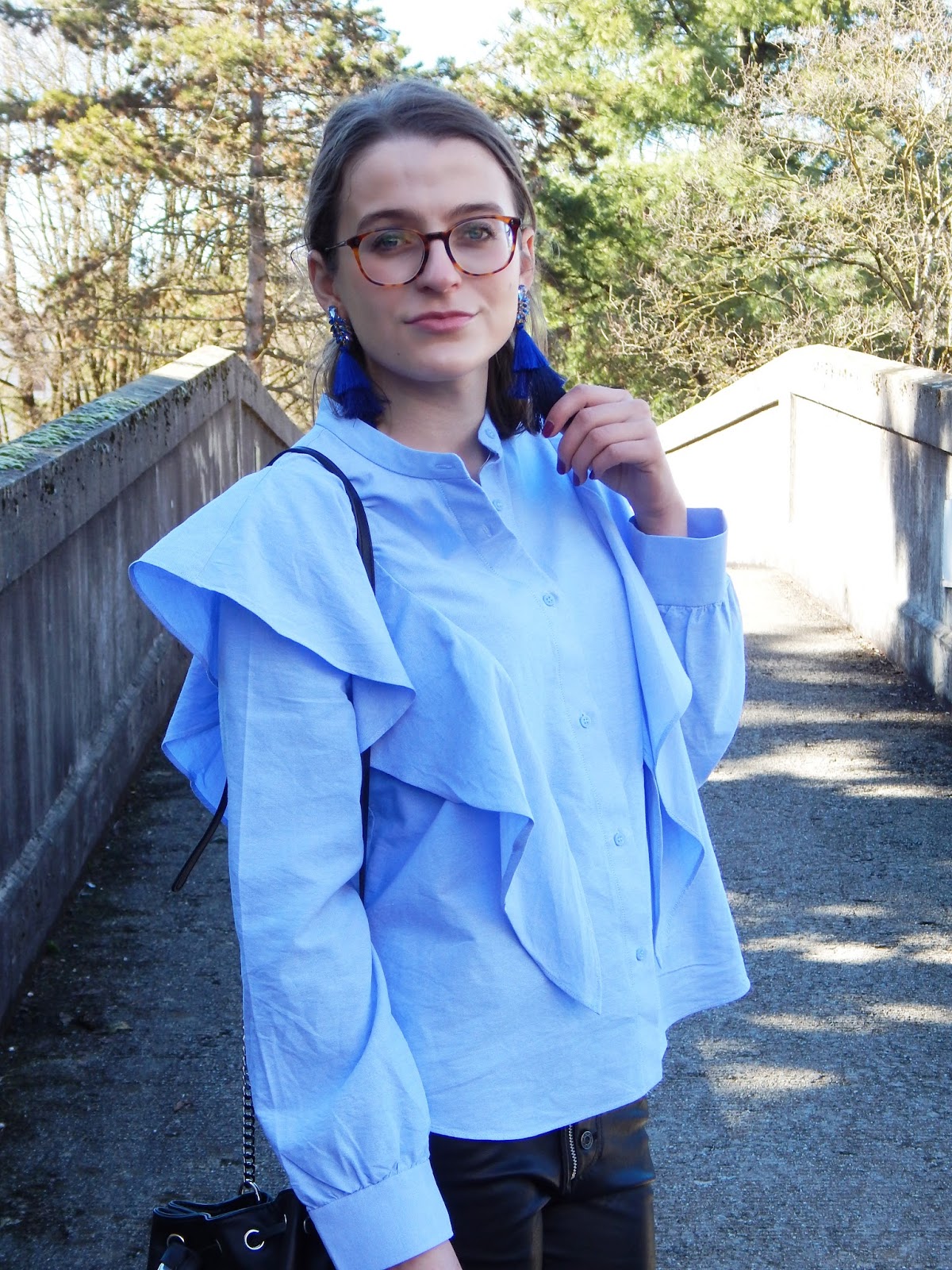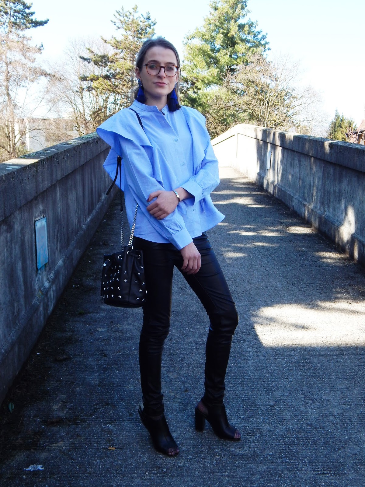 Une tenue avec des mélanges de style que j’ai volontairement souhaitée. En effet, cette chemise à froufrous & Other stories que je vous montrais dans ma vidéo Haul, est assez particulière et peut vite faire mémère. C’est pour ça que j’ai pensé à mon pantalon en similicuir pour aller avec, pour complètement casser ce côté. Je suis plutôt pas mal satisfaite du résultat. J’y ai ajouté ma nouvelle paire de boucles d’oreilles fantaisie de chez Stradivarius. J’ai fait une grosse razzia chez eux dernièrement niveau accessoires, et elles apportent vraiment LE truc en plus. Mes nouvelles petites chaussettes en genre de résille, mes bottines ajourées et voilà!