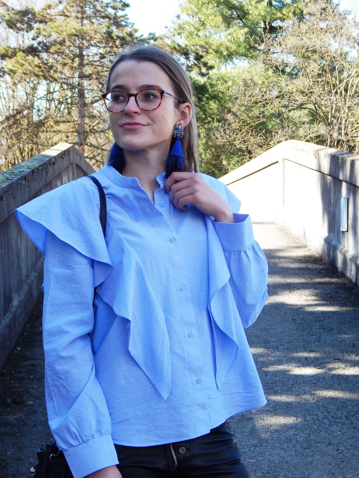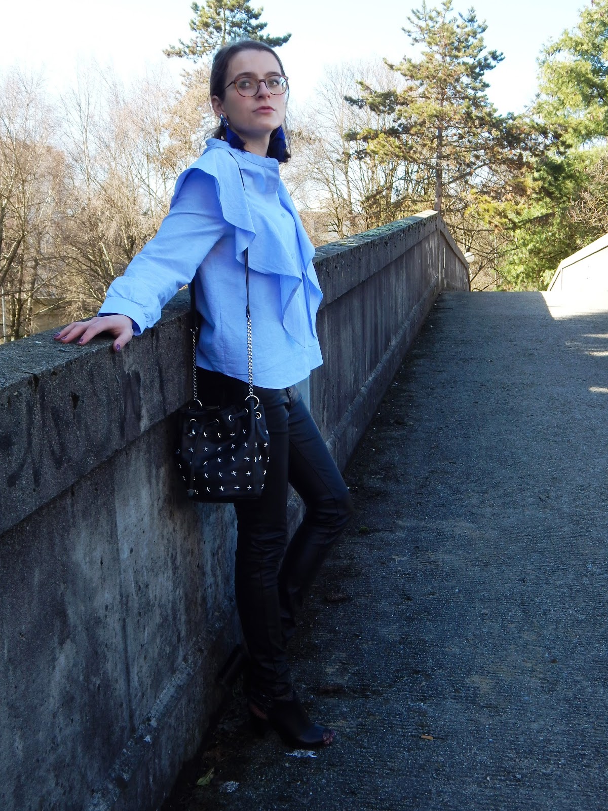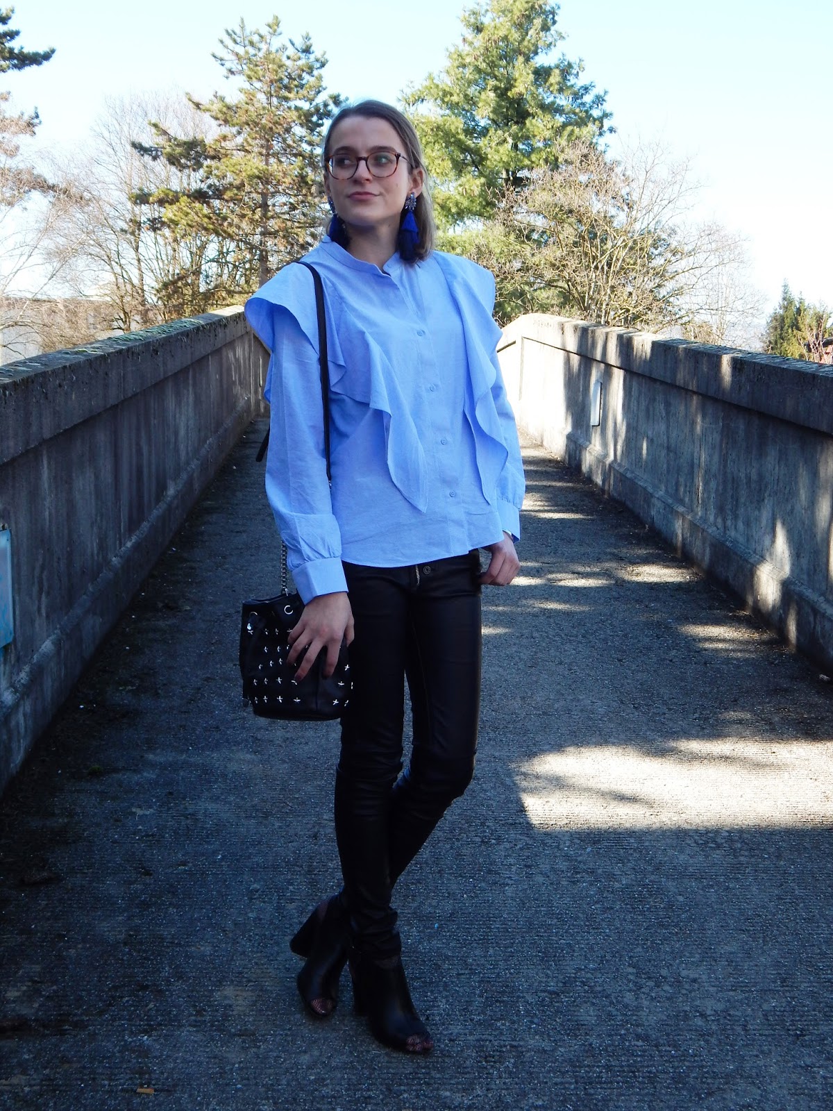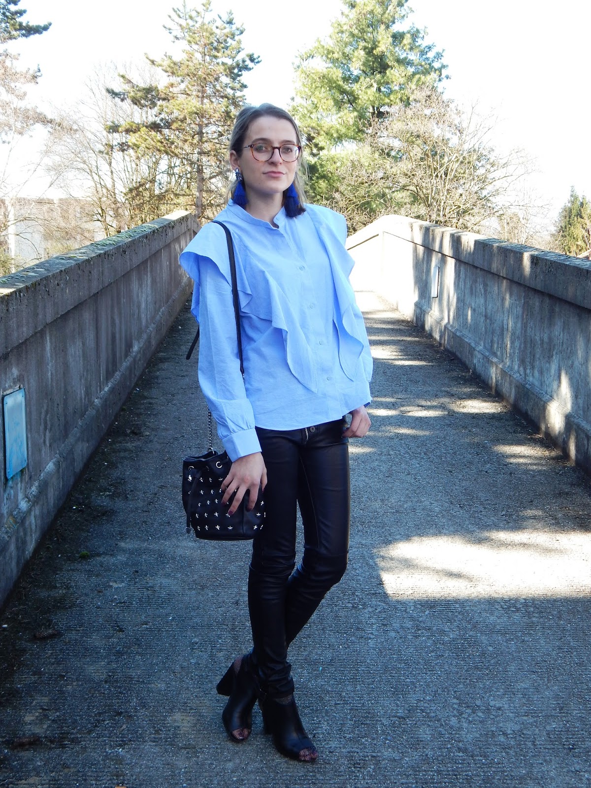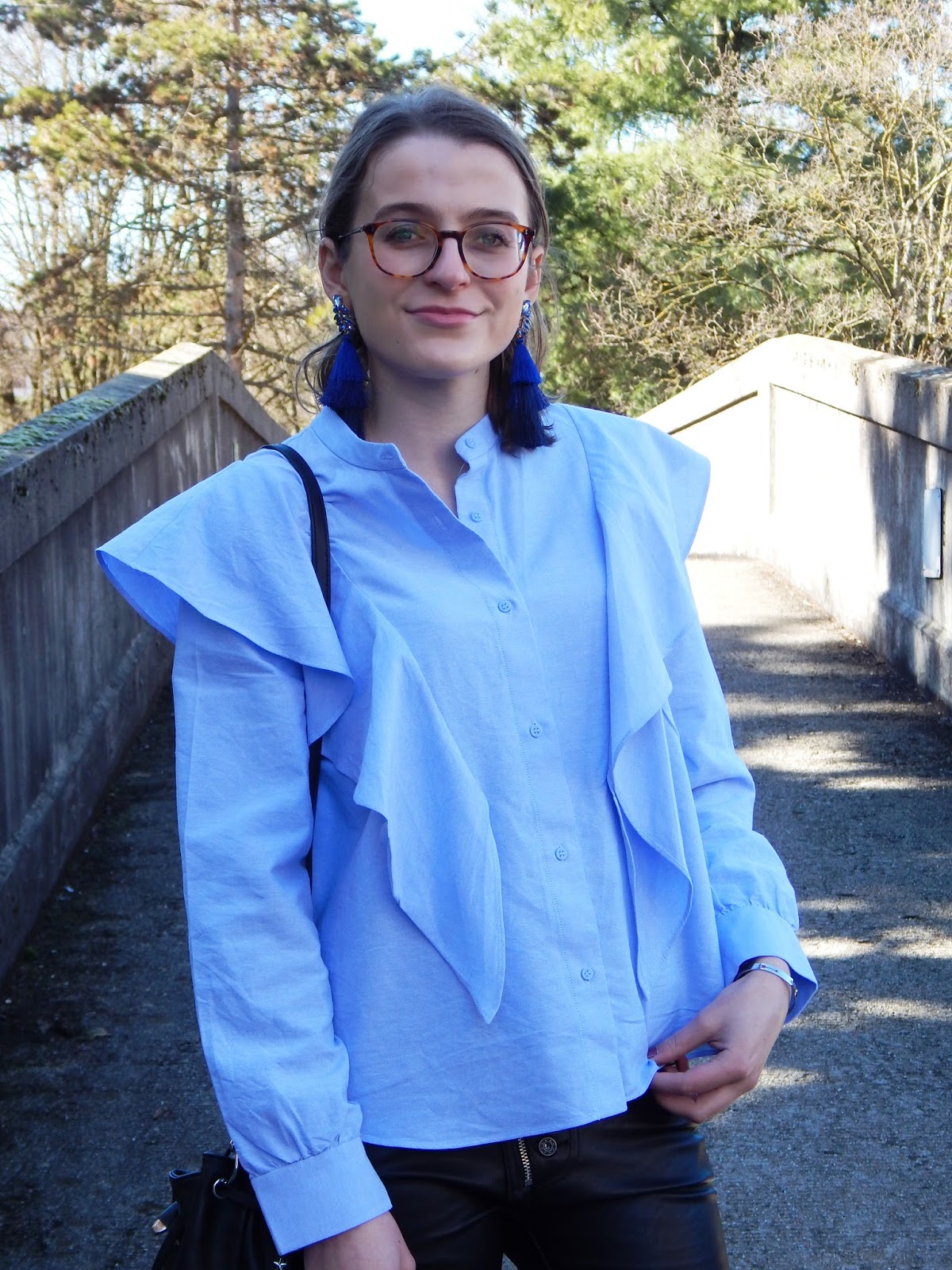 Une tenue avec des mélanges de style que j’ai volontairement souhaitée. En effet, cette chemise à froufrous & Other stories que je vous montrais dans ma vidéo Haul, est assez particulière et peut vite faire mémère. C’est pour ça que j’ai pensé à mon pantalon en similicuir pour aller avec, pour complètement casser ce côté. Je suis plutôt pas mal satisfaite du résultat. J’y ai ajouté ma nouvelle paire de boucles d’oreilles fantaisie de chez Stradivarius. J’ai fait une grosse razzia chez eux dernièrement niveau accessoires, et elles apportent vraiment LE truc en plus. Mes nouvelles petites chaussettes en genre de résille, mes bottines ajourées et voilà!