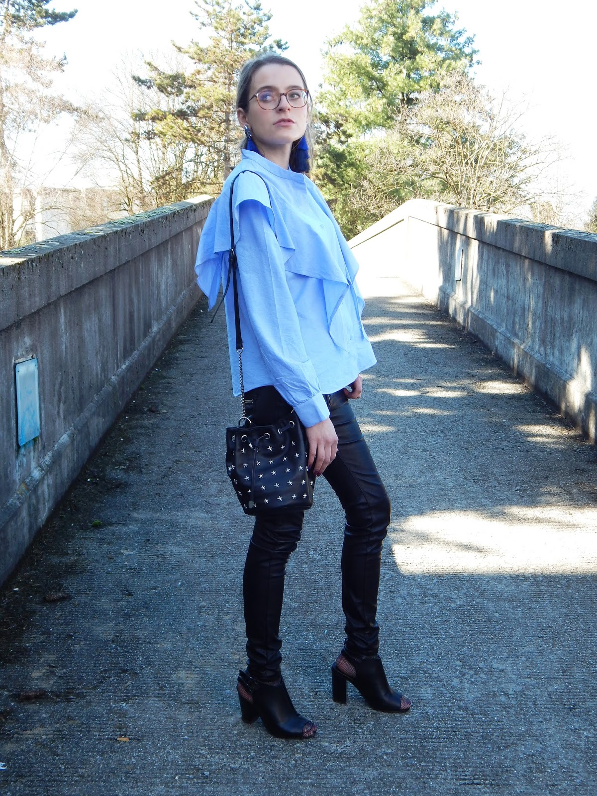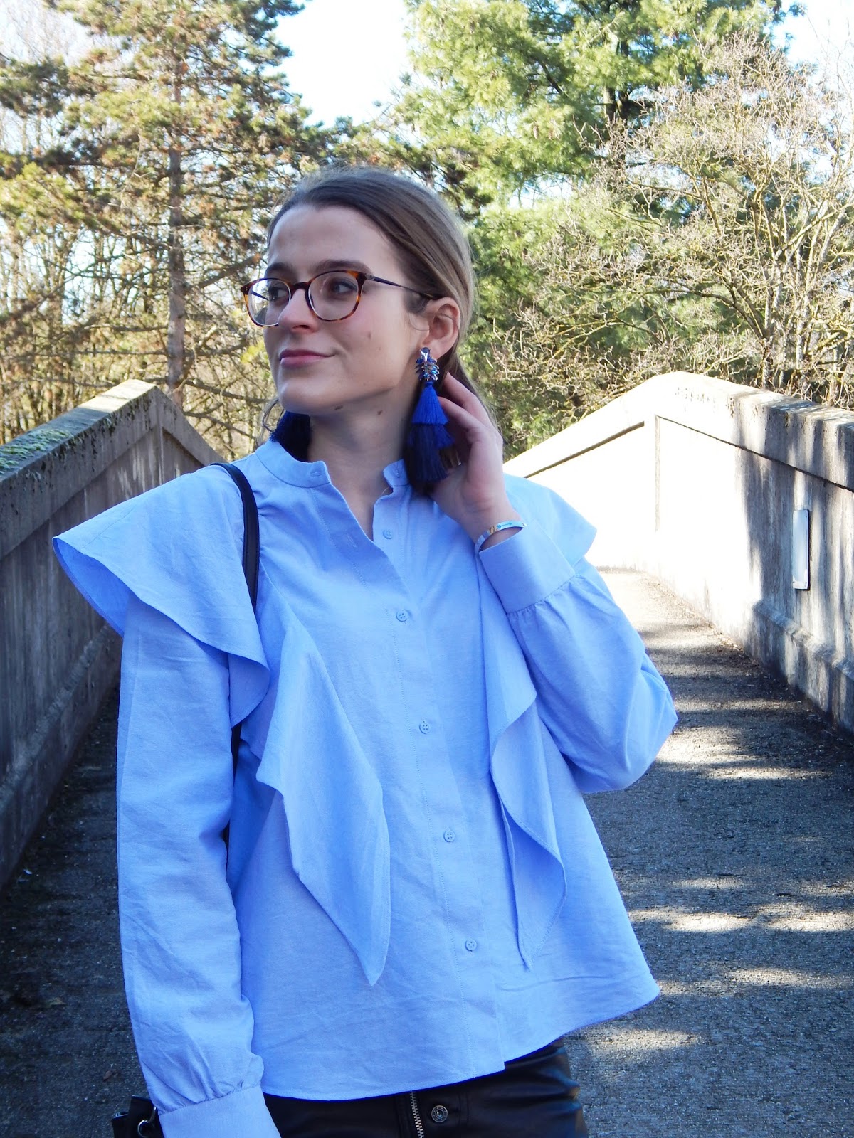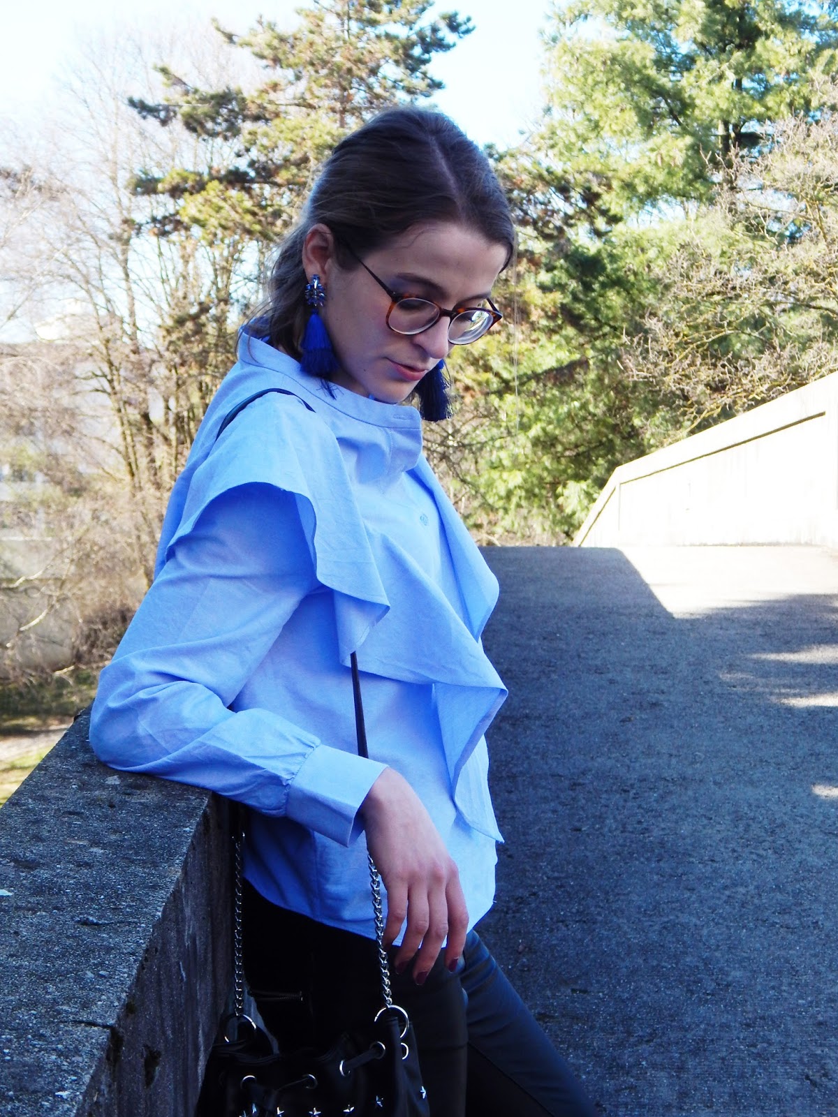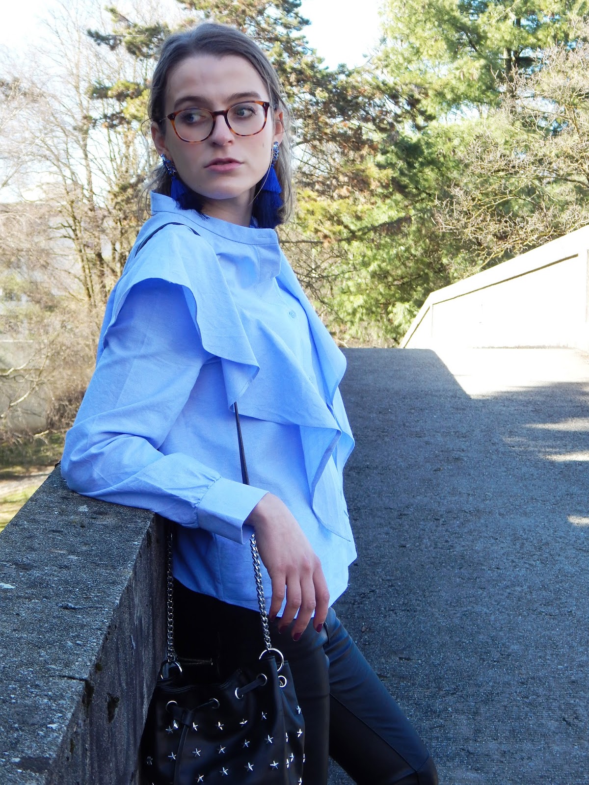 Une tenue avec des mélanges de style que j’ai volontairement souhaitée. En effet, cette chemise à froufrous & Other stories que je vous montrais dans ma vidéo Haul, est assez particulière et peut vite faire mémère. C’est pour ça que j’ai pensé à mon pantalon en similicuir pour aller avec, pour complètement casser ce côté. Je suis plutôt pas mal satisfaite du résultat. J’y ai ajouté ma nouvelle paire de boucles d’oreilles fantaisie de chez Stradivarius. J’ai fait une grosse razzia chez eux dernièrement niveau accessoires, et elles apportent vraiment LE truc en plus. Mes nouvelles petites chaussettes en genre de résille, mes bottines ajourées et voilà!