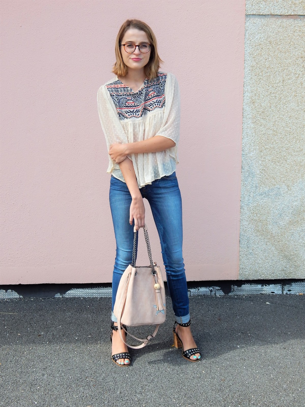 Blouse: Mango; Sac/Bag: Mandoline; Jean: Guess; Sandales/Sandals: New Look