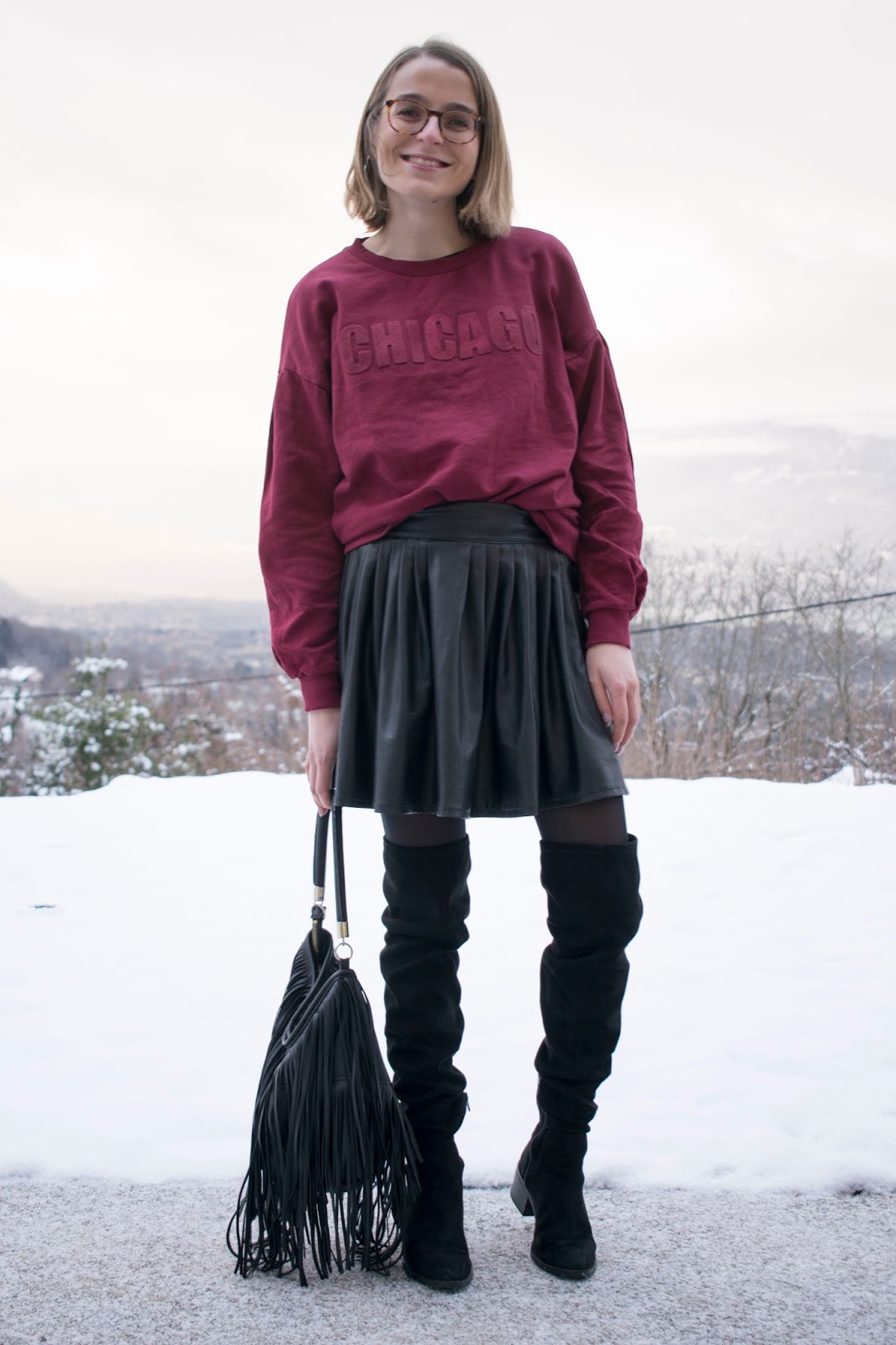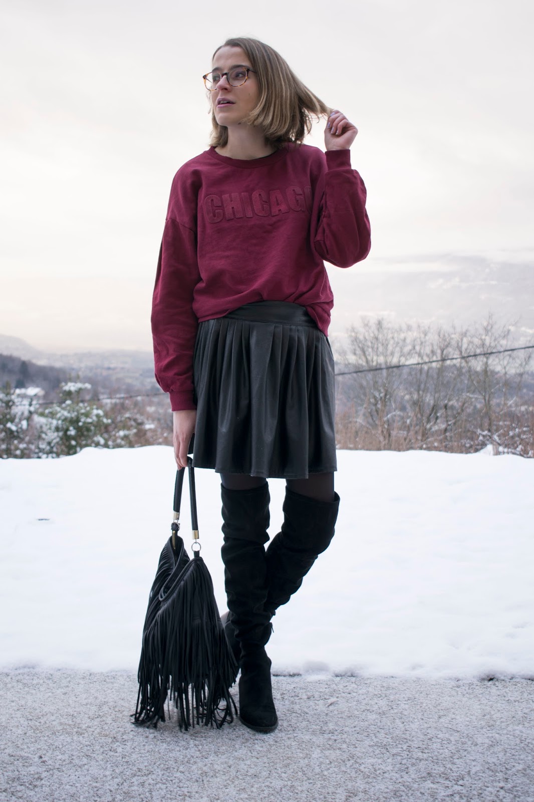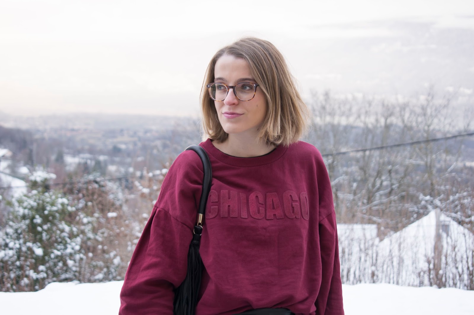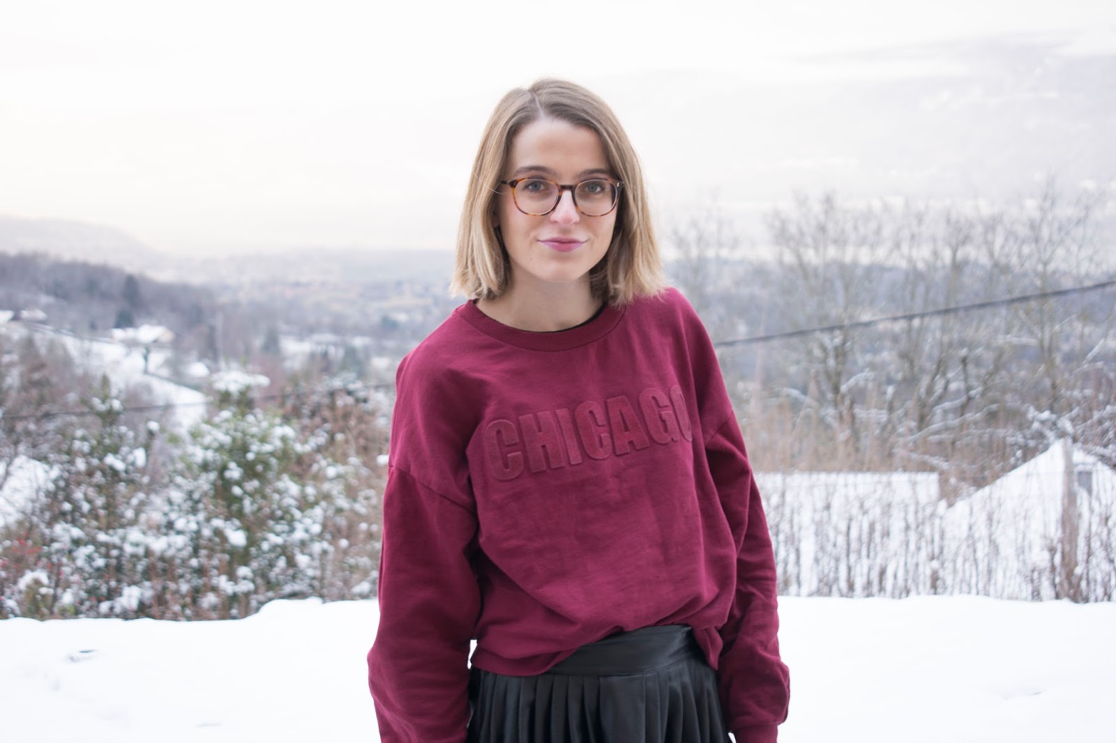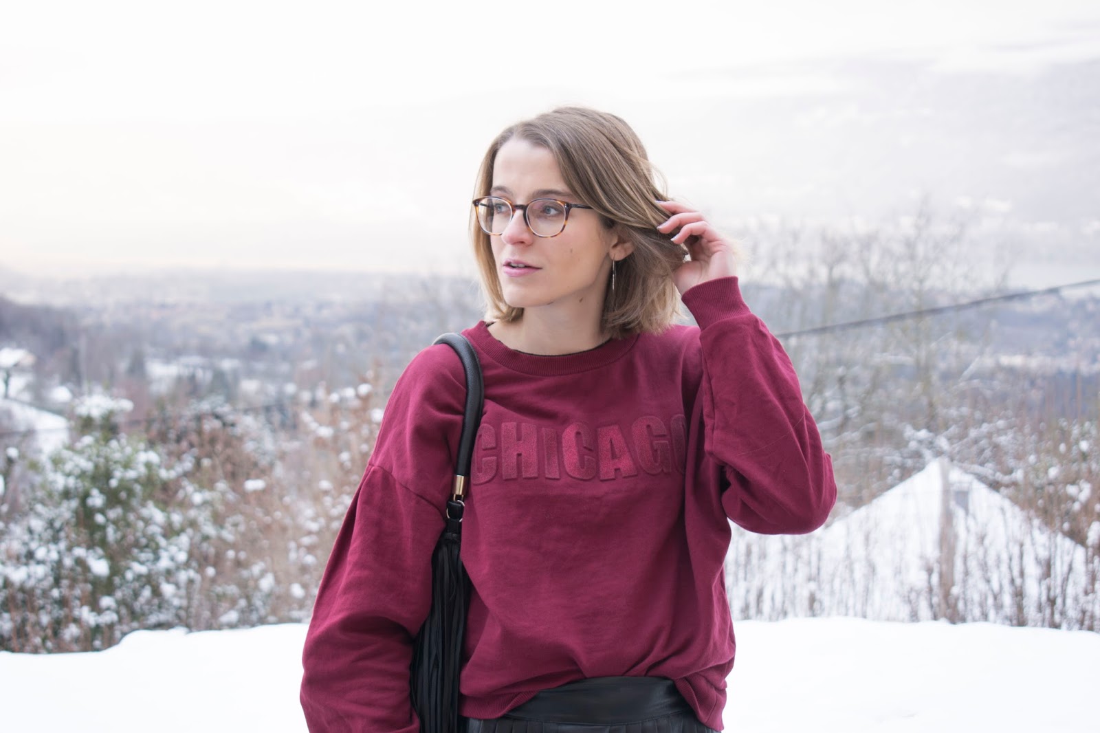 On se retrouve avec le tout premier look de 2018!  Shooté avec un Reflex, d’ailleurs j’aimerais beaucoup changer d’appareil photo pour en prendre un similaire à celui-ci. Premier look également avec la neige en background, et ce jour-là il faisait un froid de malade. D’ailleurs ça a été vraiment compliqué d’enlever ma veste… Je porte donc ma fausse fourrure, obligatoire ce jour-là, avec mon sweat Chicago acheté dans un Mango de Barcelone que je portais dans ma dernière vidéo séries