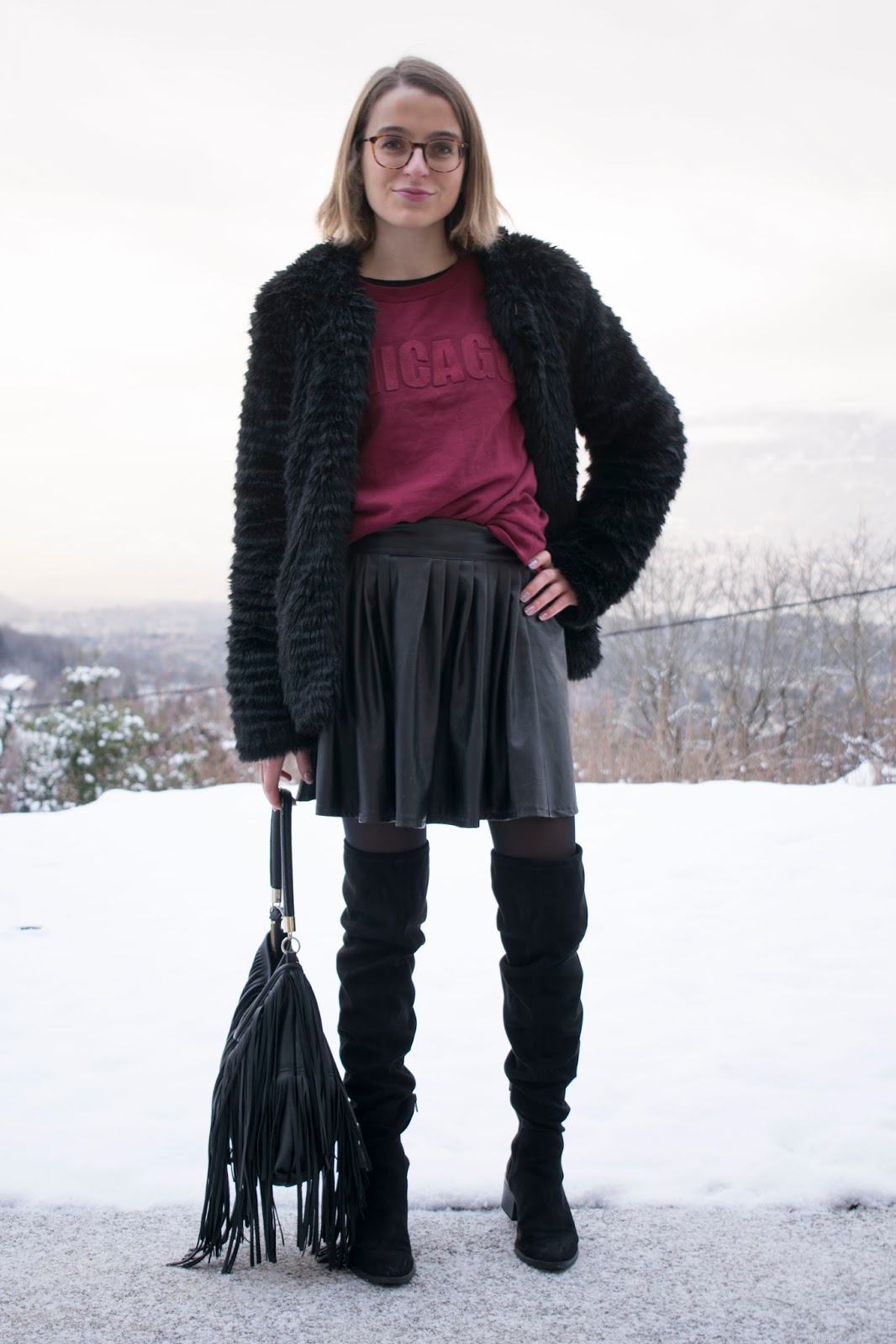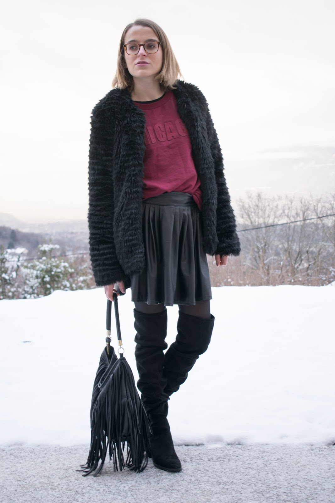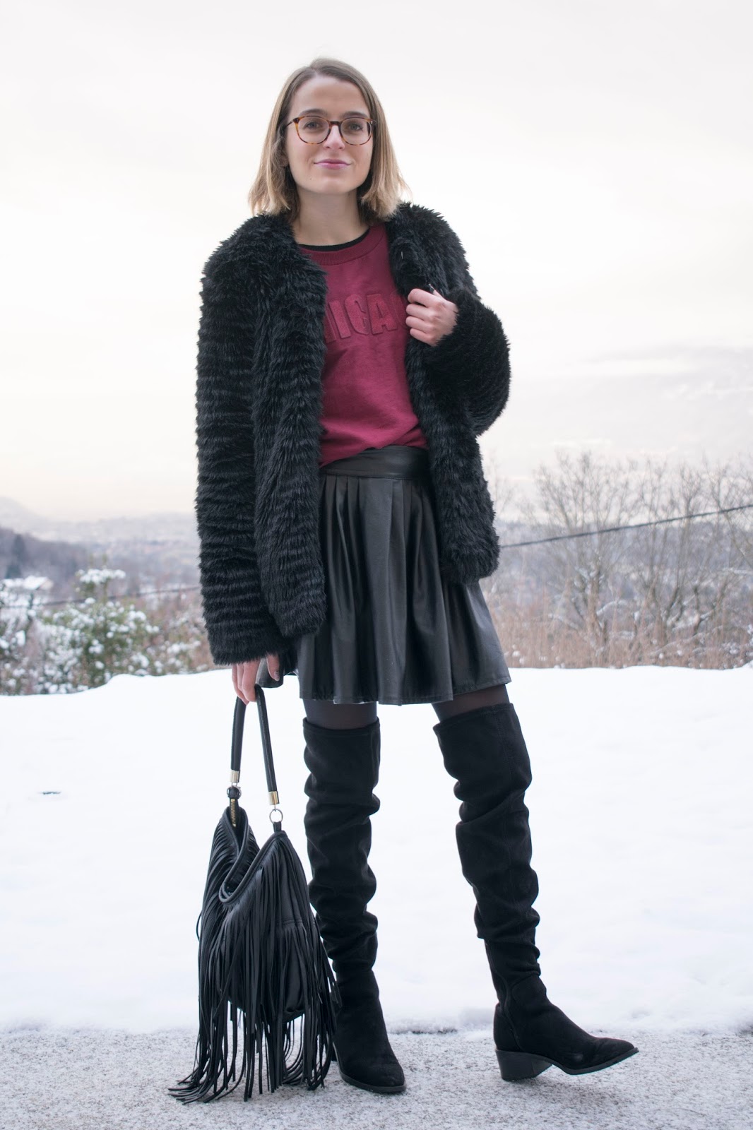 Veste/Faux fur: Pimkie; Sweat: Mango; Jupe/Skirt: Hearts&Bows sur Asos; Sac/Purse: H&M; Cuissardes/Boots: Stradivarius