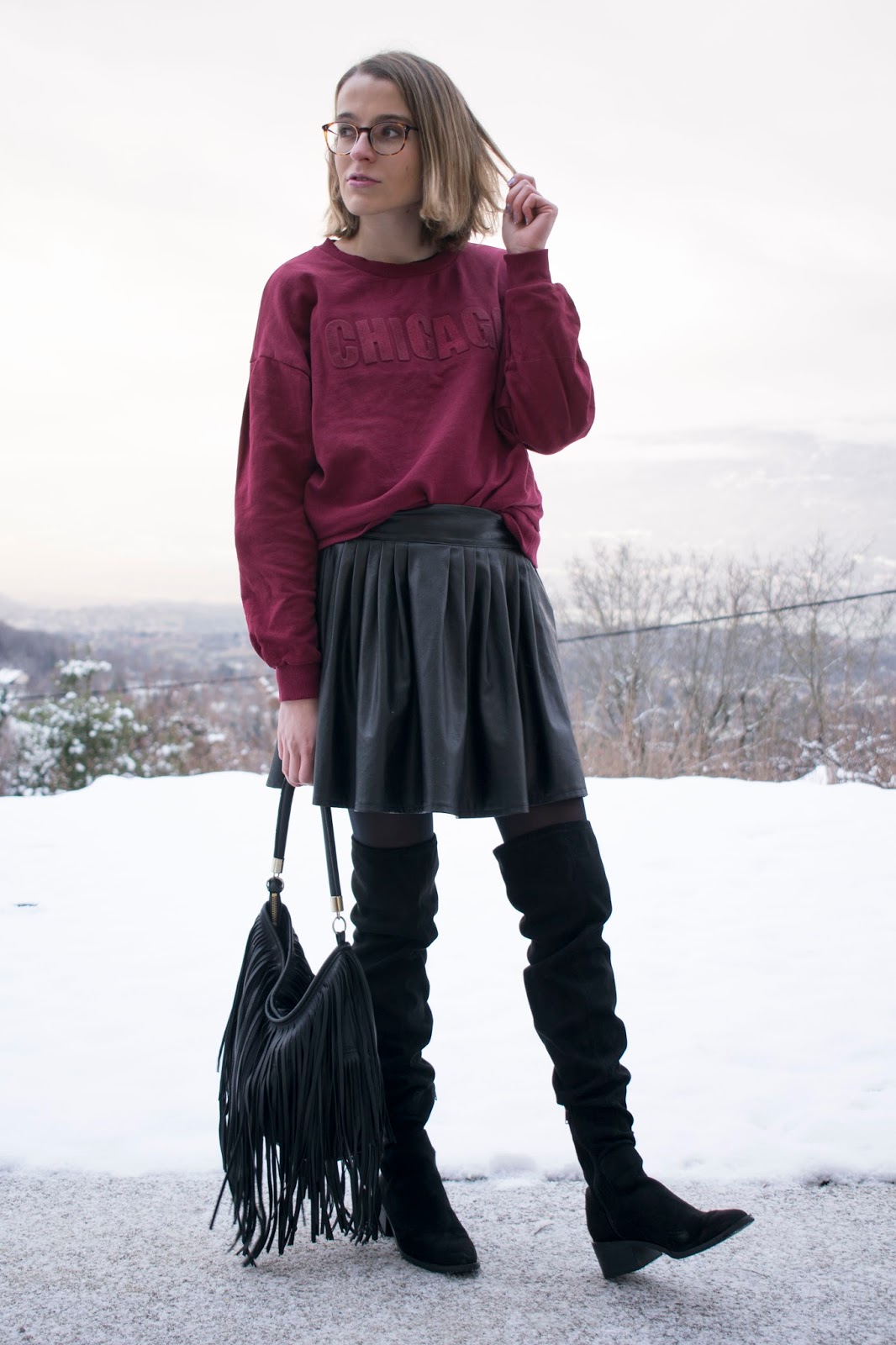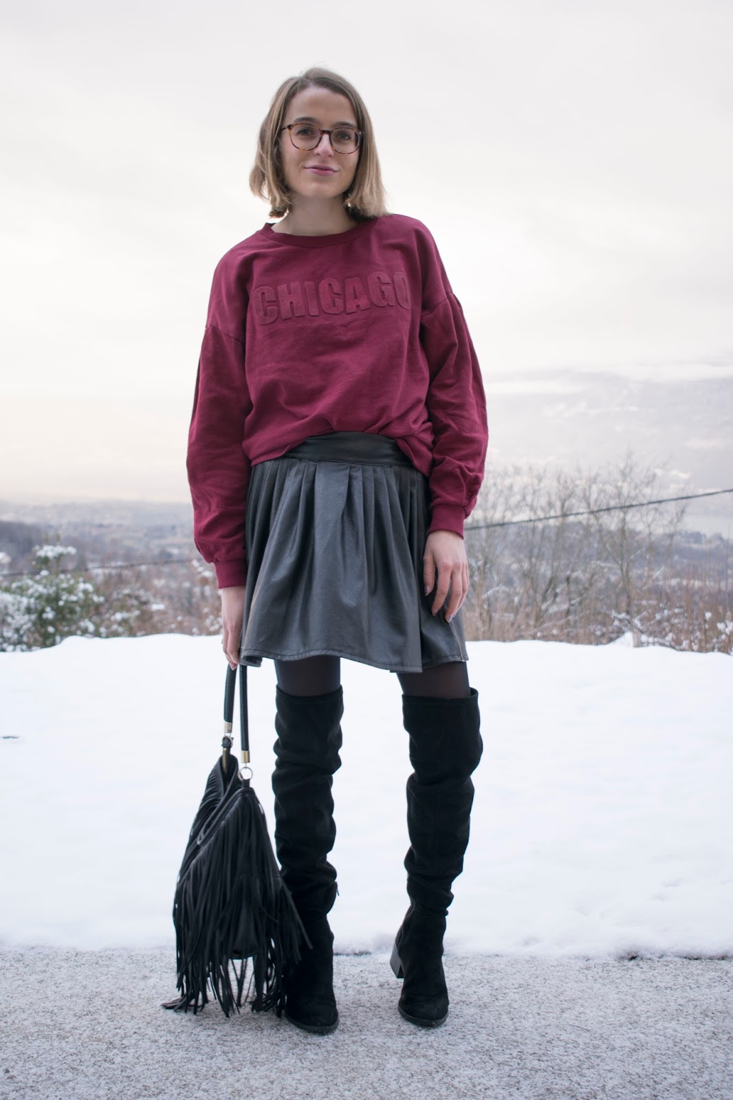 première fois que je le porte sur le blog. Je l’ai associé à une jupe, association que j’aime beaucoup. le fait de mixer sweat et pièce féminine qu’est la jupe, je trouve ça bien cool. Avec, je porte mes cuissardes qui comme je vous le conseillais dans ma vidéo de mes indispensables à avoir cet hiver.