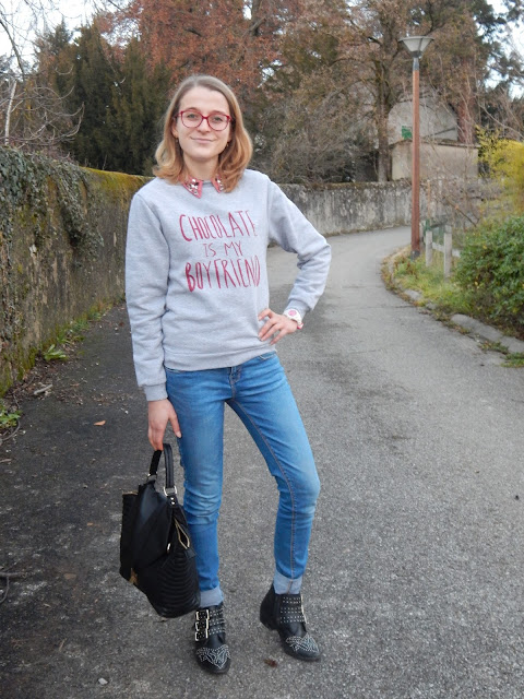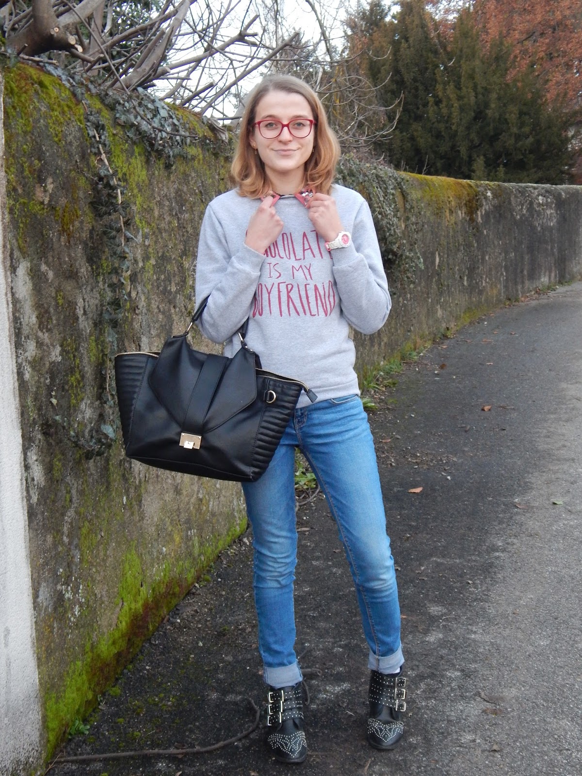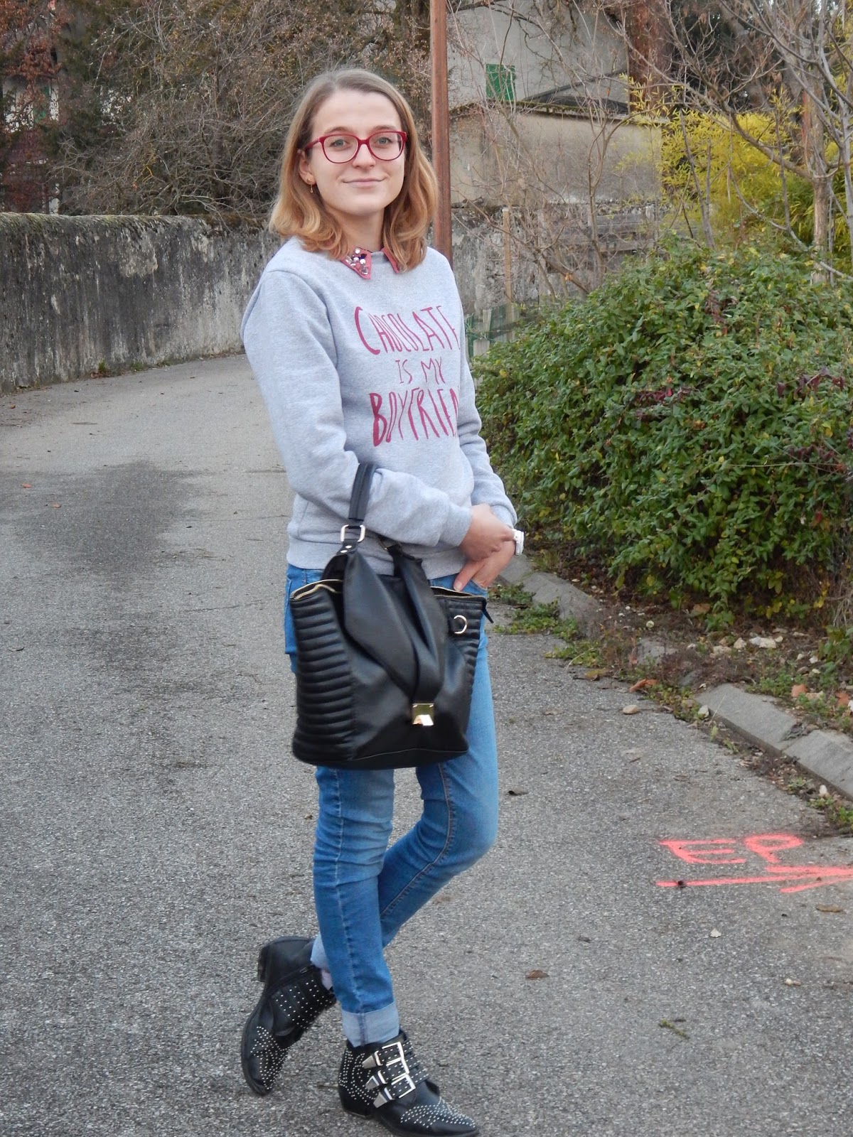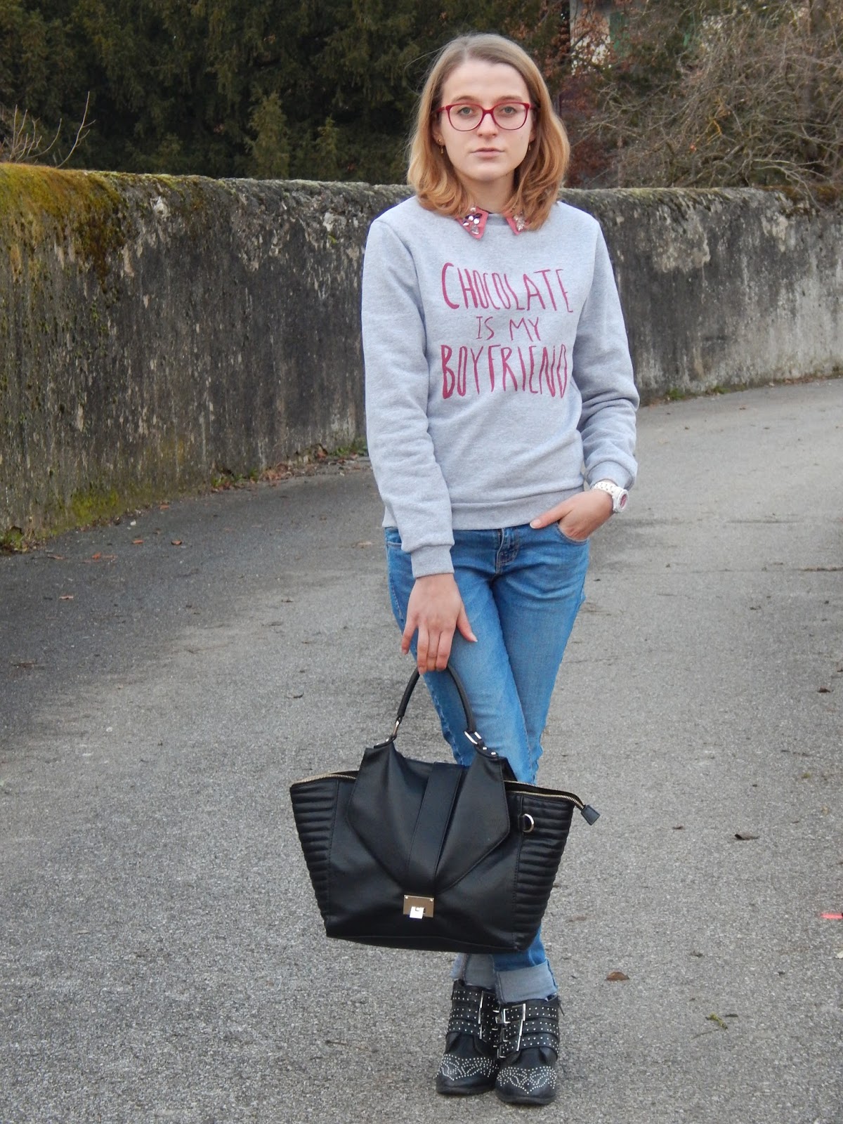 Sweat: RAD( vous pouvez le trouver ici); Chemise/Shirt: Bershka; Jean: Zara; Sac/Bag: Pimkie; Bottines/Booties: MOA
