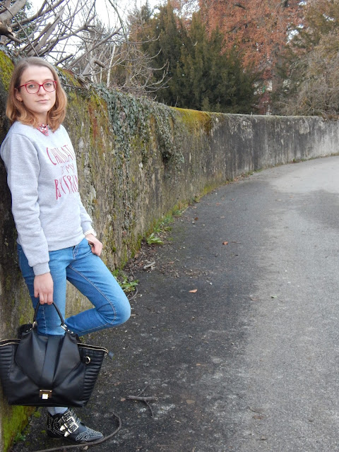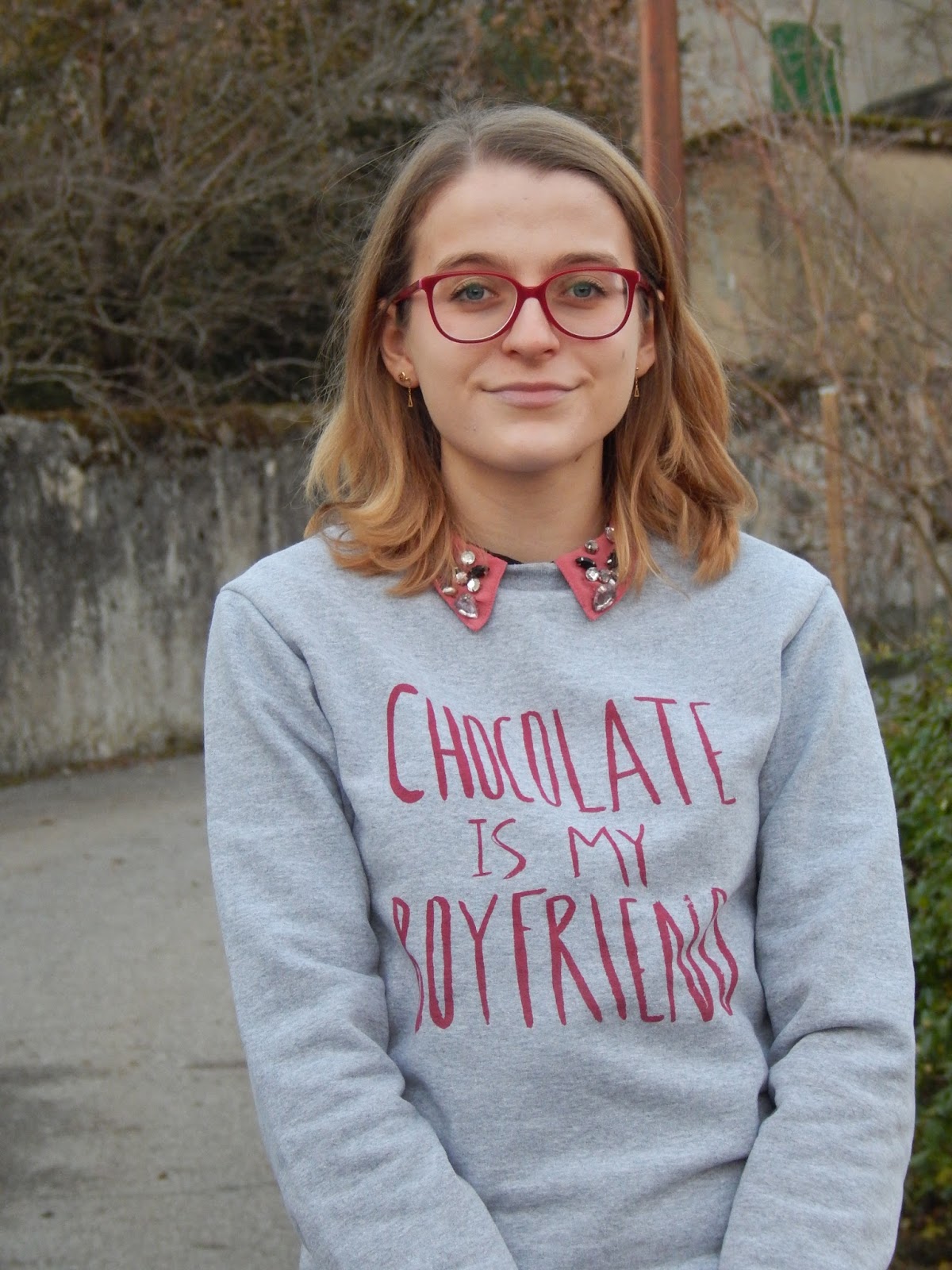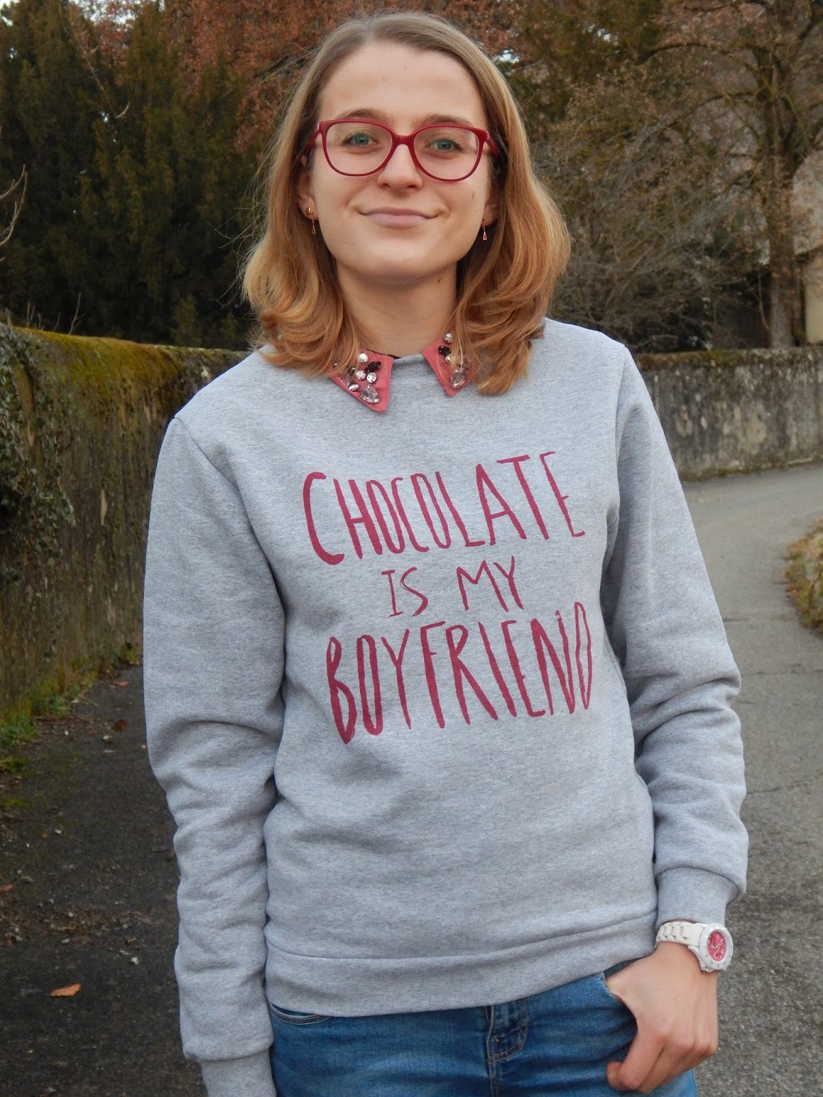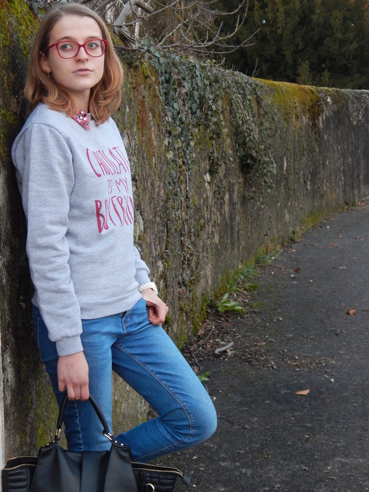 D’ailleurs si vous voulez commander sur RAD et que vous êtes faite un peu comme moi et que vous faites habituellement du S, je vous conseille de prendre vos sweats en XS, ils taillent assez grands. En dessous, j’ai glissé ma chemise fine Bershka, que je n’avais pas ressortie depuis un moment, mais le col se mariait plutôt bien avec la couleur de l’inscription, j’aime du coup beaucoup cette association. Mon jean Zara, mes Susanna like Moa aux pieds qui font un bruit de grelots à chaque fois que je marche ( merci le petit caillou pourri qui s’est fichu dans ma semelle que je n’arrive pas à enlever…)