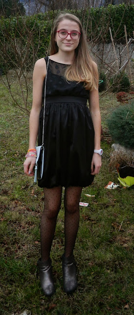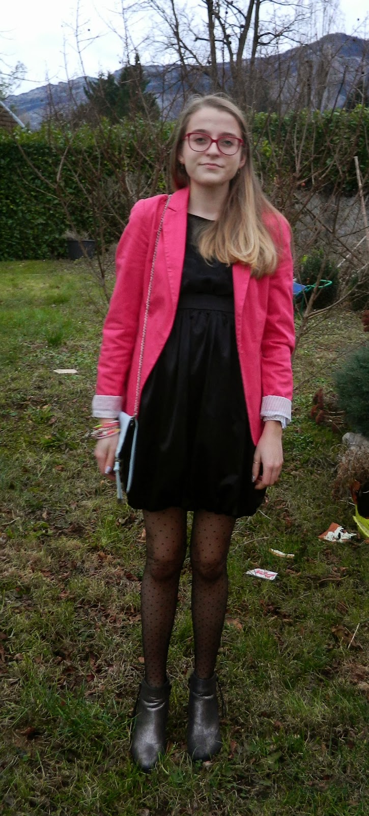 Aujourd’hui, comme promis je vous montre ma seconde tenue de Noel. J’avais envie de ressortir ma robe Pimkie achetées il y a quelques années. Je me souviens, je l’avais repérée en vitrine, mais plus ma taille en magasin. La dernière étant sur le mannequin: opération dépoilage de mannequin et la robe est super. J’ai du la mettre deux fois( pas facile d’acheter une PRN festive). Etant donné la douceur qu’il faisait( pareil pour la veille, d’ailleurs avez-vous déjà vécu un Noel aussi doux?). Chez nous il faisait plus de 10 degrés. Dingue. Du coup sortir ces fins collants plumetis était une bonne idée avec mes bottines argentées, et mon blazer fushia pour la touche de couleur.