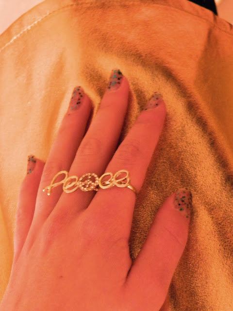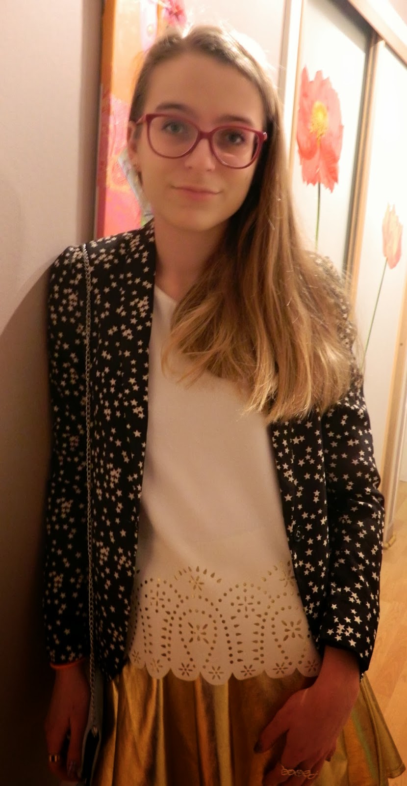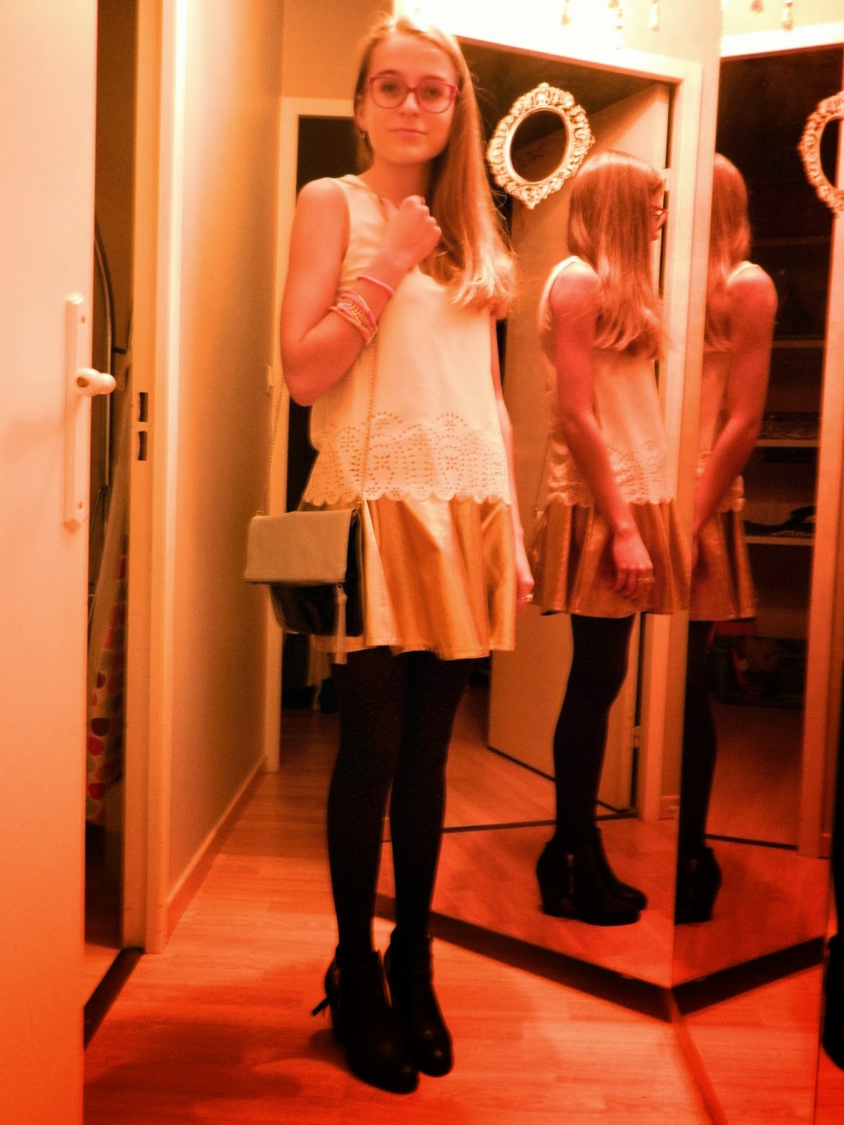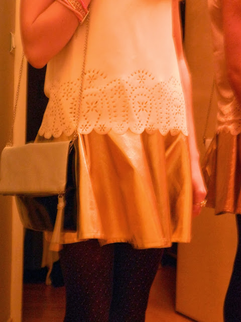 Voici ma tenue shootée hier soir pour le réveillon. Ma jupe dorée vue à la Jennyfer Shopping Party, mon nouveau haut blanc découpé dans le bas, des collants en accord avec la jupe. Pour terminer le tout, des nouveaux collants noirs à plumetis dorés Pimkie, mes bottines noires, ma veste étoilée, et mon sac pochette. En bijoux, ma fidèle manchette rose, un de mes anneaux dorés H&M et ma double bague Peace. Une tenue sobre mais avec quelques touches de gold. J’espère que ça vous plaira.