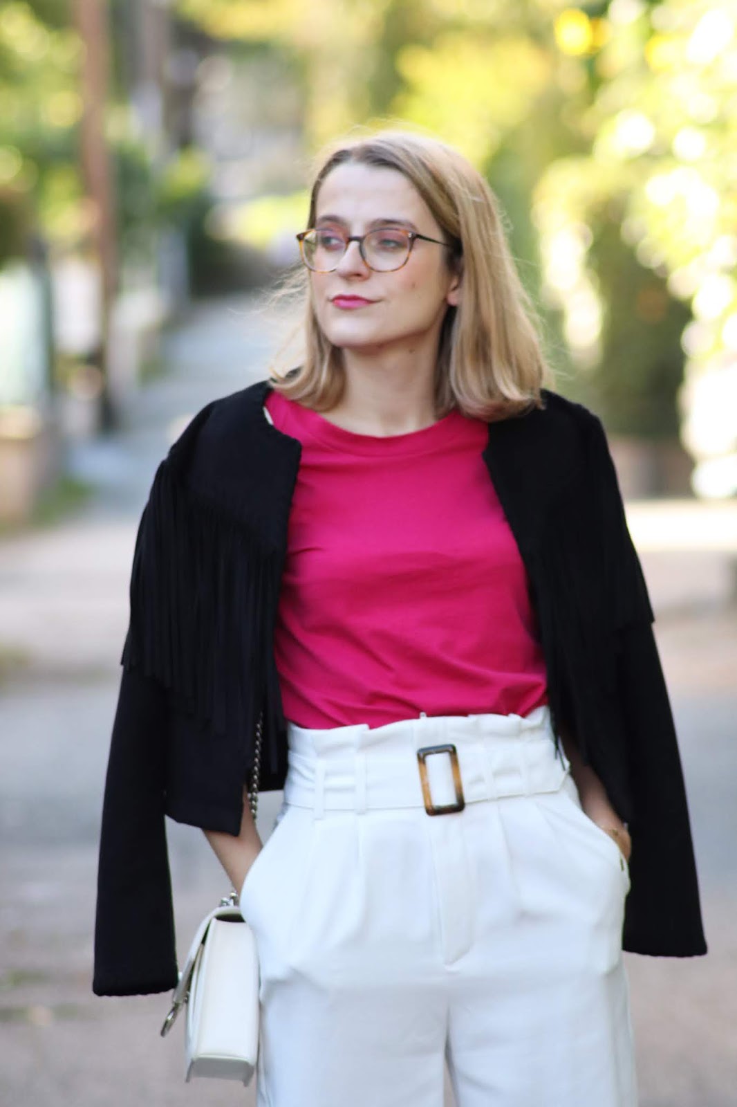 Il n’a rien de particulier, mais j’aime beaucoup sa coupe et sa couleur. Il se froisse assez facilement mais bon… Ma petite veste frangée Stradivarius encore et le look est terminé. Vous en dites quoi?