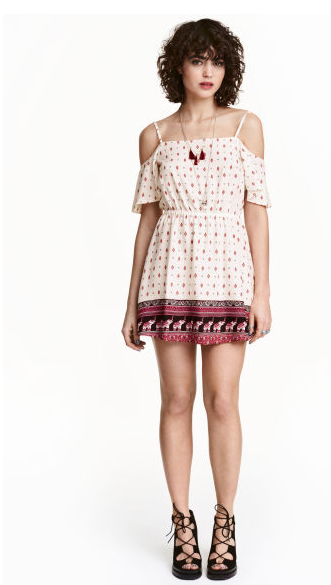Robe épaules dénudées, 15€. J’adore la légèreté et l’imprimé de cette robe totalement dans l’esprit festivalier, même si on voit plus souvent des associations: haut et short que des robes.