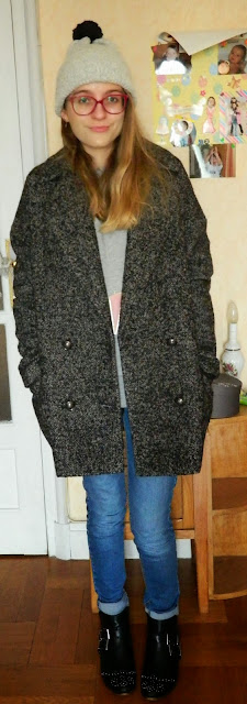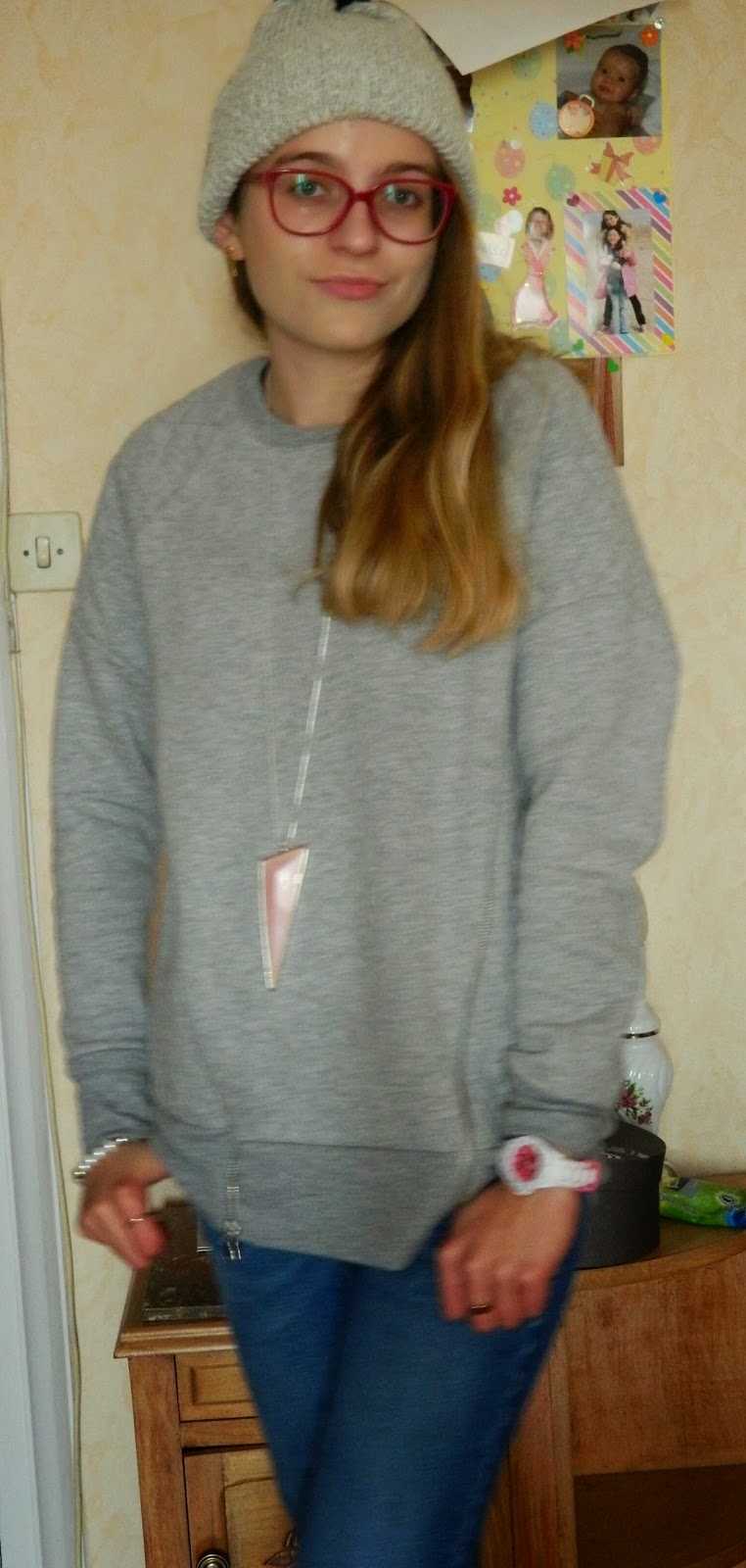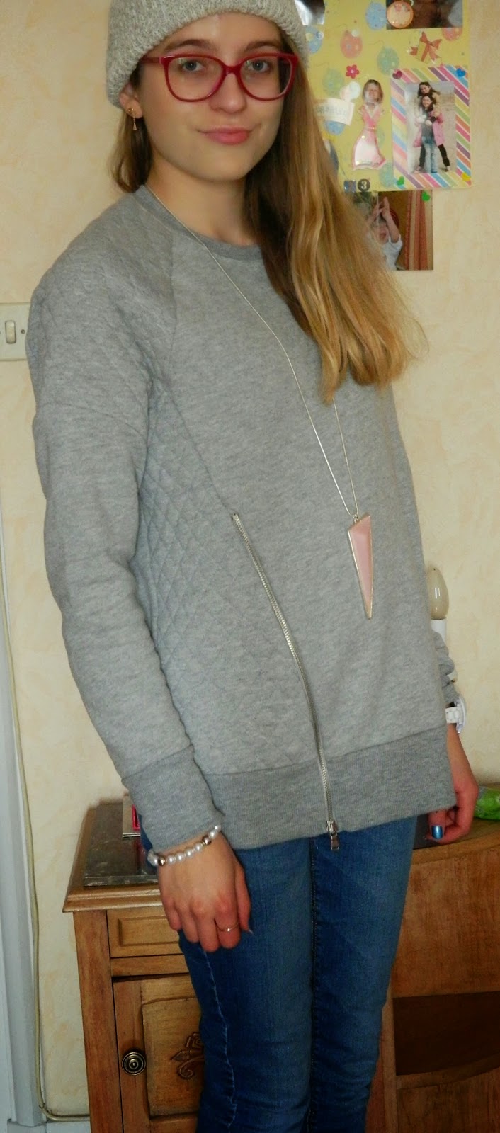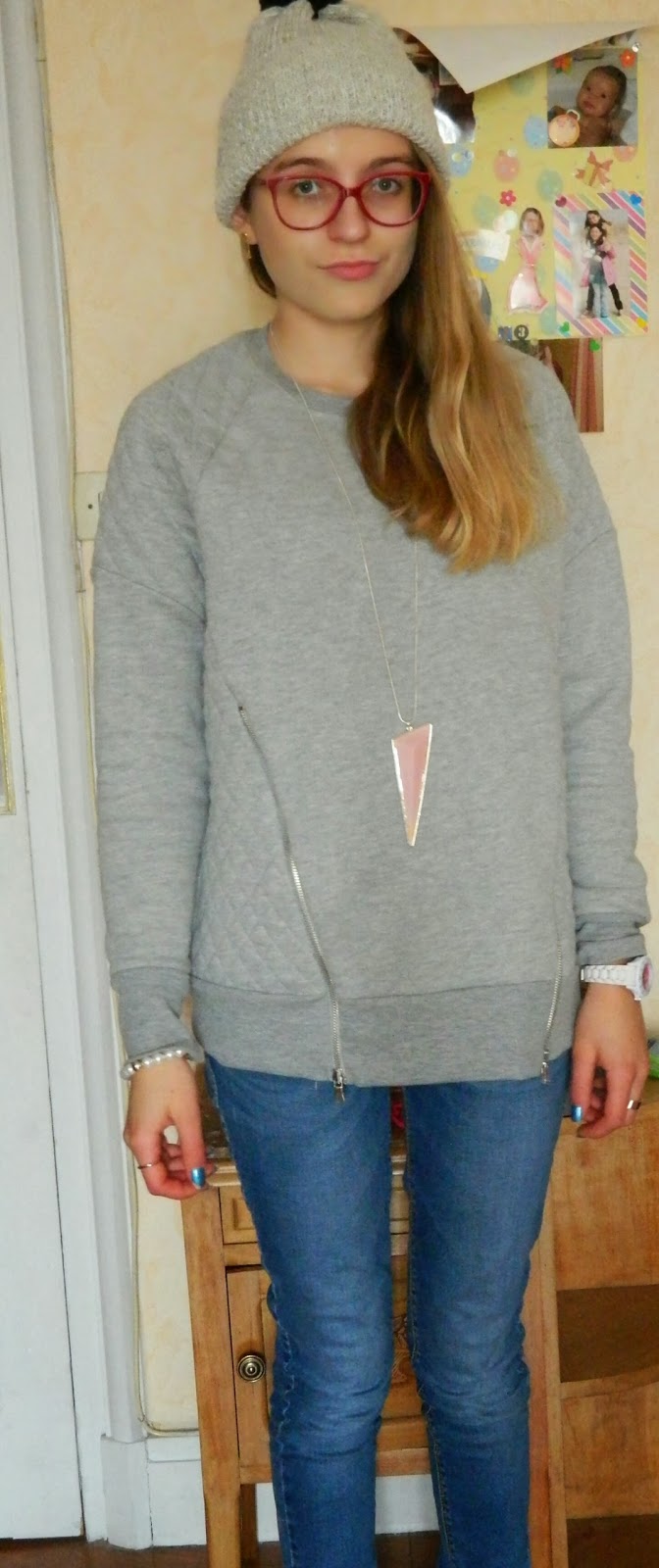 La collection Camille over the rainbow n’a échappé à personne, moi y comprise. On a beaucoup vu notamment l’ensemble matelassé kaki, mais je n’étais pas convaincue. Par contre, bien plus par le joli sweat zippé. Plusieurs teintes de gris dans cette tenue, teinte dont j’étais sûre pendant quelques temps qu’elle ne m’allait pas. A vous de me dire. En bas, un simple jean acheté chez Zara le mois dernier il me semble. On n’a jamais trop de jean, même pour moi qui n’est pas une inconditionnelle des jeans. Celui-ci avait la bonne couleur, forme et prix: 25€.