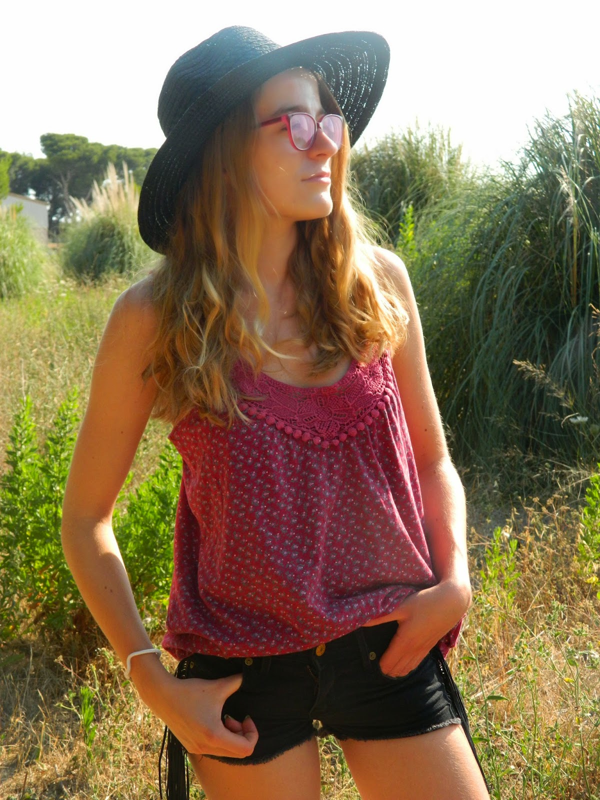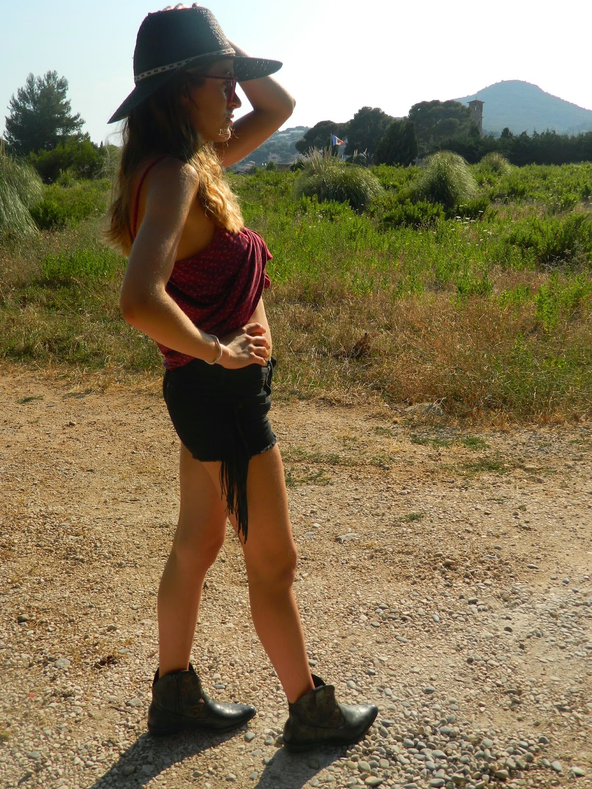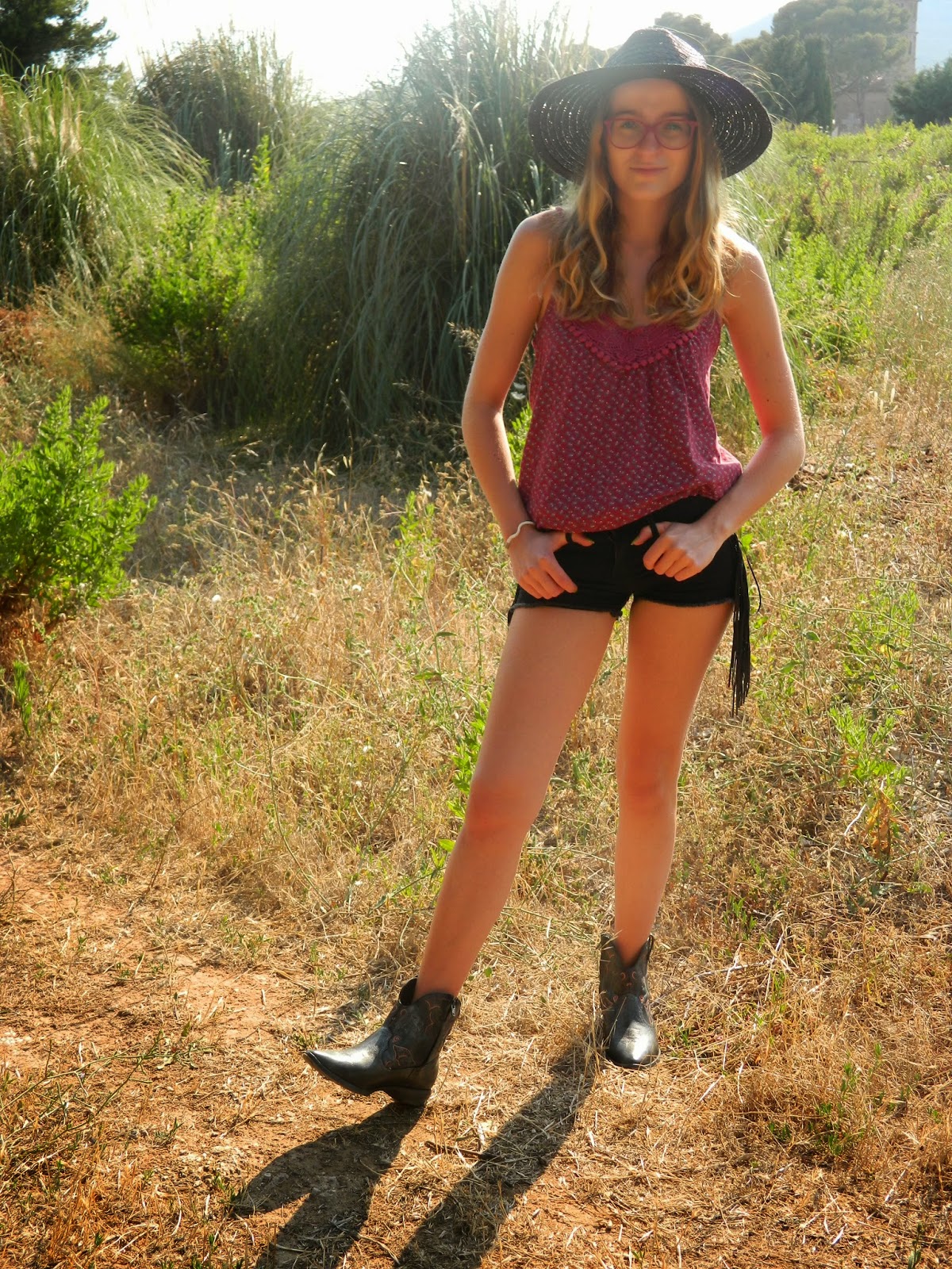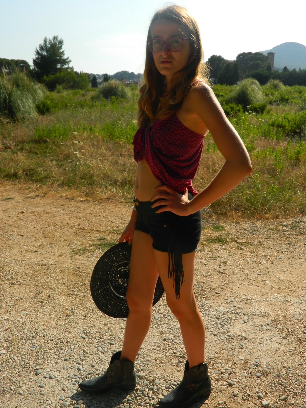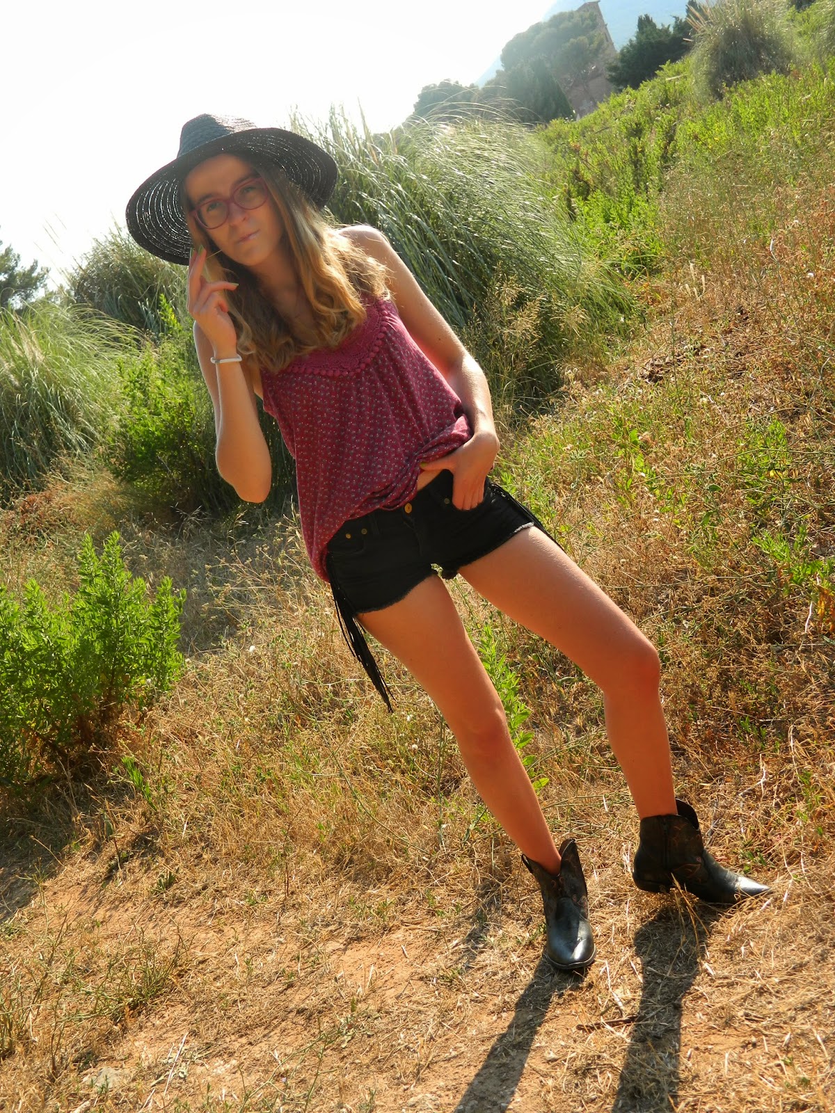 Ce jour-là, j’ai mis mon short frangé et mon haut Pimkie. Je portais mes nouvelles santiags que vous avez pu voir dans mon New Stuff  afin de les faire. Et puis j’ai eu l’idée d’un shooting. J’ai pris mon chapeau, que vous avez déjà vu dans mon article Back to the 70’s et on s’est bien amusé.