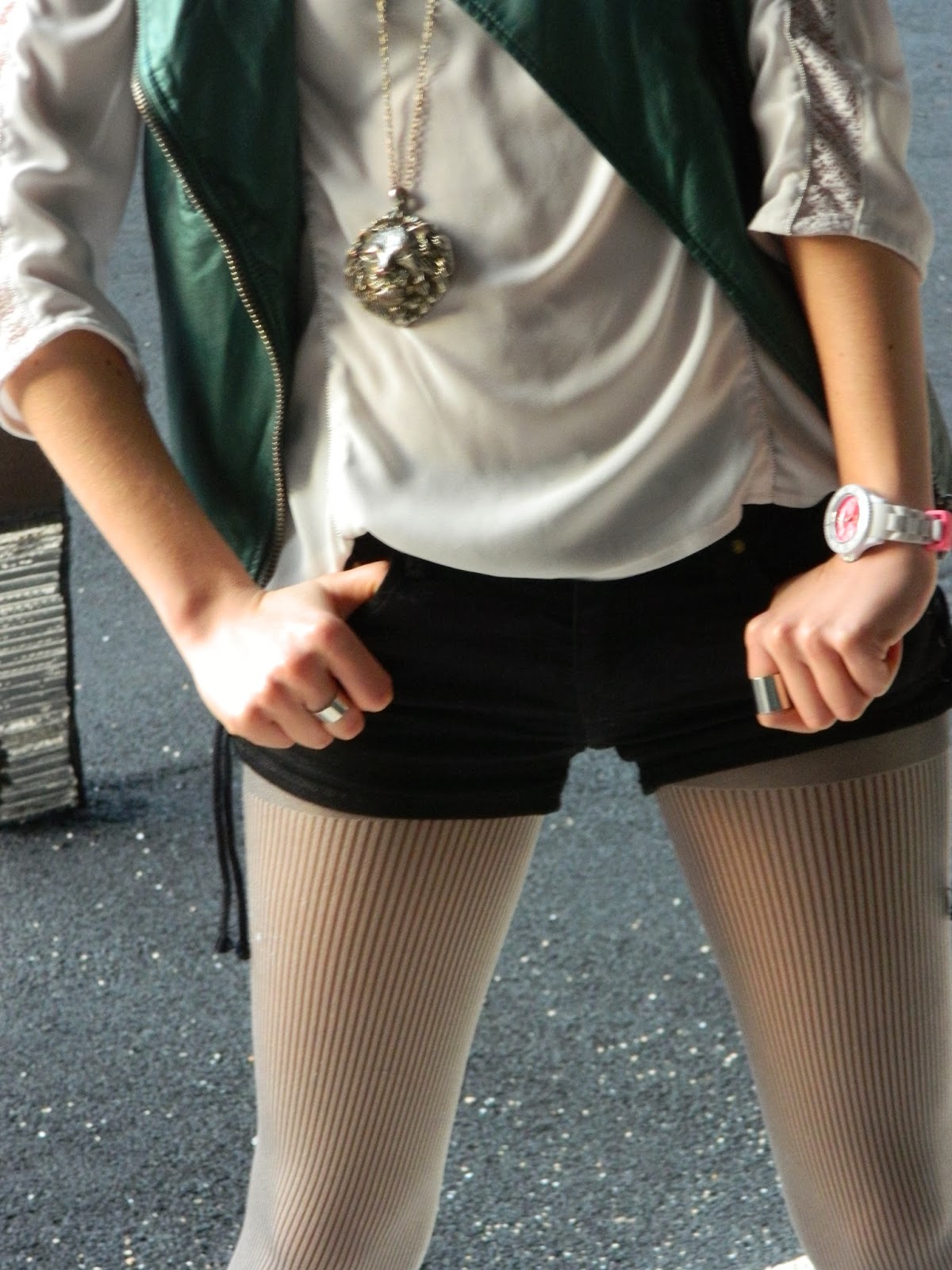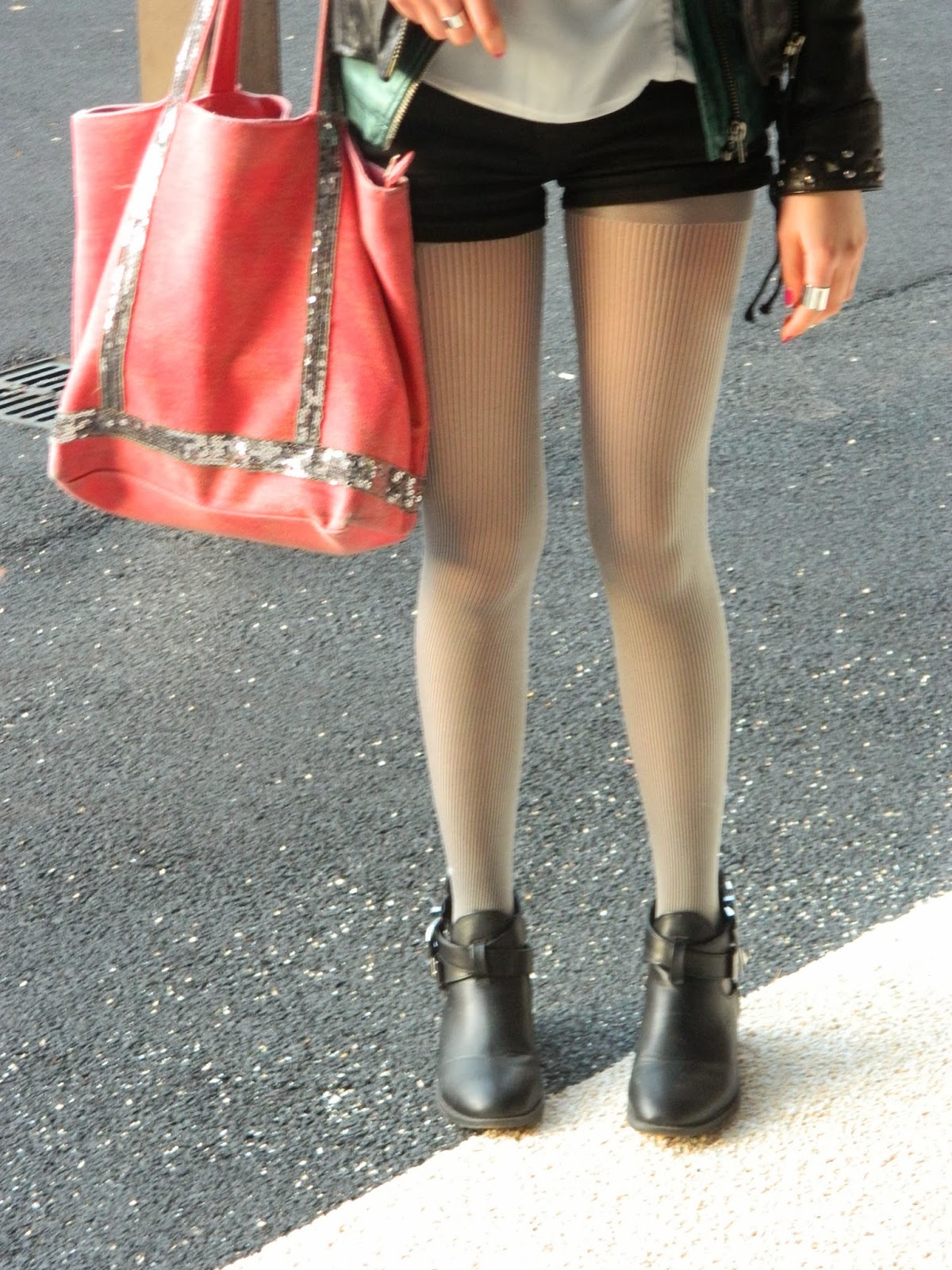 Un look assez découverte dimanche dernier. Le premier jour où j’ai pris la voiture toute seule. C’était bizarre mais cool. Un short. Parce que j’adore les shorts, vous n’êtes pas sans le savoir. Une paire de collants rayés de ma mère, étant en manque de collants normaux soit: noirs, marron et gris. J’avais envie de mettre ma veste métallisée, donc du blanc était de rigueur. Piocher dans le placard de ma mère et en ressortir cette blouse. Mes anneaux roses, mes nouvelles bagues phalanges trouvées chez Tally Weijl sur lesquelles j’ai flashées. Je me suis bien habitué à avoir des bagues aux phalanges même si ce n’est pas toujours pratique: pour se moucher, pour conduire, pour écrire… Mon ancien sac Vanessa Bruno like que j’ai ressorti, ma fidèle veste en cuir et mes nouvelles cut out boots. J’avais beaucoup aimé cette tendance à la rentrée, mais jamais réussi à en trouver une paire. Chez Pimkie j’avais trouvé mon bonheur pour pas cher, mais plus ma pointure. J’ai capitulé et puis il y a deux semaines j’y retourne, et il y en avait, quasiment les mêmes. Avec un bon de réduction de 5€, je les ai donc payées 30.