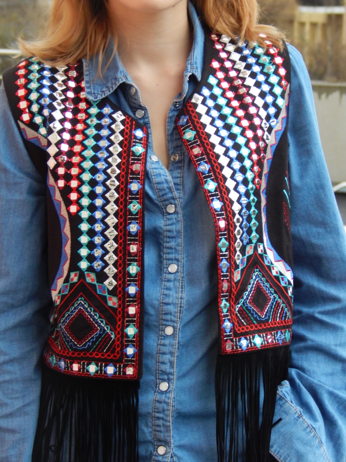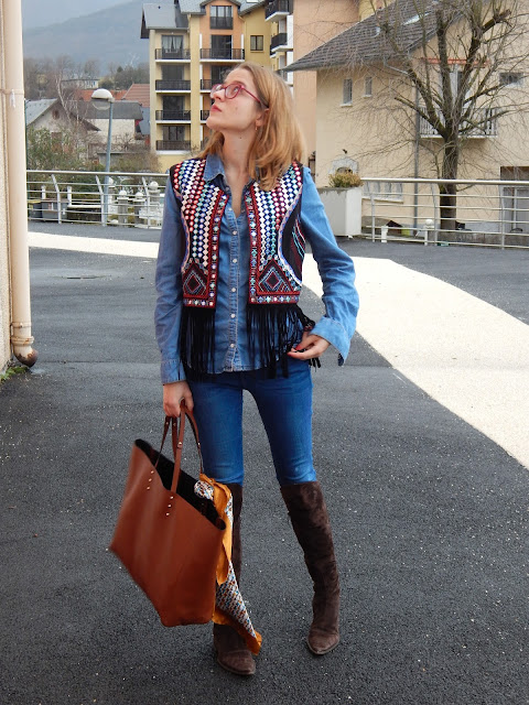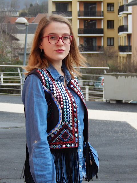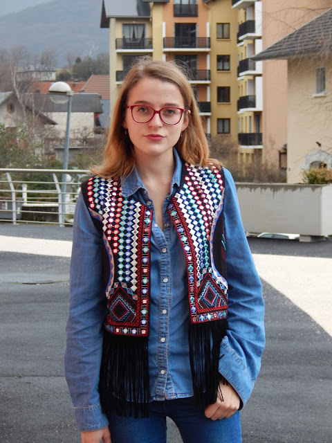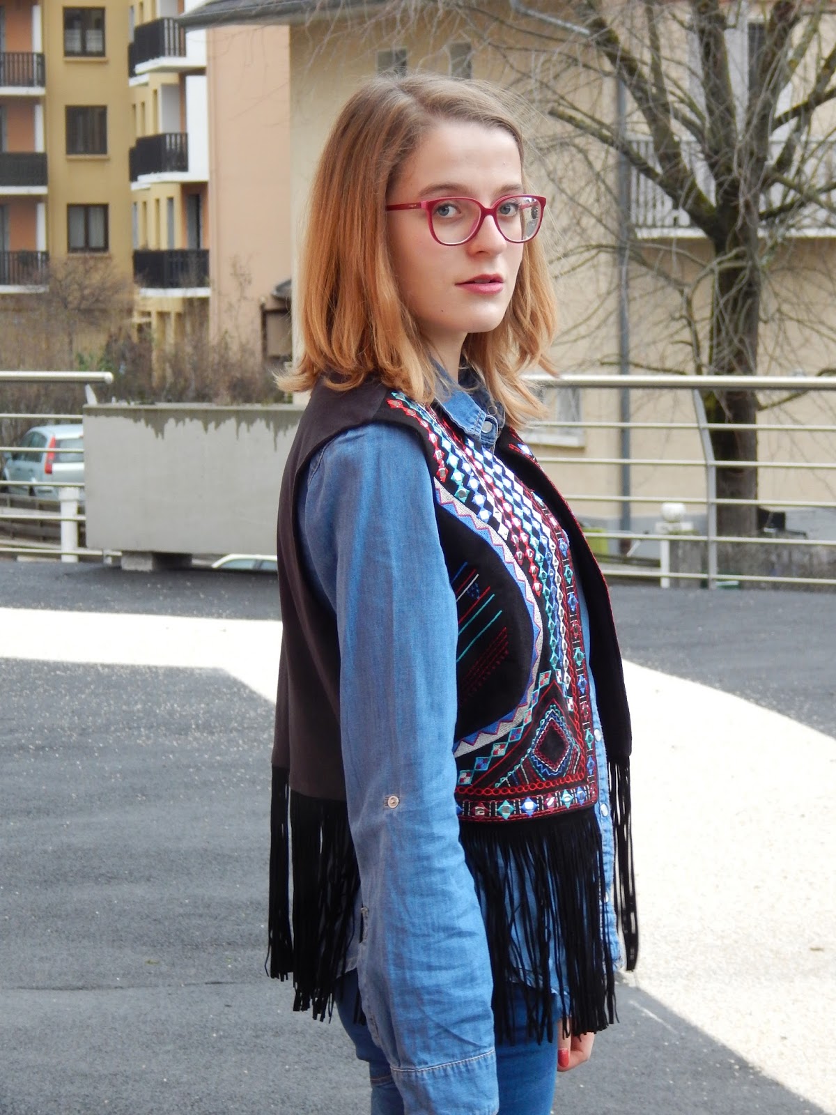 Ce jour-là j’ai choisi ma chemise en jean Pimkie que j’ai depuis plusieurs années, mon jean Zara, où j’ai d’ailleurs trouvé un trou le long de ma jambe… Pour relever un peu le tout, j’ai choisi de mettre ce petit gilet super magnifique shoppé chez Charly&Gaby, dont je voulais parler dans cet article. Je précise que je l’avais repéré en novembre dernier, vous pouvez le voir dans mon article, mais à cette époque il n’était pas soldé. Je l’ai eu en soldes, une fois où j’ai fait un tour à la boutique dire bonjour à Charlotte la responsable, et je l’ai eu en soldes. Je l’ai payé 42 au lieu de 105, donc rien à dire, et je précise que les marques que Charlotte vend, sont pour la plupart made in France. Certes c’est plus cher, mais les pièces sont superbes et la qualité est là, mon gilet est aussi fabriqué en France 🙂