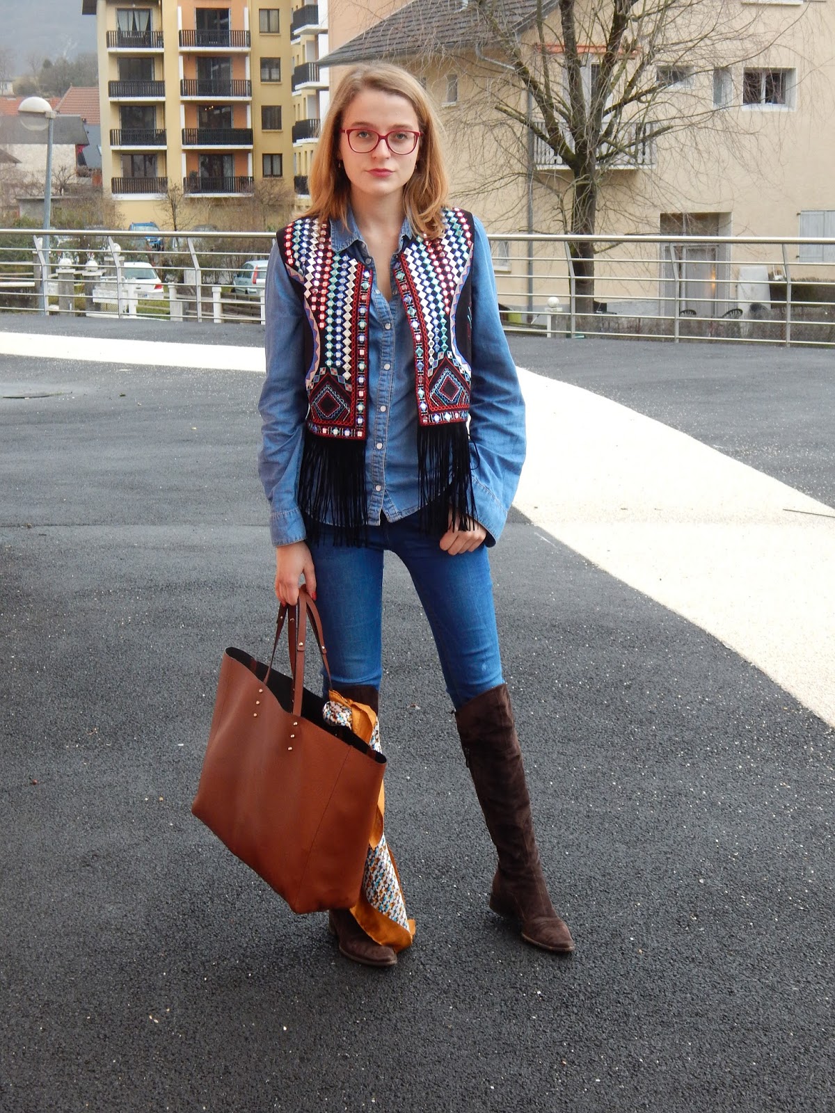 Habituellement, je mets ce genre de gilets sans manches sur un haut, mais sur une chemise je trouvais que ça changeait un peu et j’aimais bien. Pour finir, quelques touches de marron avec mon manteau en laine que vous avez déjà vu à plusieurs reprises et que j’aime tellement, mes cuissardes, déjà vues aussi ainsi que ce sac cabas qui ne me quitte plus, auquel j’ai ajouté mon foulard que j’adore.