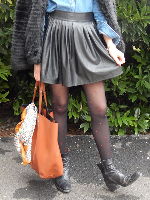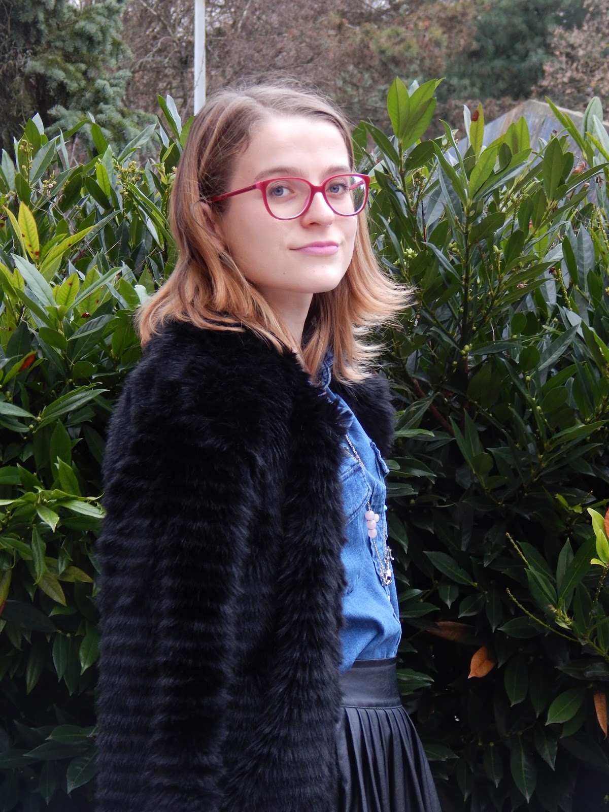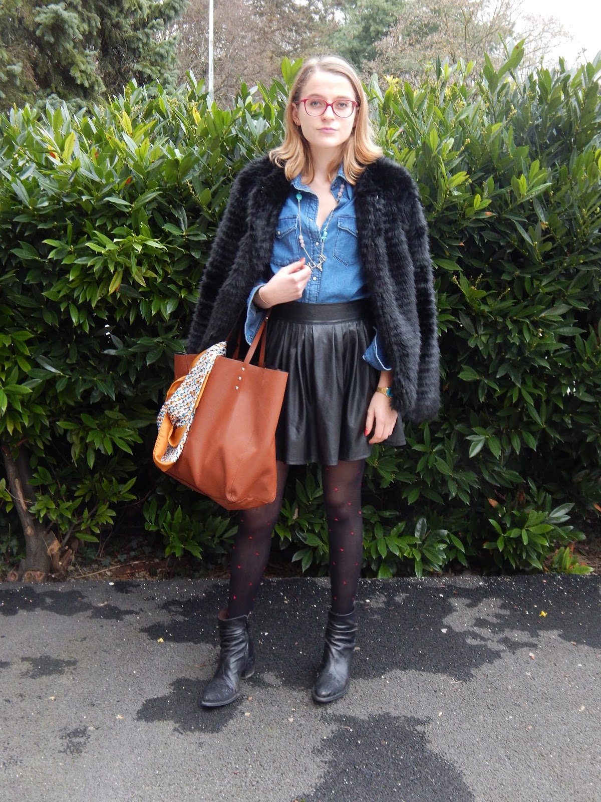 En dessus j’ai pensé à mon faux fur noir, des bottines noires, et afin de mettre un peu de couleurs dans tout ça, mes collants à imprimés coeurs. Le résultat final m’avait bien plu, une touche sophistiquée tout en étant confortable. Une autre manière de marier les chemises en jean, qui après avec un jean pour un total look denim, j’ai tenté avec une jupe. Vous préférez comment?