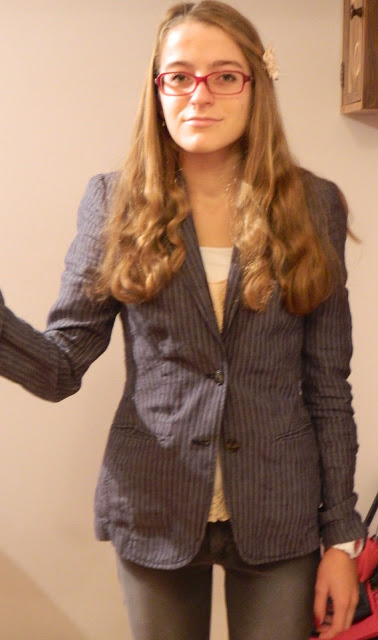 Salut salut!! Je vais vous montrer une tenue qui date. D’il y a deux mois. Je l’avais postée sur mon ancien blog, et je l’aimais bien. Du coup je vous la remets. Je l’aime beaucoup de par le haut en dentelle que j’ai piqué à ma mère, qui a une couleur super jolie, avec les détails en dentelle et une matière très légère comme de la soie. La veste, on l’avait repérée ce printemps sur la campagne Esprit avec Gisele Bundchen. Je n’étais pas trop fan d’Esprit, mais l’ensemble veste+short que Gisele portait était super. Du coup on s’y est rendu et la veste y était mais il n’y avait pas ma taille pour le short… On a donc pris seulement la veste et on se la partage. Je n’ai pas souvent l’occasion de la mettre parce qu’elle est assez difficile à associer mais je l’adore. J’ai mis mon jegging gris et des compensées ouvertes( c’était encore l’époque où on pouvait mettre des chaussures ouvertes, ce fut mon dernier look avec ce genre de chaussures). C’est le genre de chaussures que je peux mettre pour aller au lycée, mais ce ne sera jamais plus haut et surtout pas en escarpins. Sérieusement. Des escarpins pour aller au lycée? Bref. Pour rester dans les tons de rose, j’y ai ajouté ma petite fleur achetée par lot de trois cet automne.
