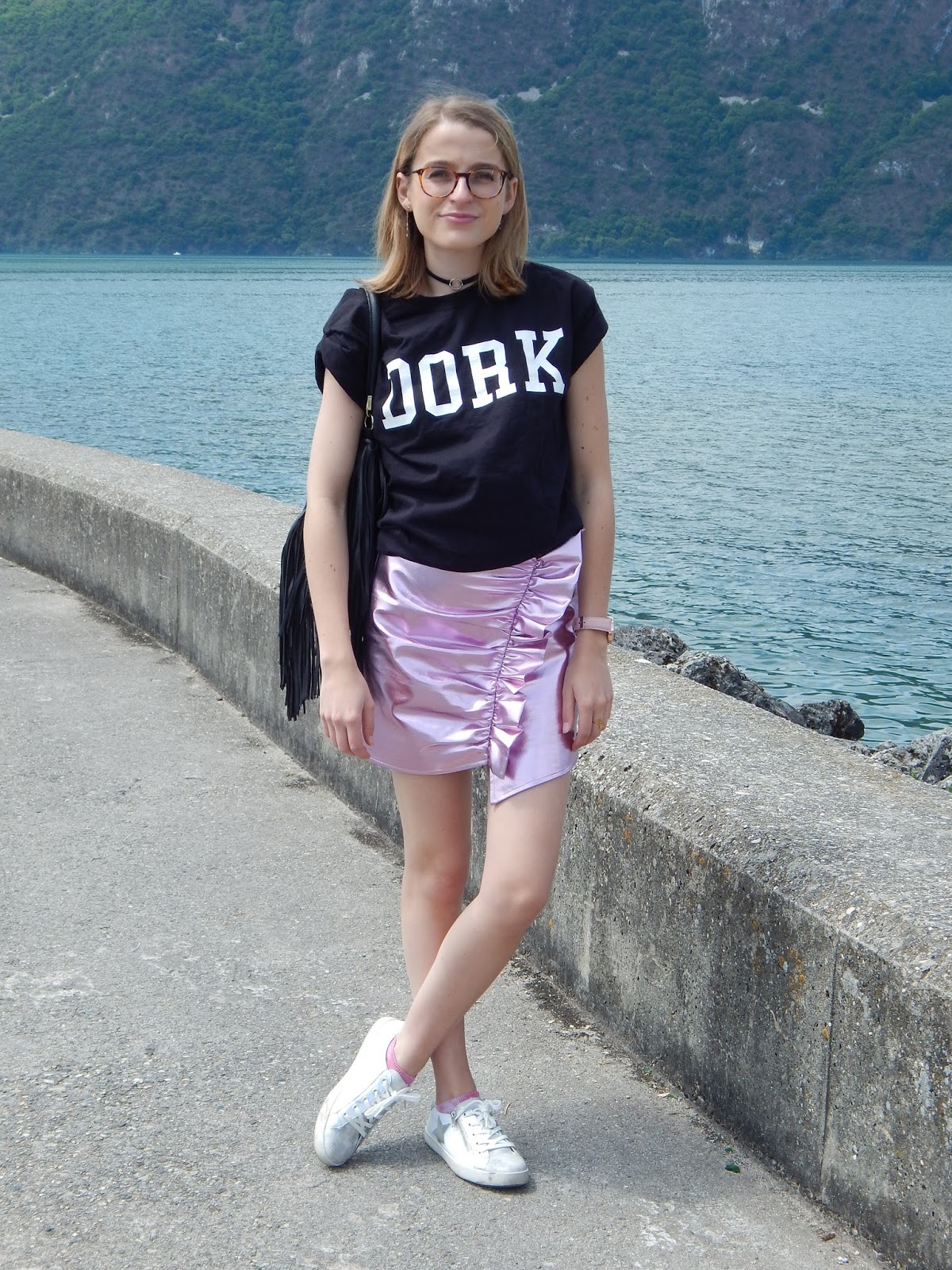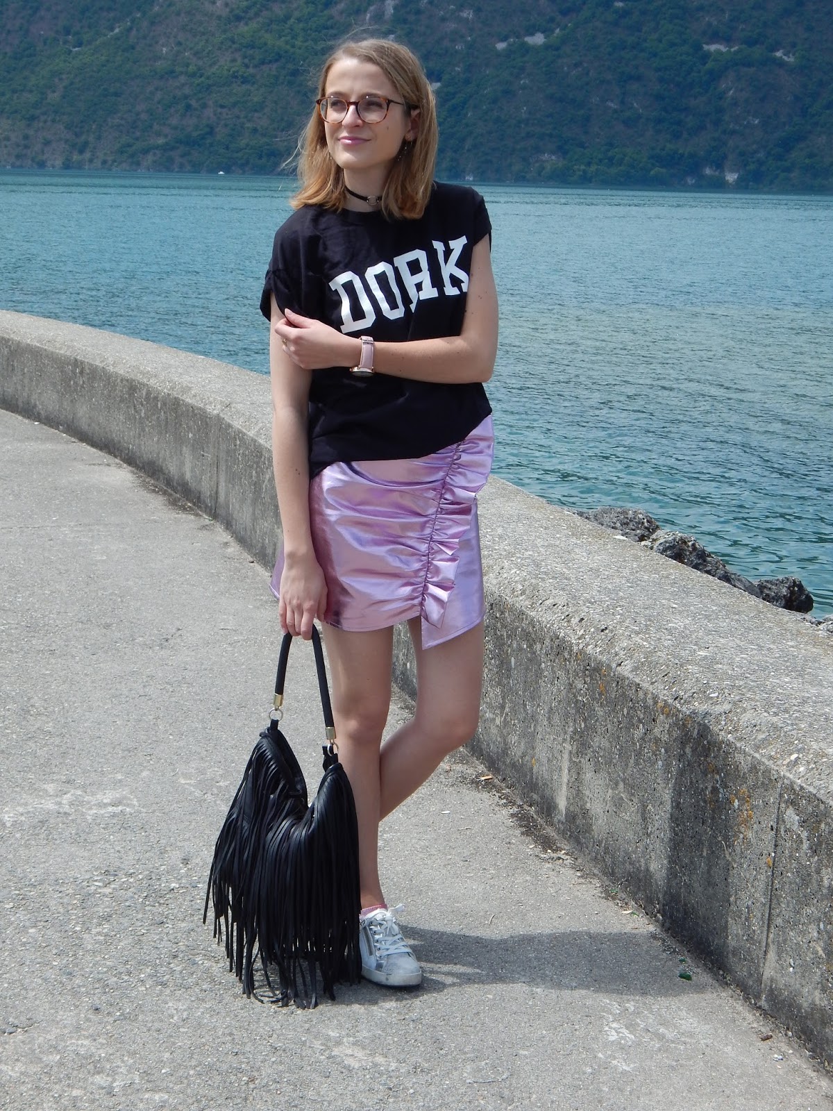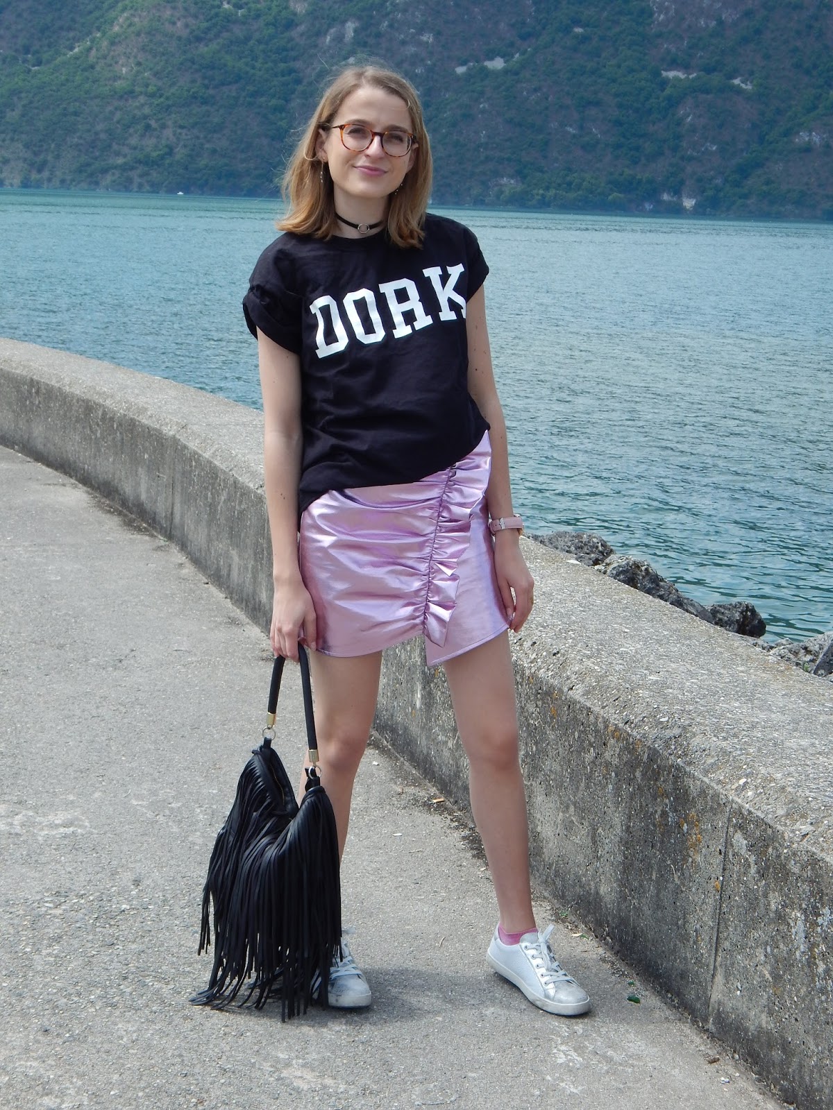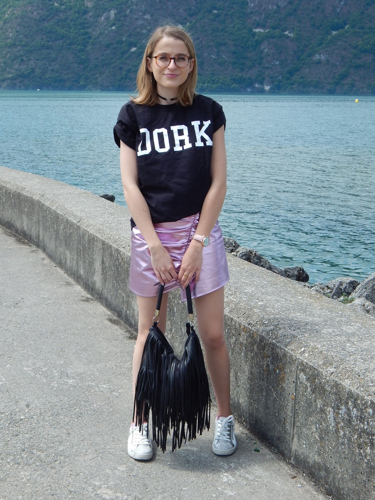 Il fallait quand même que je sorte cette jupe de l’espace que j’ai achetée il y a de ça plusieurs mois, juste avant de partir aux Etats-Unis, donc en janvier… J’avais craqué sur la forme et la couleur totalement dingues, j’avais même essayé la veste avec forme perfecto pour faire Michael Jackson, mais j’ai craqué sur la jupe. Je l’ai portée une journée à Londres, je vous ai d’ailleurs partagé ma vidéo ici, mais c’est tout… Elle n’est pas facile à associer mais je le savais. Du coup ce jour-là, j’ai vraiment voulu la porter et j’ai pensé à ce grand tee-short loose à inscription « Dork » « stupide » ou « idiot » en anglais. Mon sac frangé H&M histoire de changer de mon sac bourse traditionnel, mes petites baskets pour casser l’aspect chic et alien de cette jupe. Je porte aussi mon rouge à lèvres métallique Urban Decay que je vous ai montré dans mon Haul beauté américain, je ne le quitte plus, je l’adore. Et en plus, il allait parfaitement avec la jupe. Nous avons shooté devant le lac du Bourget, j’aime beaucoup le décor.