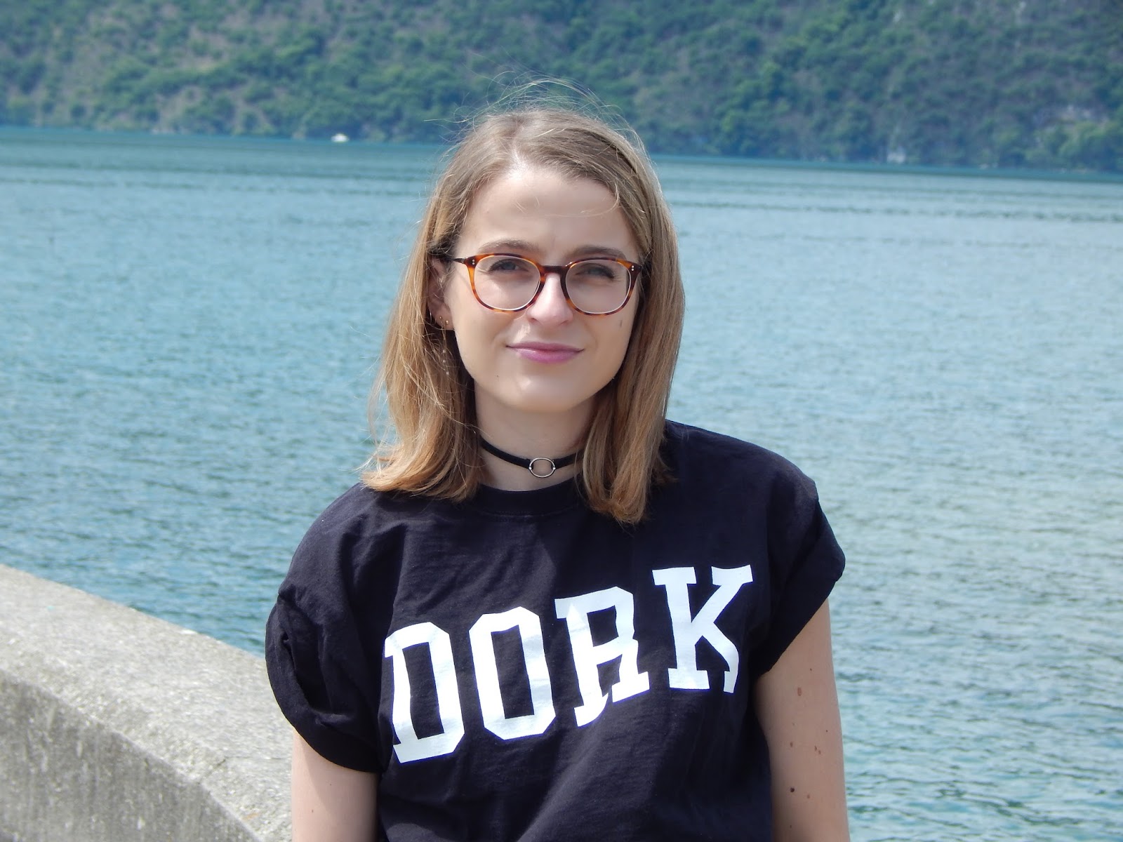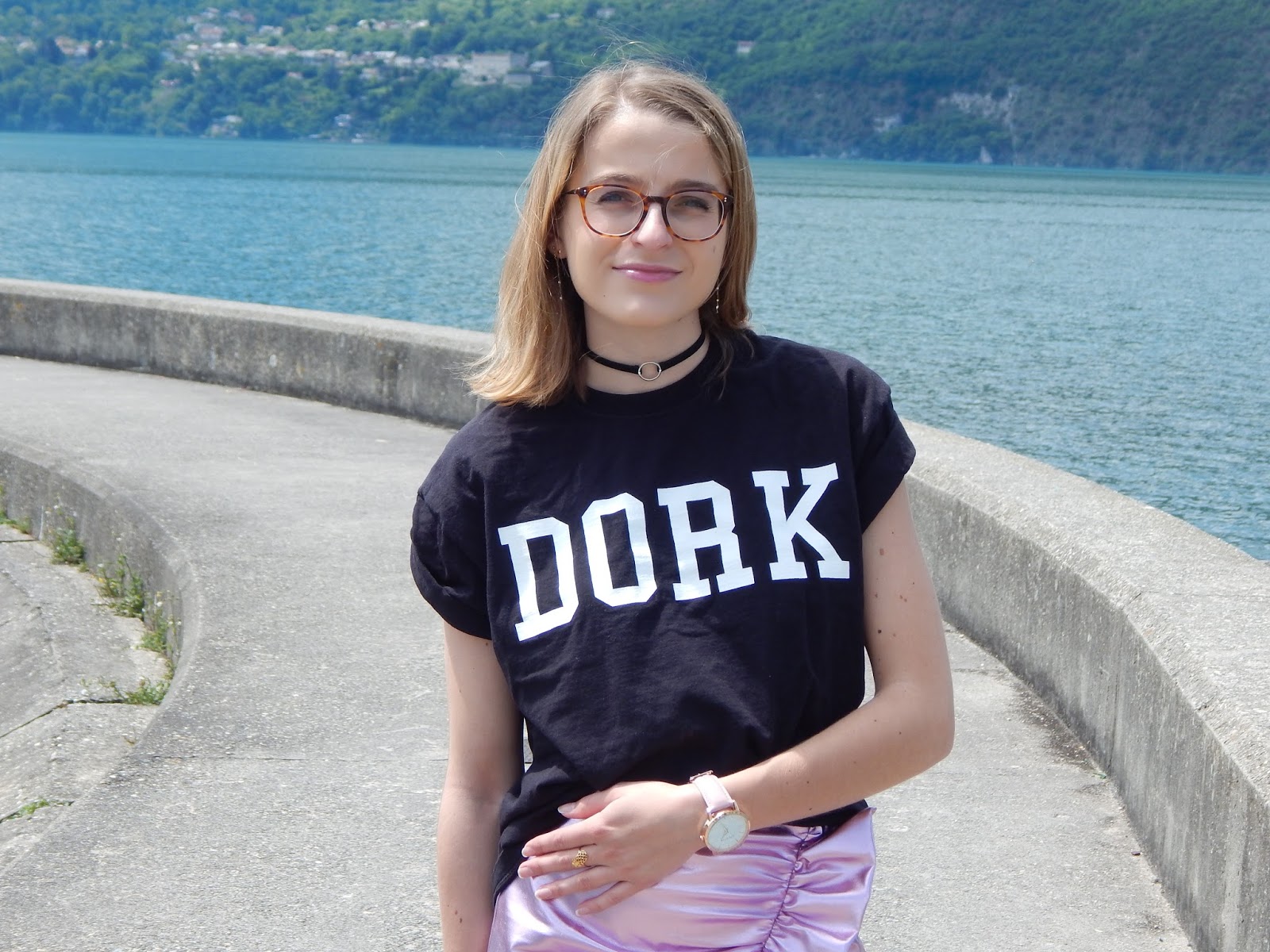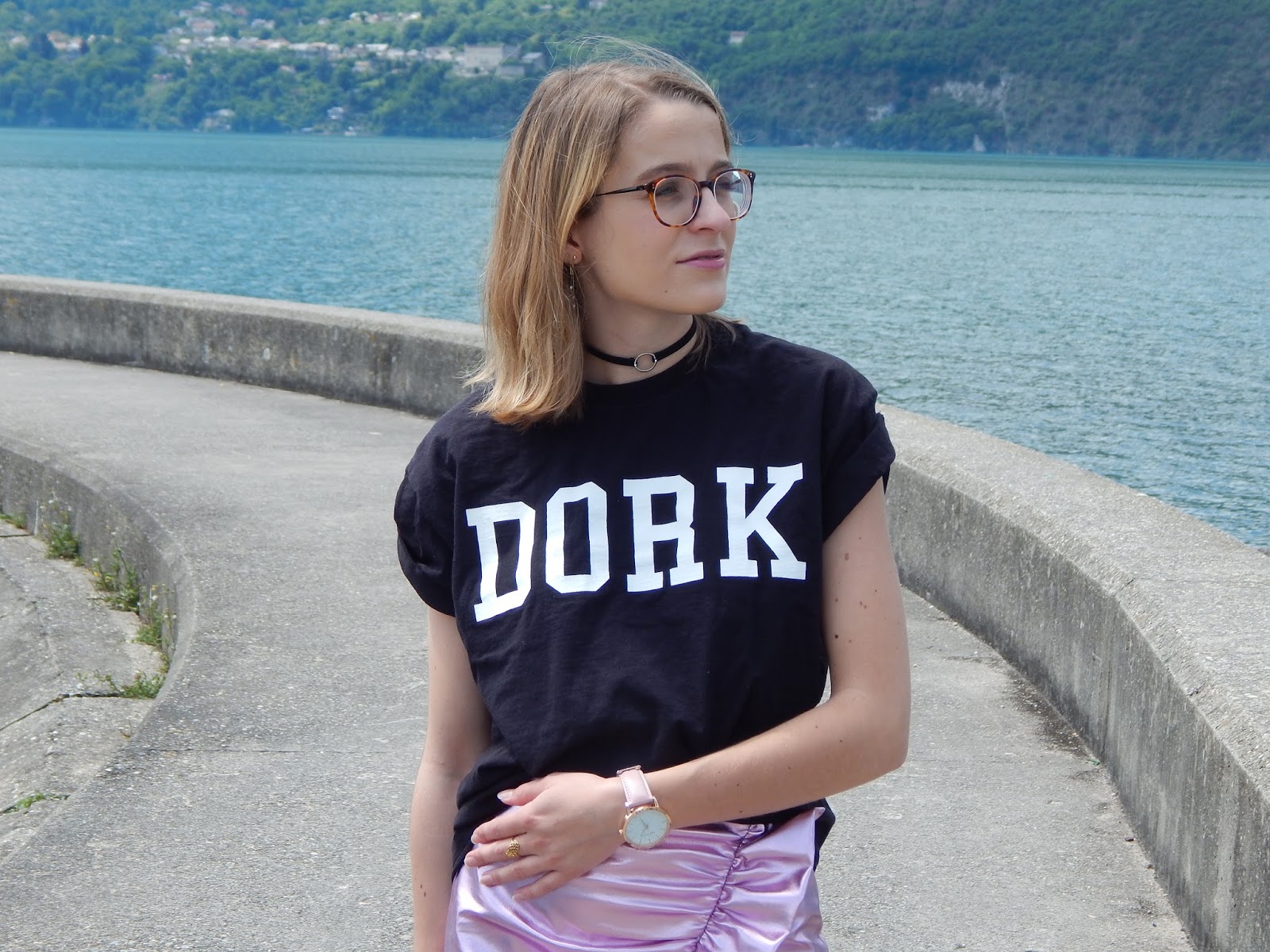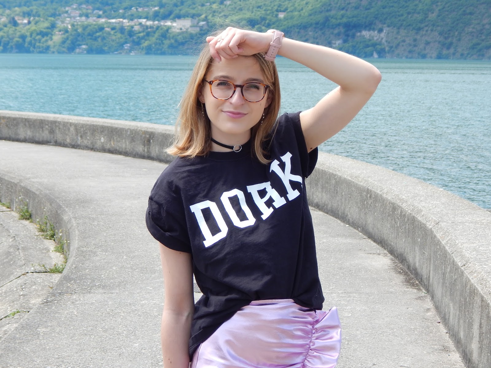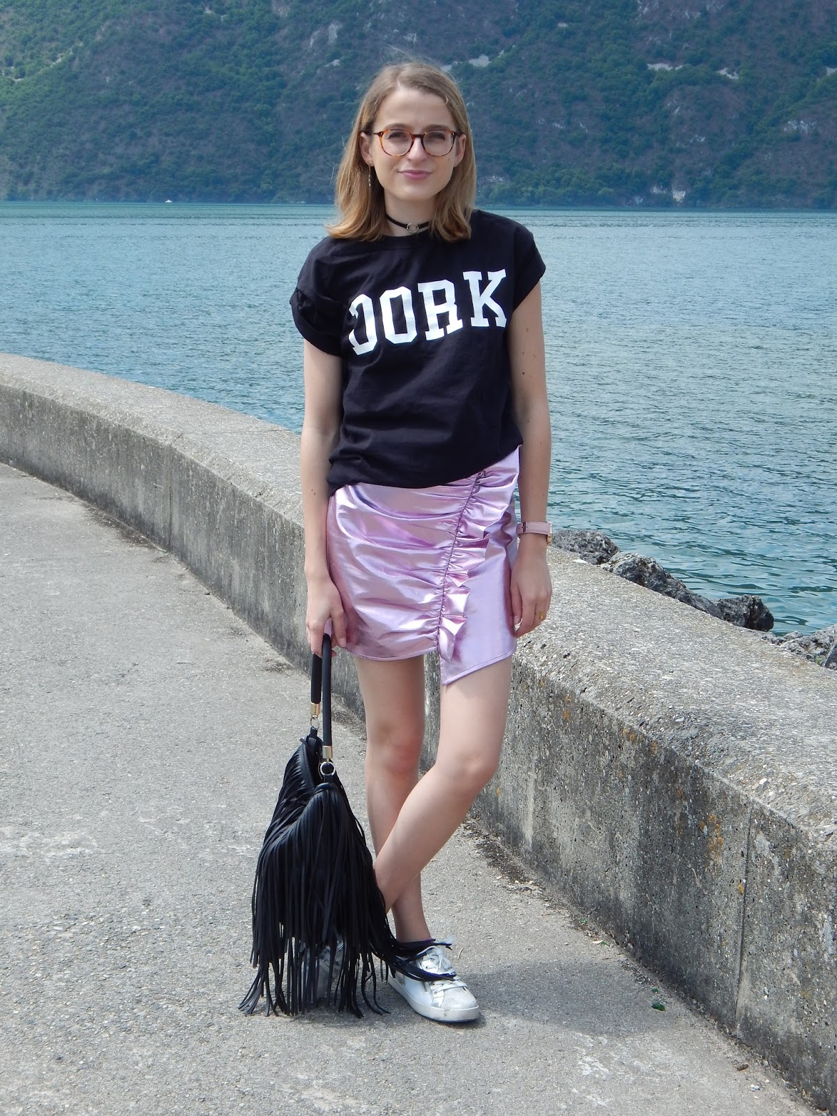Il fallait quand même que je sorte cette jupe de l’espace que j’ai achetée il y a de ça plusieurs mois, juste avant de partir aux Etats-Unis, donc en janvier… J’avais craqué sur la forme et la couleur totalement dingues, j’avais même essayé la veste avec forme perfecto pour faire Michael Jackson, mais j’ai craqué sur la jupe. Je l’ai portée une journée à Londres, je vous ai d’ailleurs partagé ma vidéo ici, mais c’est tout… Elle n’est pas facile à associer mais je le savais. Du coup ce jour-là, j’ai vraiment voulu la porter et j’ai pensé à ce grand tee-short loose à inscription « Dork » « stupide » ou « idiot » en anglais. Mon sac frangé H&M histoire de changer de mon sac bourse traditionnel, mes petites baskets pour casser l’aspect chic et alien de cette jupe. Je porte aussi mon rouge à lèvres métallique Urban Decay que je vous ai montré dans mon Haul beauté américain, je ne le quitte plus, je l’adore. Et en plus, il allait parfaitement avec la jupe. Nous avons shooté devant le lac du Bourget, j’aime beaucoup le décor.