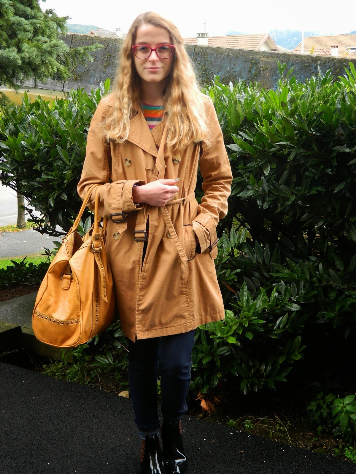 Trench/Coat; Haut/Shirt; Jegging: Pimkie; Sac/Bag: Galeries Lafayette; Bottines/Booties: Magasin lyonnais  » La Chausserie, 6ème ».