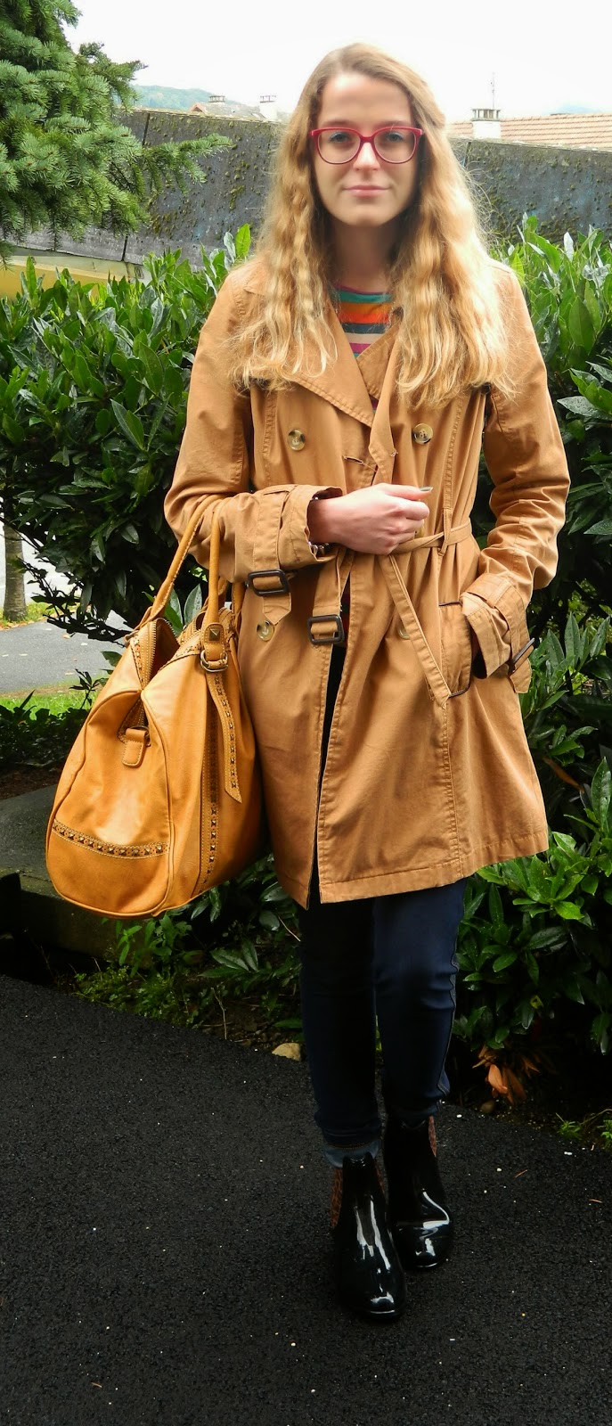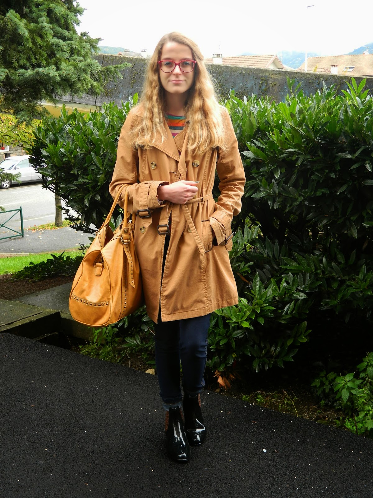 Un look automnal pris il y a plus d’un mois aux couleurs très automnales. Mon trench camel d’il y a quelques années acheté en même temps que ce joli haut rayé. J’avais déjà fait cette combinaison il y a près de quatre ans, mais avec un autre pantalon. J’avais vraiment beaucoup aimé cette combinaison. Cette fois, c’est avec mon legging, mon sac dans le même ton que mon trench, et mes bottines en caoutchouc semi-léopard.
