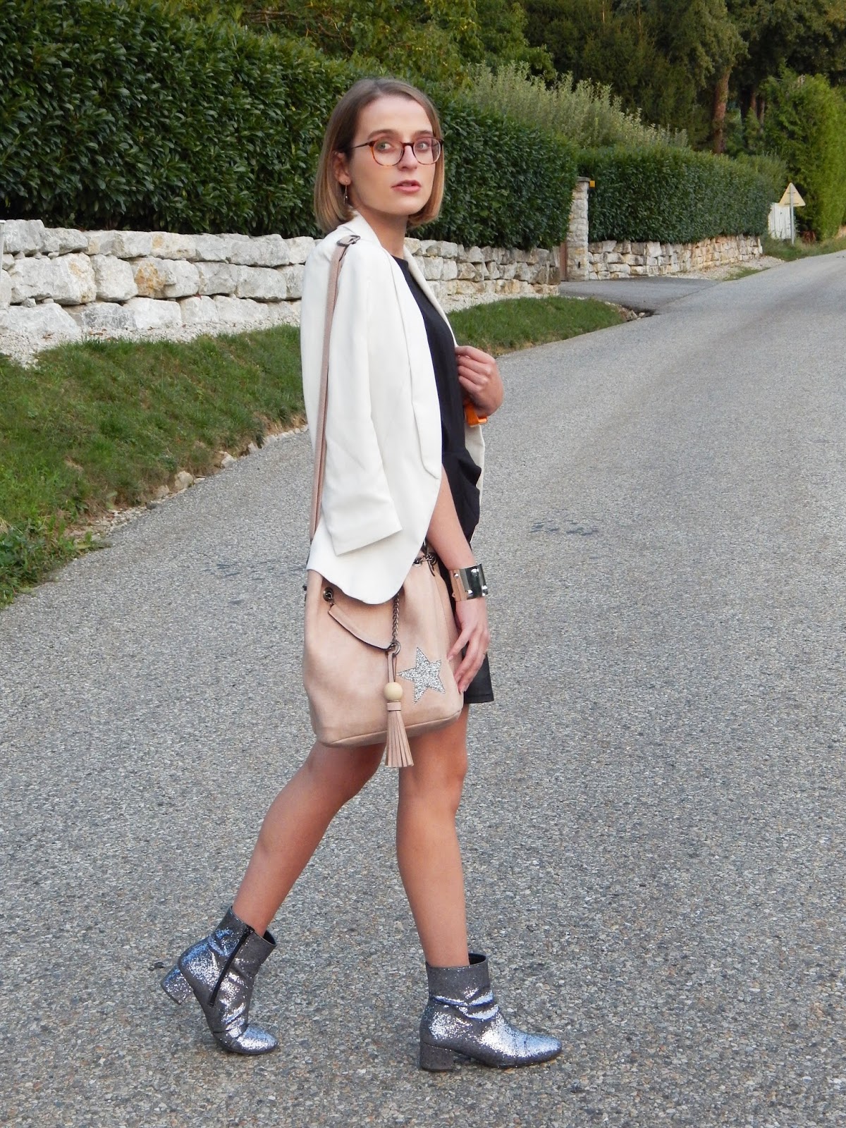 Blazer; Jupe/Skirt; Bracelet: H&M; Top/Shirt: Arbigli; Sac/Bag: Mandoline; Bottines/Booties: Texto