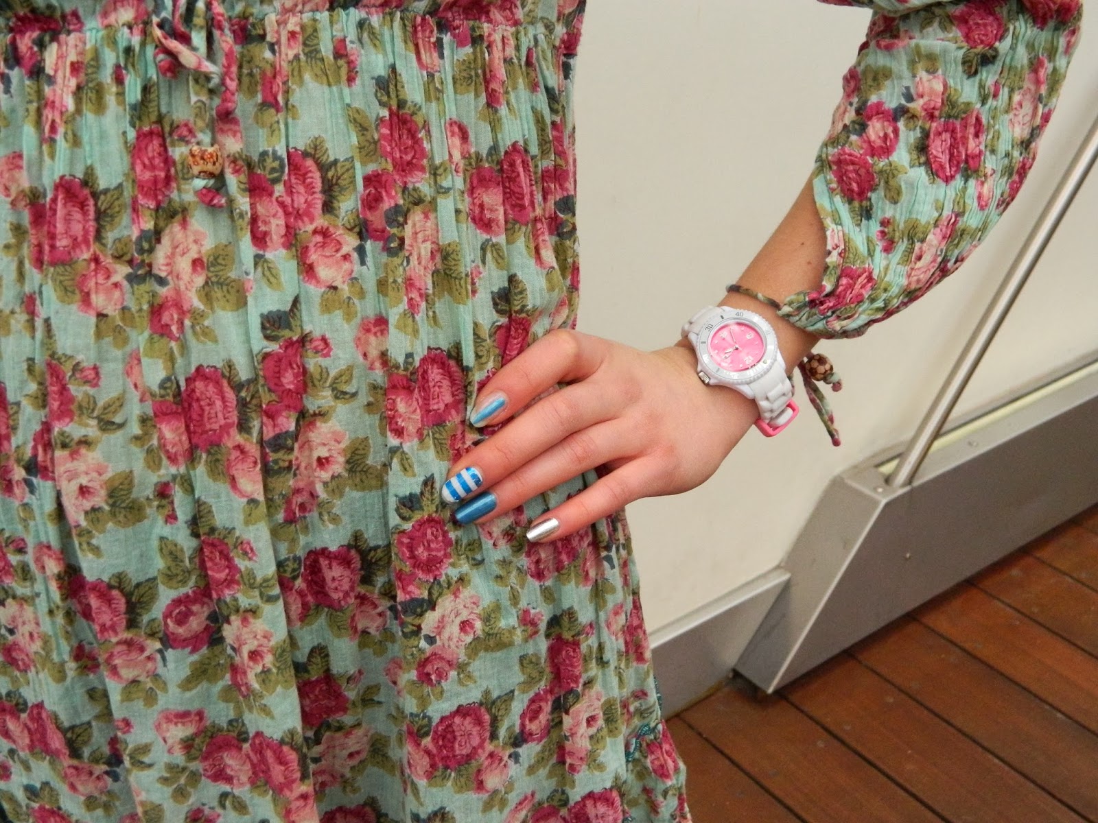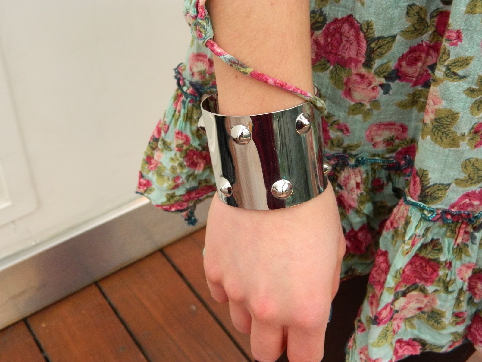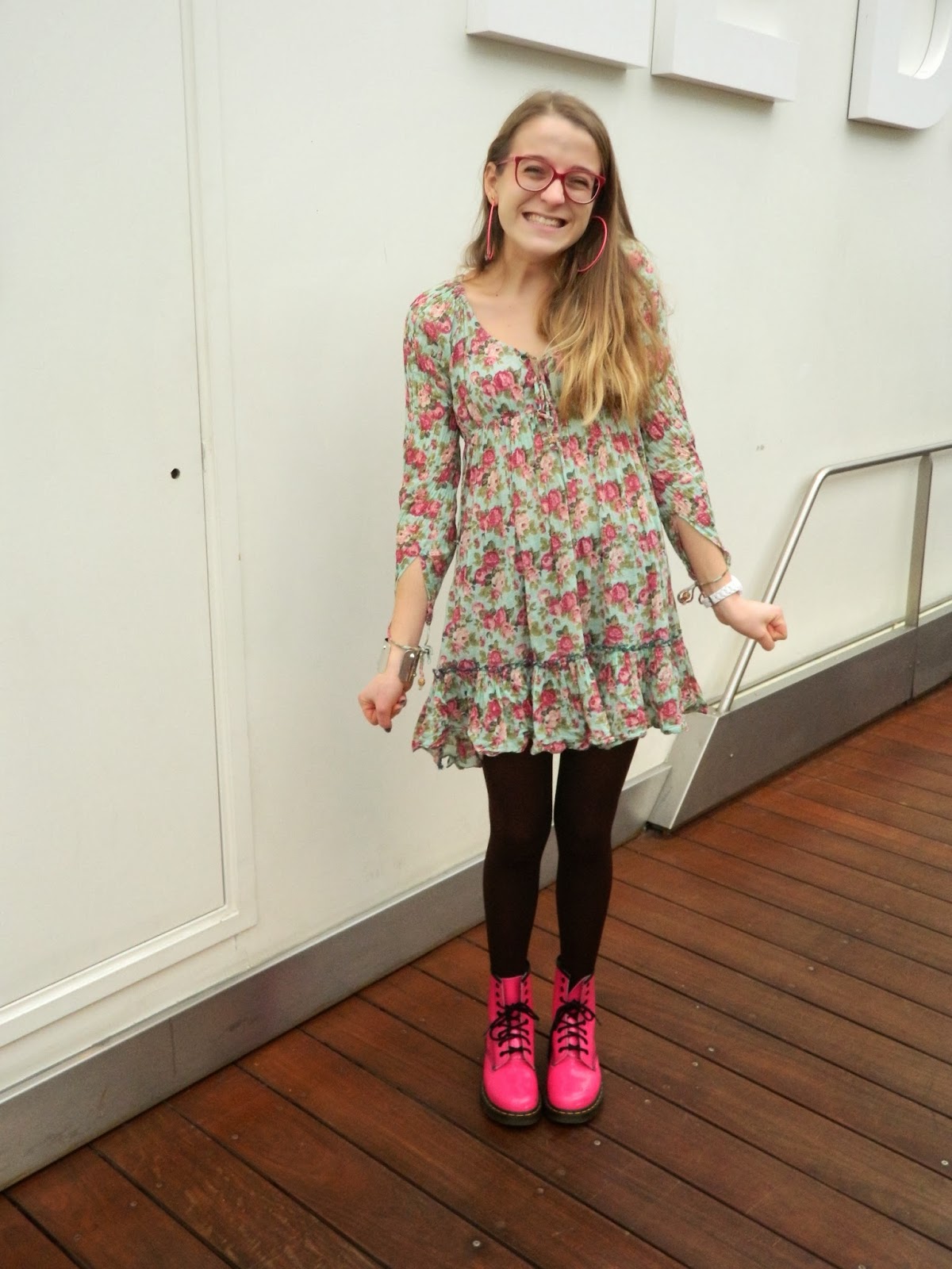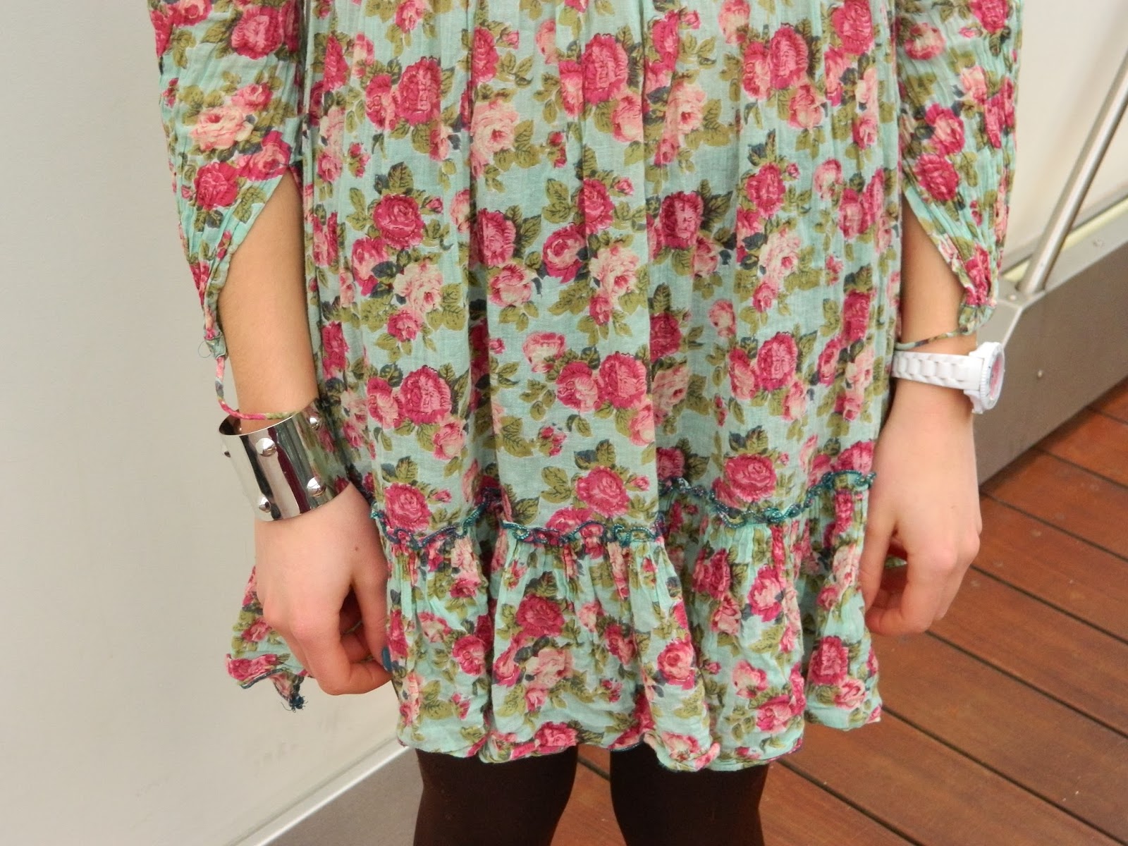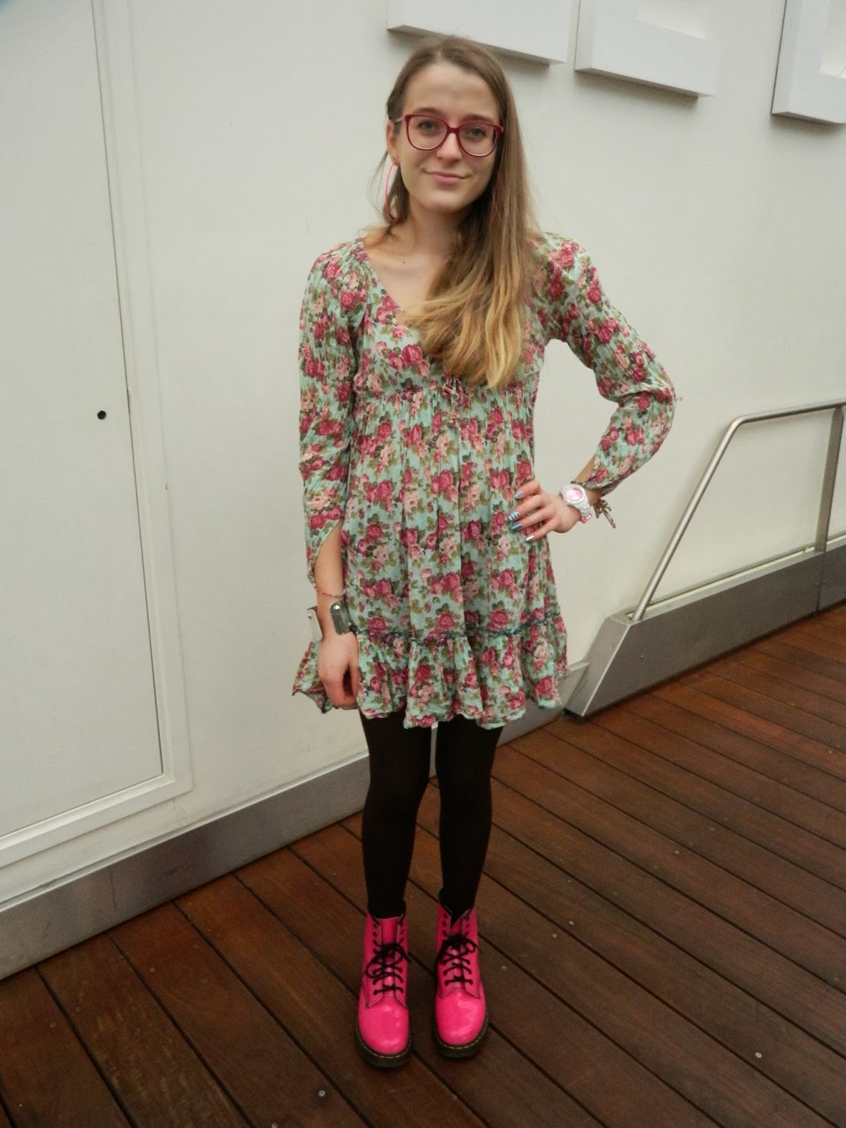 Ce jour-là, je portais ma robe fleurie, que ma mère avait achetée dans une petite boutique du Sud il y a quelques années. Désormais mienne, je l’adore. Avec, mes anneaux roses, que j’ai retrouvés dans une boite et ma manchette. Il y a de cela quatre, cinq ans, je faisais la collection des boucles d’oreilles et devais en avoir soixante-dix paires. Ca m’a passé, et maintenant c’est les fringues… Depuis, je garde quasiment que mes petites boucles en or, et c’était l’occasion de changer un peu. Mes Docs, pour rappeler les couleurs de la robe, et mon perfecto.