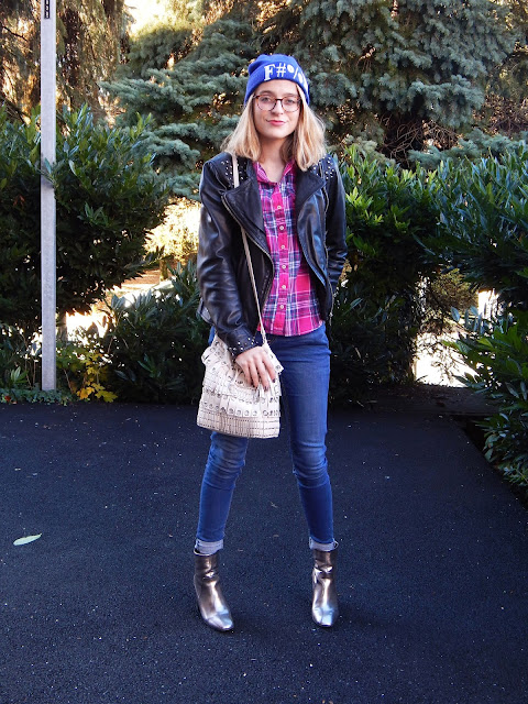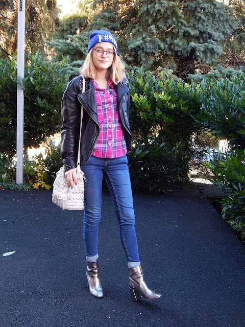 Veste en cuir/Leather jacket: Oakwood; Bonnet/Beanie: Tally Weijl; Chemise/Shirt: Hollister; Sac/Purse: Mango; Jean: Levi’s; Bottines/Booties: New Look sur Asos