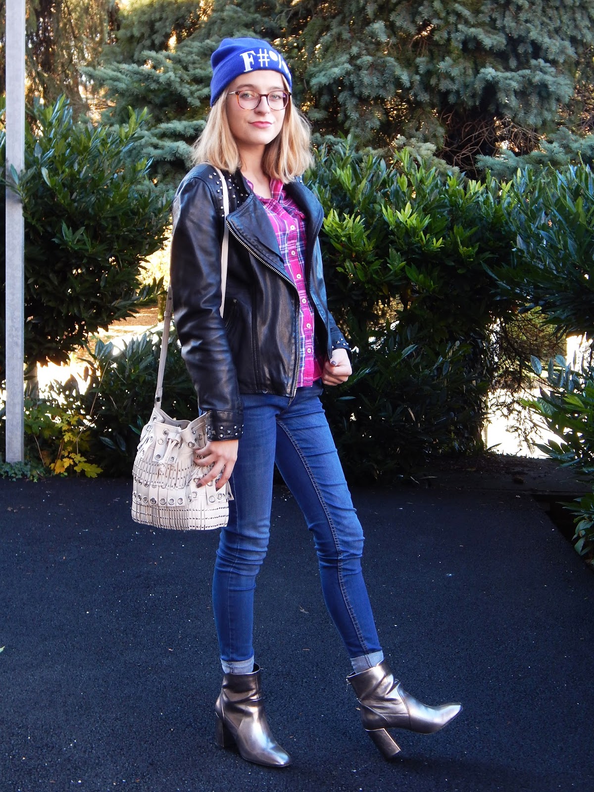 Veste en cuir/Leather jacket: Oakwood; Bonnet/Beanie: Tally Weijl; Chemise/Shirt: Hollister; Sac/Purse: Mango; Jean: Levi’s; Bottines/Booties: New Look sur Asos
