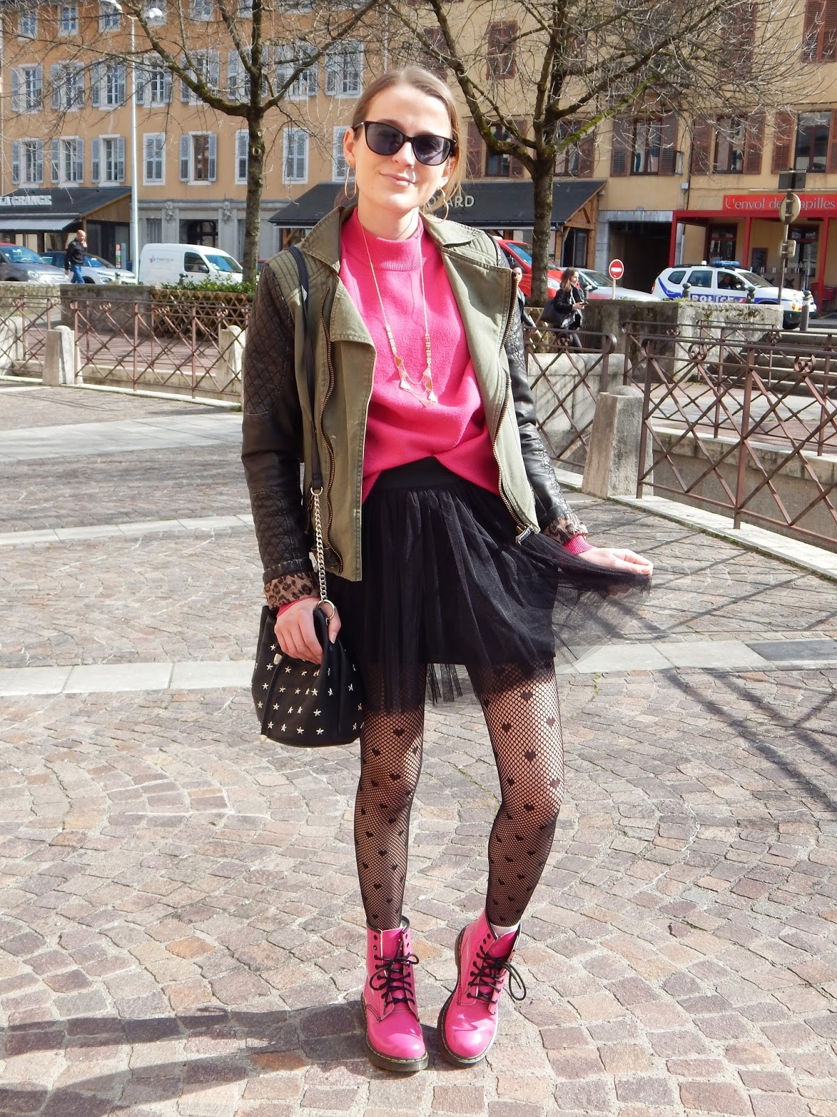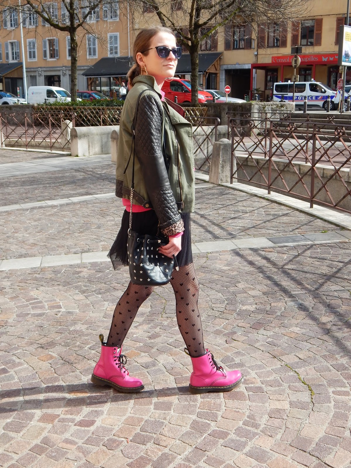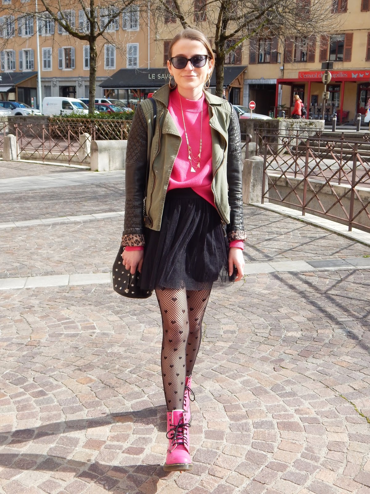 Une tenue encore avec du rose! Décidément je n’arrête pas… Vous avez d’ailleurs pu le voir dans ma toute dernière vidéo lookbook, dans lequel je porte du rose dans trois tenues! J’aime beaucoup cette couleur, ça pète un peu. Vous avez pu le voir porté avec une robe dans ce look. Cette fois-ci j’ai voulu l’associer une jupe, celle-ci en particulier, que je n’avais pas ressortie depuis vraiment longtemps… Je l’ai maintenant depuis des années, et cette petite jupe patineuse en tulle est toujours là! Une petite veste kaki bimatière, mes collants résille à coeur et mes Doc. Pour les accessoires, je porte mes boucles d’oreilles coeur que vous pouvez retrouver dans mon onglet « ma penderie » dans lequel je mets toutes les nouvelles pièces de mon dressing ces derniers mois. Un look assez osé, mais que j’aime assez. J’aime beaucoup décales des pièces de mon dressing, comme ici avec une jupe assez féminine associée à de grosses chaussures colorées.