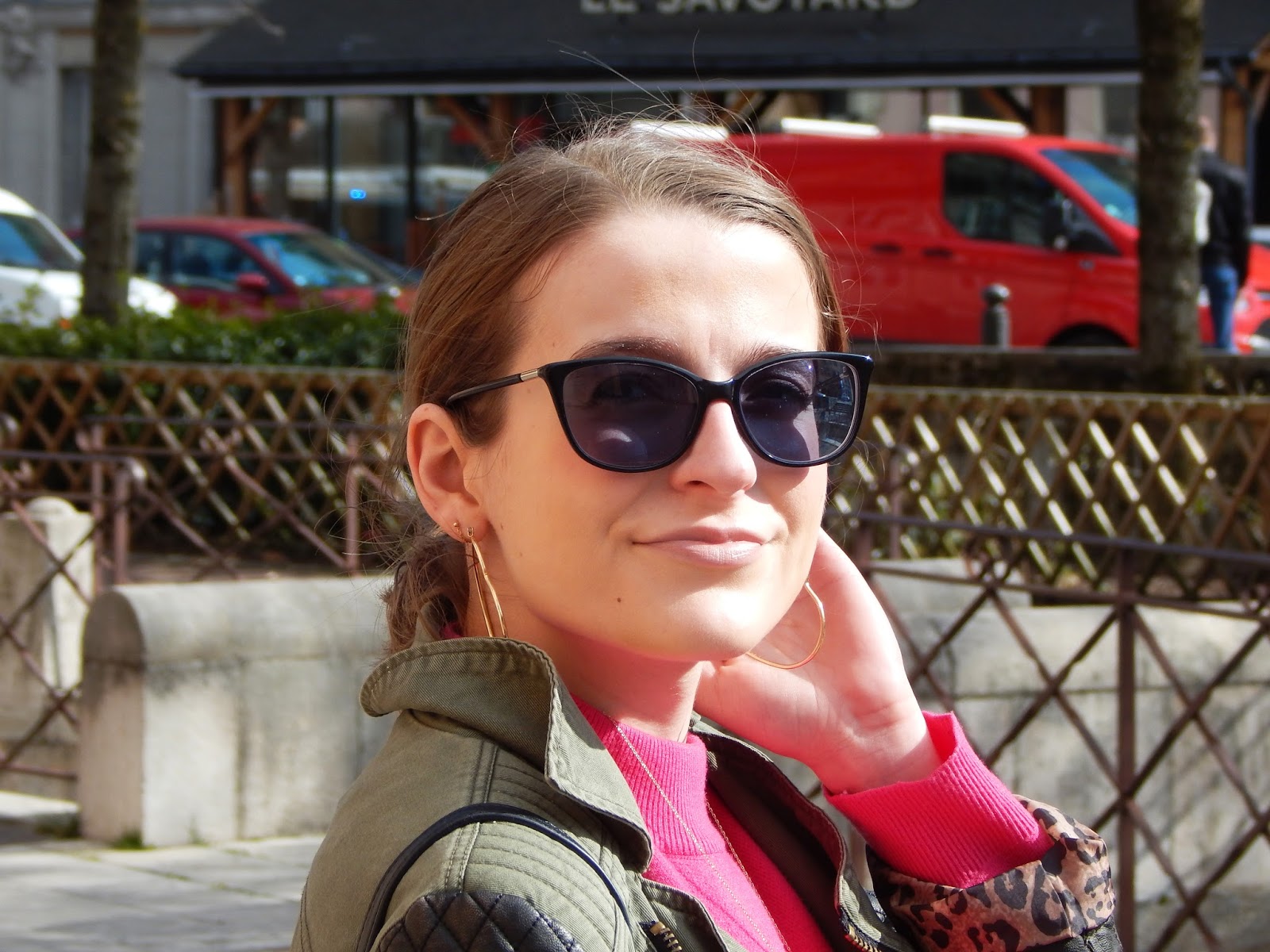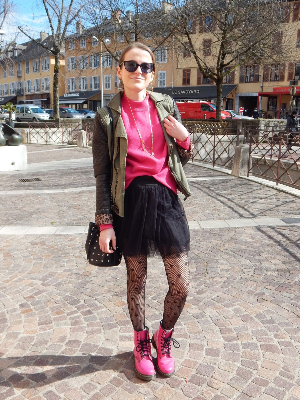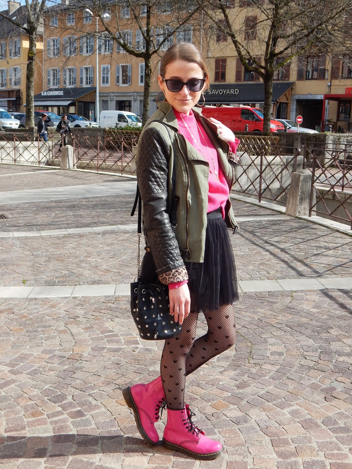 Une tenue encore avec du rose! Décidément je n’arrête pas… Vous avez d’ailleurs pu le voir dans ma toute dernière vidéo lookbook, dans lequel je porte du rose dans trois tenues! J’aime beaucoup cette couleur, ça pète un peu. Vous avez pu le voir porté avec une robe dans ce look. Cette fois-ci j’ai voulu l’associer une jupe, celle-ci en particulier, que je n’avais pas ressortie depuis vraiment longtemps… Je l’ai maintenant depuis des années, et cette petite jupe patineuse en tulle est toujours là! Une petite veste kaki bimatière, mes collants résille à coeur et mes Doc. Pour les accessoires, je porte mes boucles d’oreilles coeur que vous pouvez retrouver dans mon onglet « ma penderie » dans lequel je mets toutes les nouvelles pièces de mon dressing ces derniers mois. Un look assez osé, mais que j’aime assez. J’aime beaucoup décales des pièces de mon dressing, comme ici avec une jupe assez féminine associée à de grosses chaussures colorées.