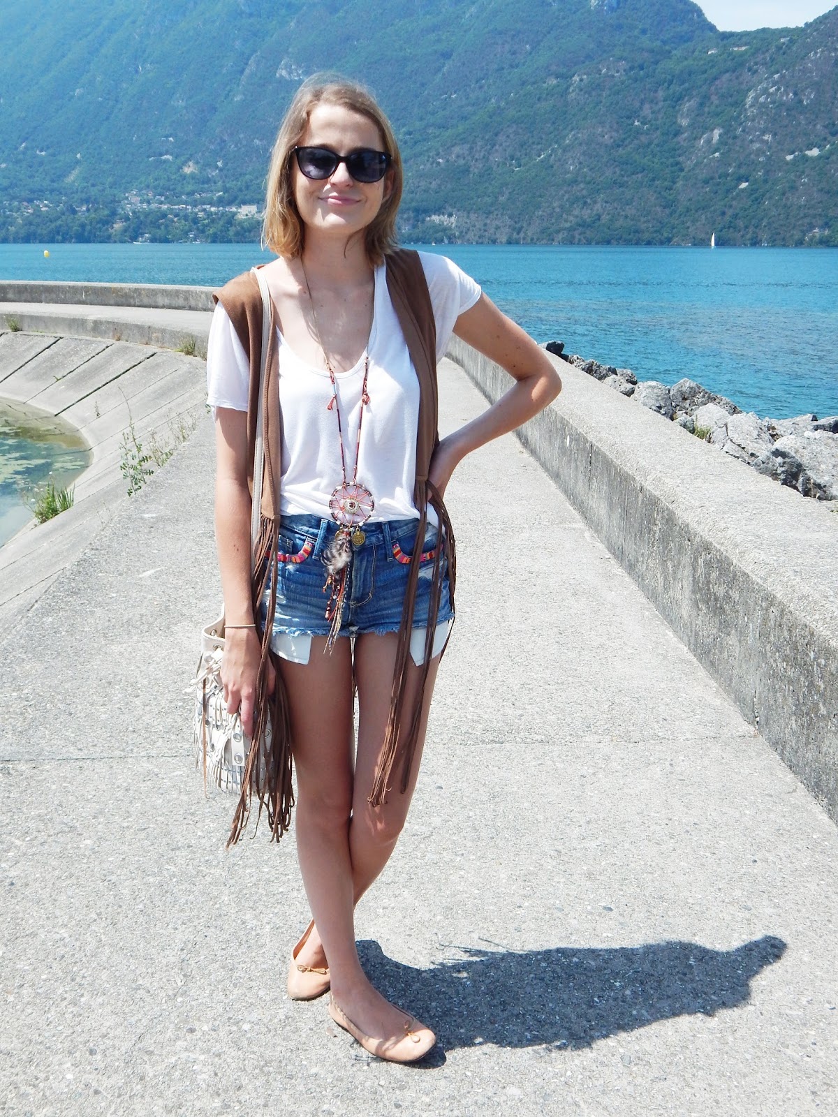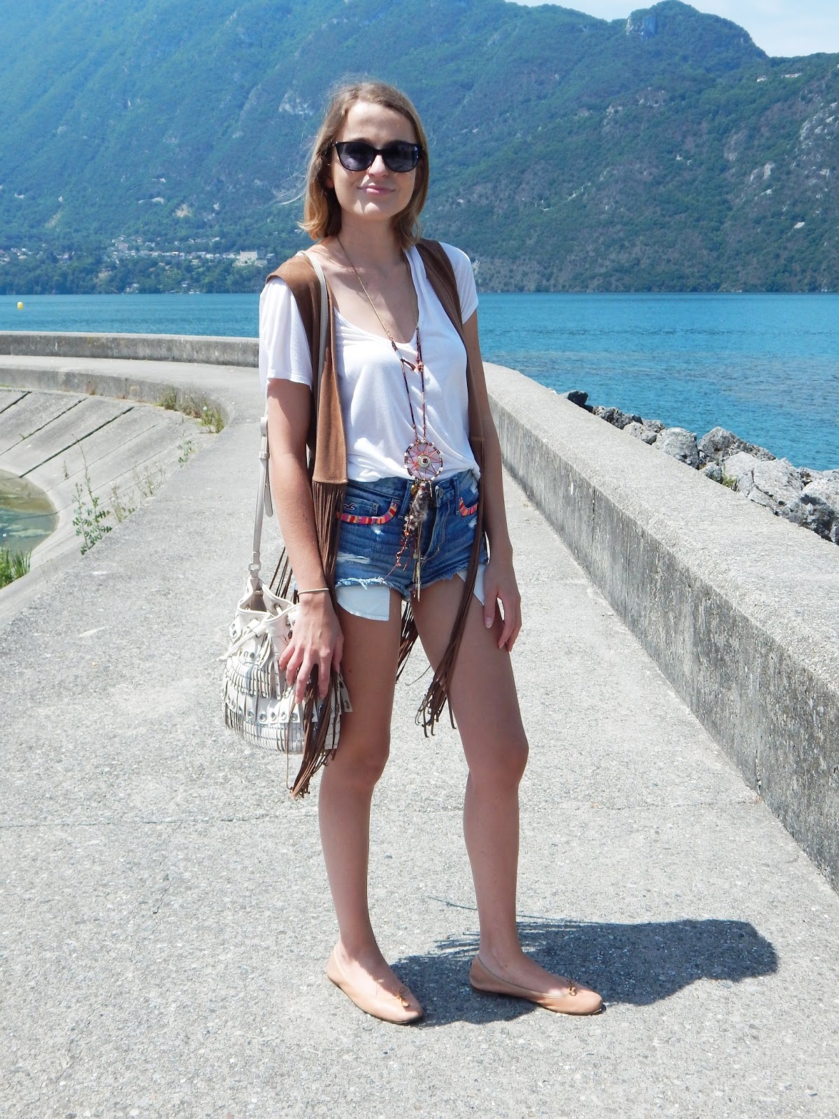 A l’approche de Musilac qui commence aujourd’hui, j’avais envie d’une tenue style gypsy avec des franges. Du coup, rien de mieux pour ça que ma veste frangée Hollister, qui reste l’une de mes pièces préférées de mon dressing. J’ai voulu opter pour un tee short blanc, afin de dédramatiser les deux pièces importantes du look avec le gilet et le collier. Ce collier que j’adore, imposant, beau, j’adore le combo avec le gilet. Mon short Hollister, parce que je trouve sa coupe particulièrement réussie et joli avec l’ensemble. Aux pieds, j’ai ressorti mes Repetto pour casser un peu le look, et parce que les couleurs sont jolies ensemble.