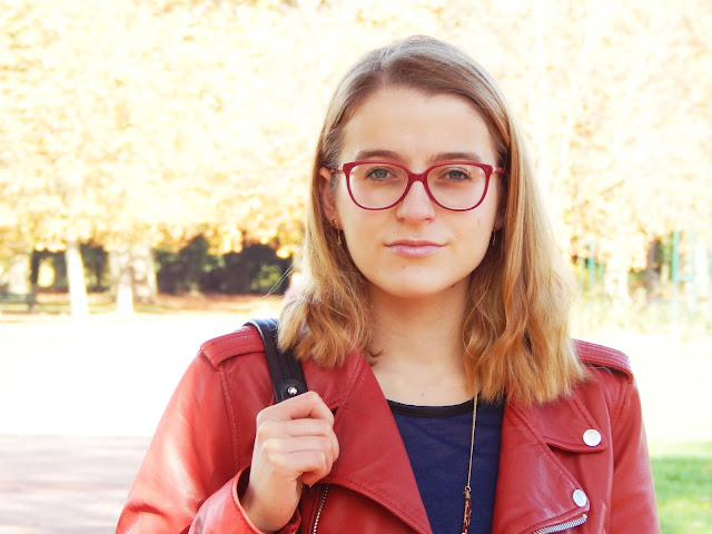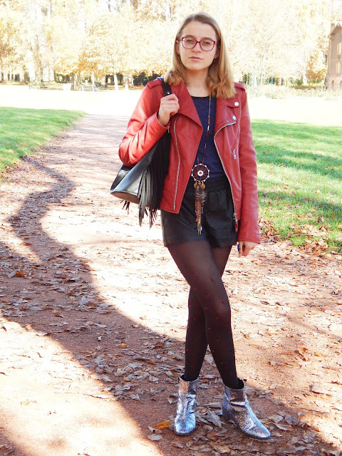 Veste en cuir/Leather jacket: Schott NYC; Haut/Shirt; Sac/Bag; Short: Jennyfer; Collier/Necklace: Réserve naturelle; Collants/Tights: H&M; Bottines/Booties: Texto