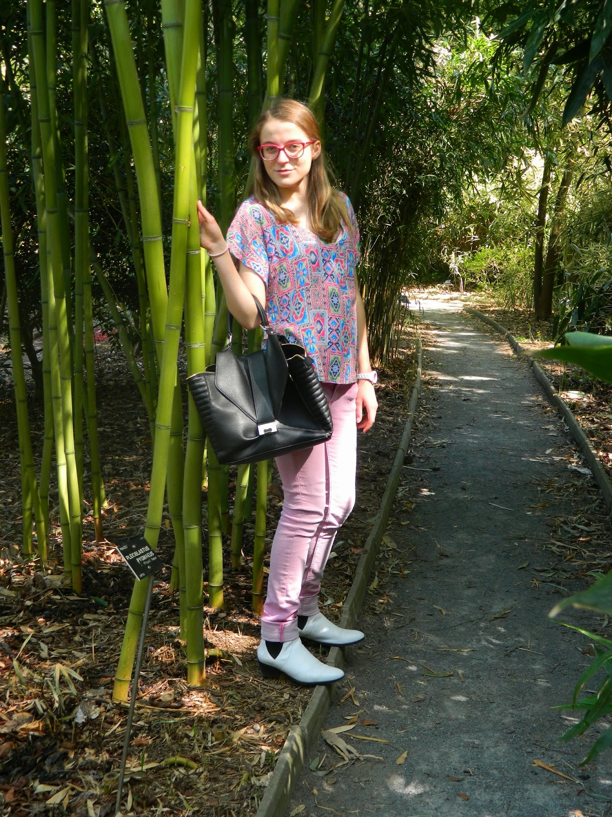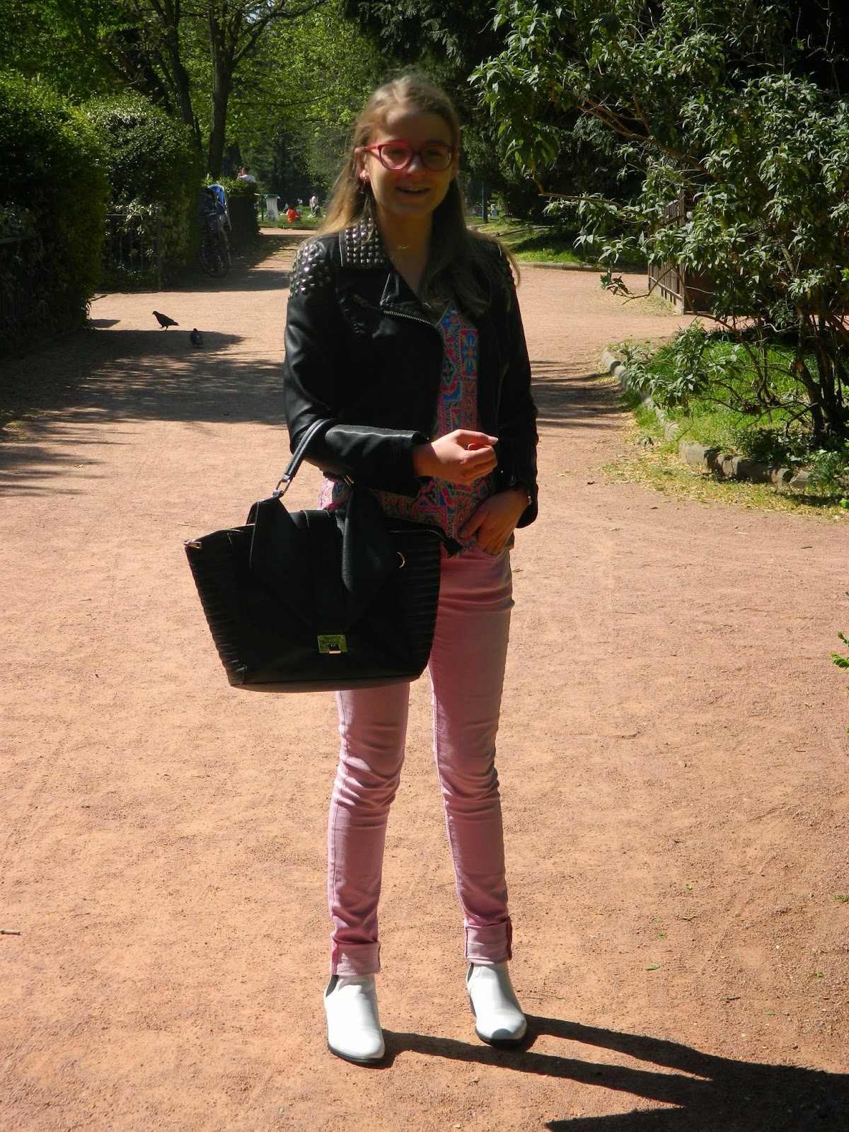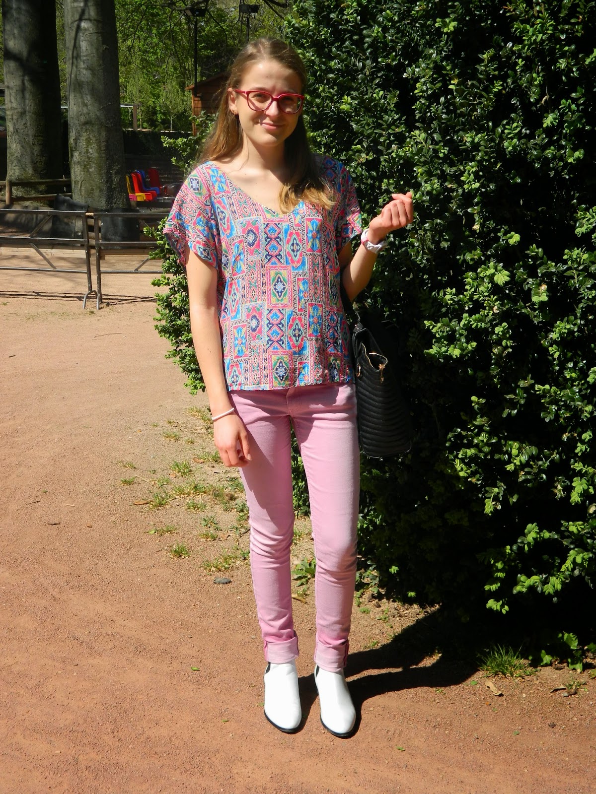 Une balade au parc Dimanche dernier. J’étais revenue pour le week-end. Lyon me manque pas mal depuis que je suis rentrée chez moi, mais je vais essayer d’y retourner régulièrement. Une après-midi ensoleillée et très agréable. L’occasion de dégainer mes bottines blanches, très salissantes comme vous pouvez l’imaginer. Mon nouveau haut bariolé, et mon jean bubble-gum. Très agréable aussi de pouvoir enlever le perf’.