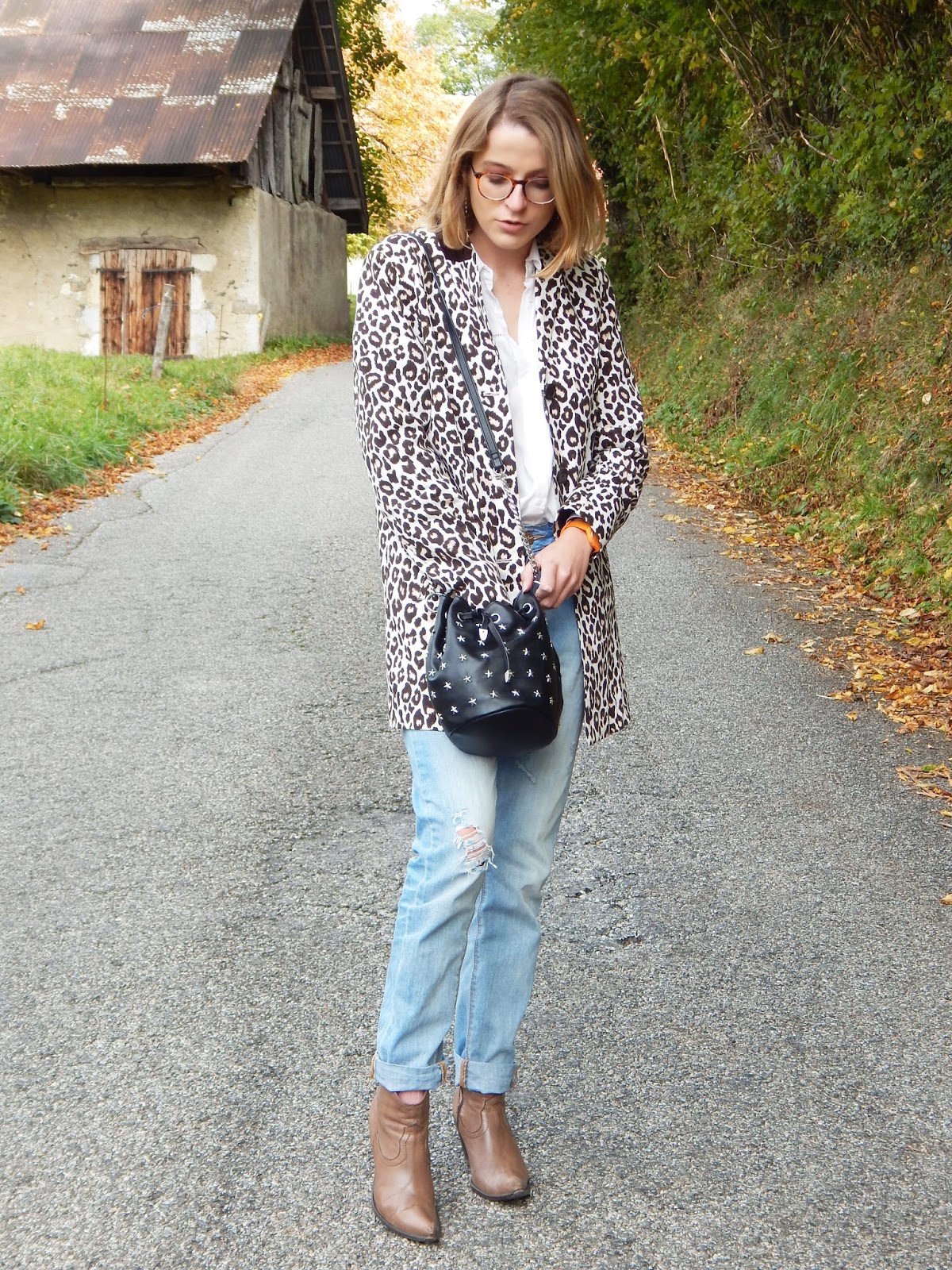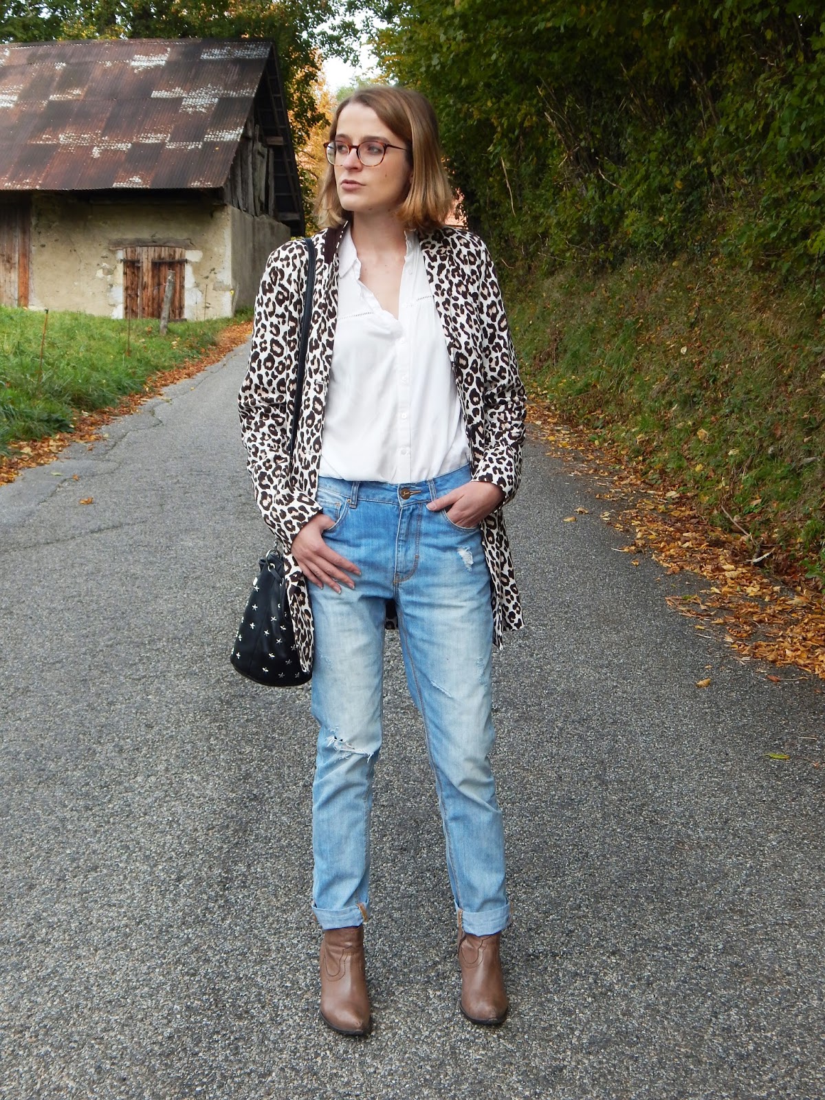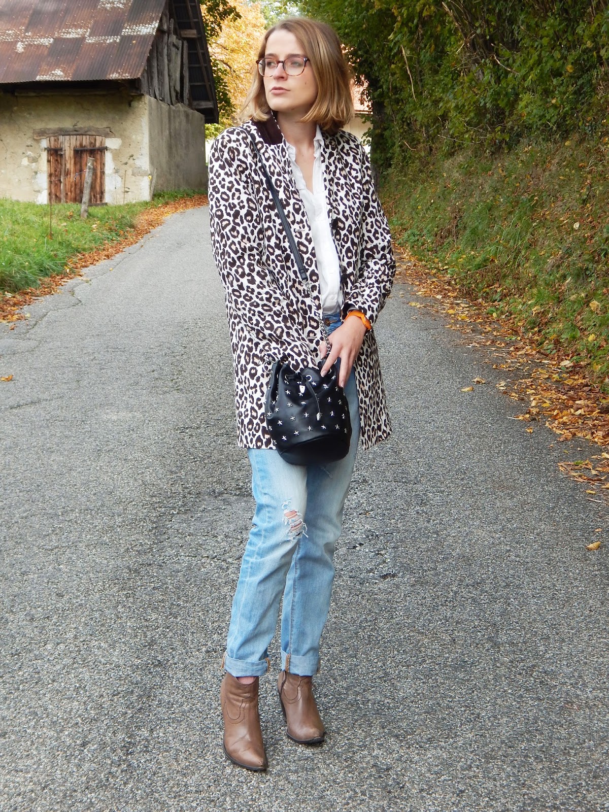 I haven’t wear this coat from a long time and I missed it a lot. I enjoyed warm temperatures of october to do it. Generally I wear it with these pair of booties, finding, it was matching pretty well. The same for these jeans. On the top, I was wearing my new shirt from Stradivarius which I showed you, in my « My closet » tab. I’m totally crazy about it, I was looking for a white shirt for the times where I wanted to wear printed jeans. It’s really agreable to wear, light, original which matches with everything.