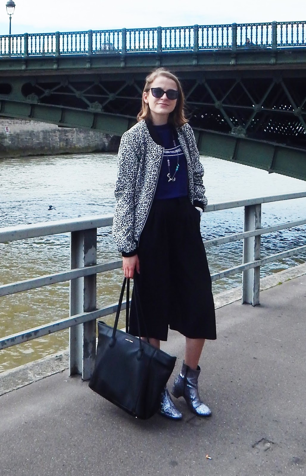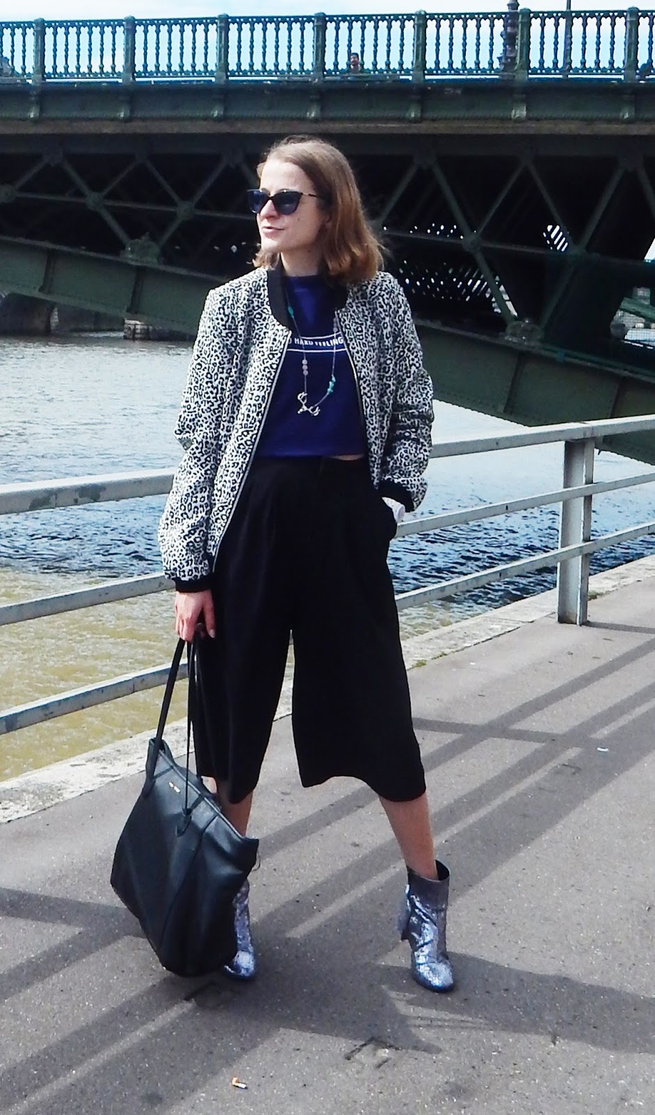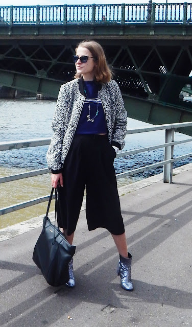 Bomber: Pimkie; Collier/Necklace: Indilly; Crop top: H&M; Jupe-culotte/Culotte: Forever 21; Sac/Bag: Mango; Bottines/Booties: Texto