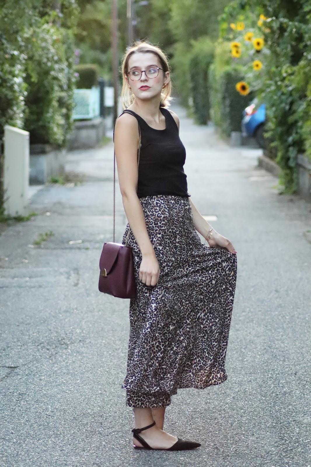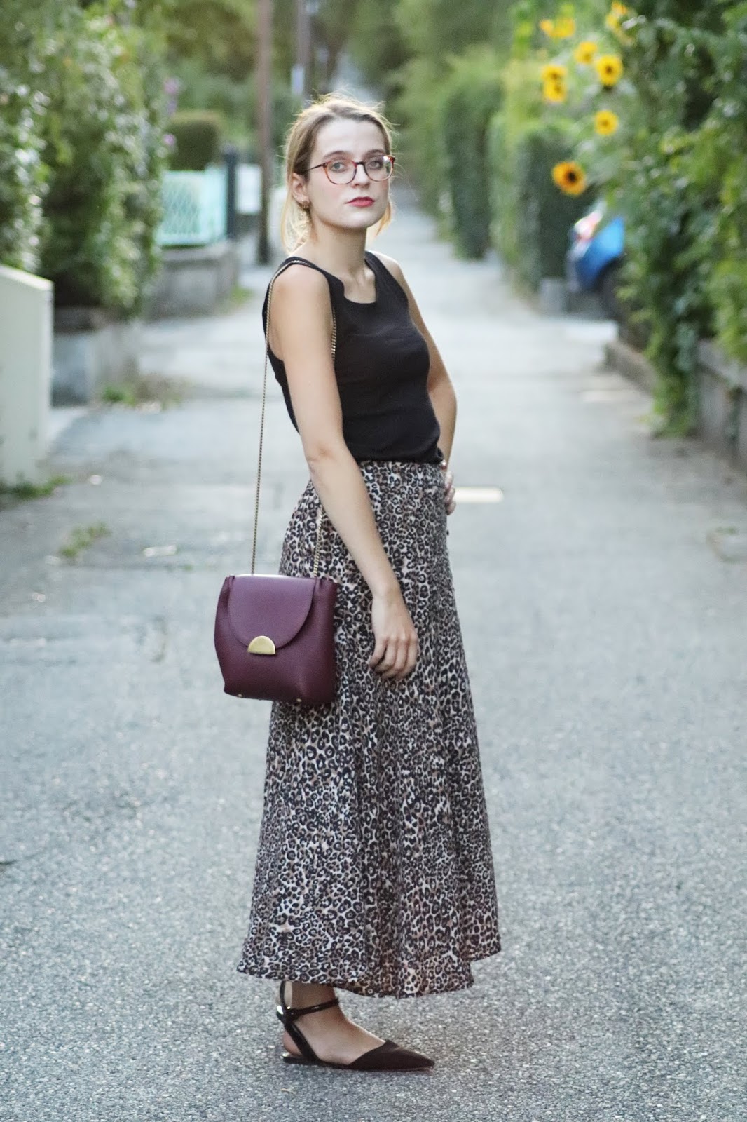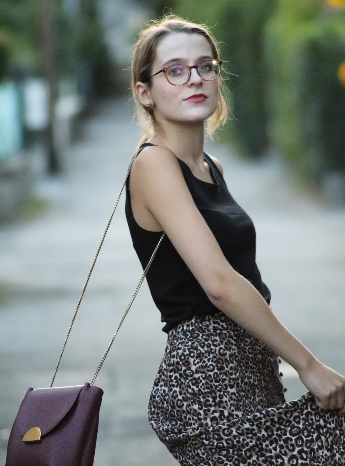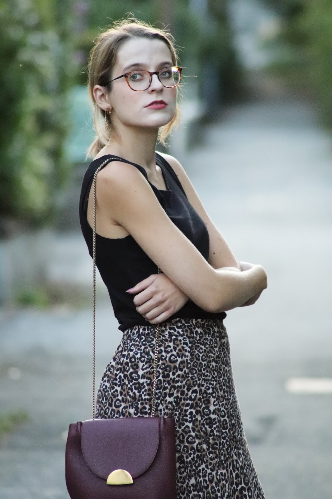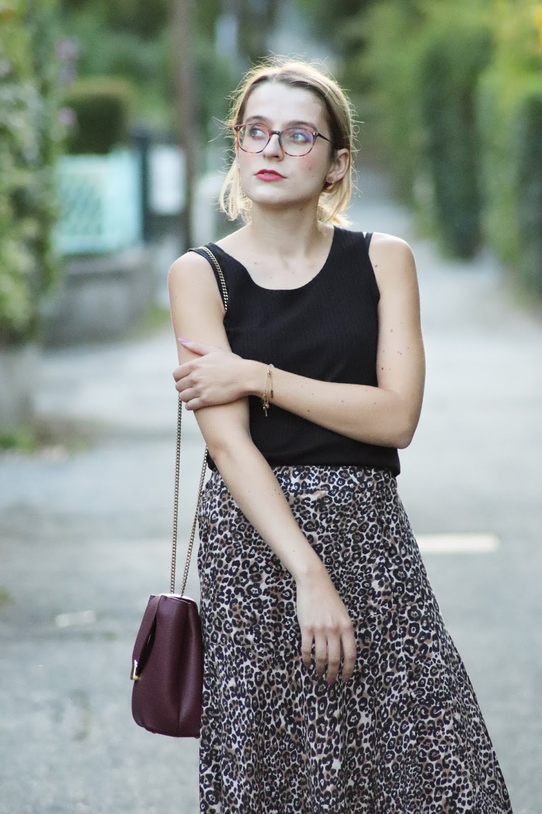 J’avais très envie de vous montrer ma nouvelle jupe imprimé léopard shoppée chez Stradivarius lors d’un cours séjour à Paris semaine dernière. Je pense que ce n’est pas une nouveauté vous le savez, mais j’adore la marque espagnole, qui propose des vêtements très fashion, à des prix vraiment abordables. Bon au niveau de la qualité, la robe que je portais dans mon dernier look s’est décousue, ainsi que la jupe d’une copine… J’aime beaucoup le léopard, et ce jour-là je suis aussi repartie avec une robe à l’imprimé similaire ahah. Je la porte avec mon nouveau petit haut Mango, acheté à Milan pour 10€, que je porte pour au moins la troisième fois. Tout simple, confortable, il va avec tout.