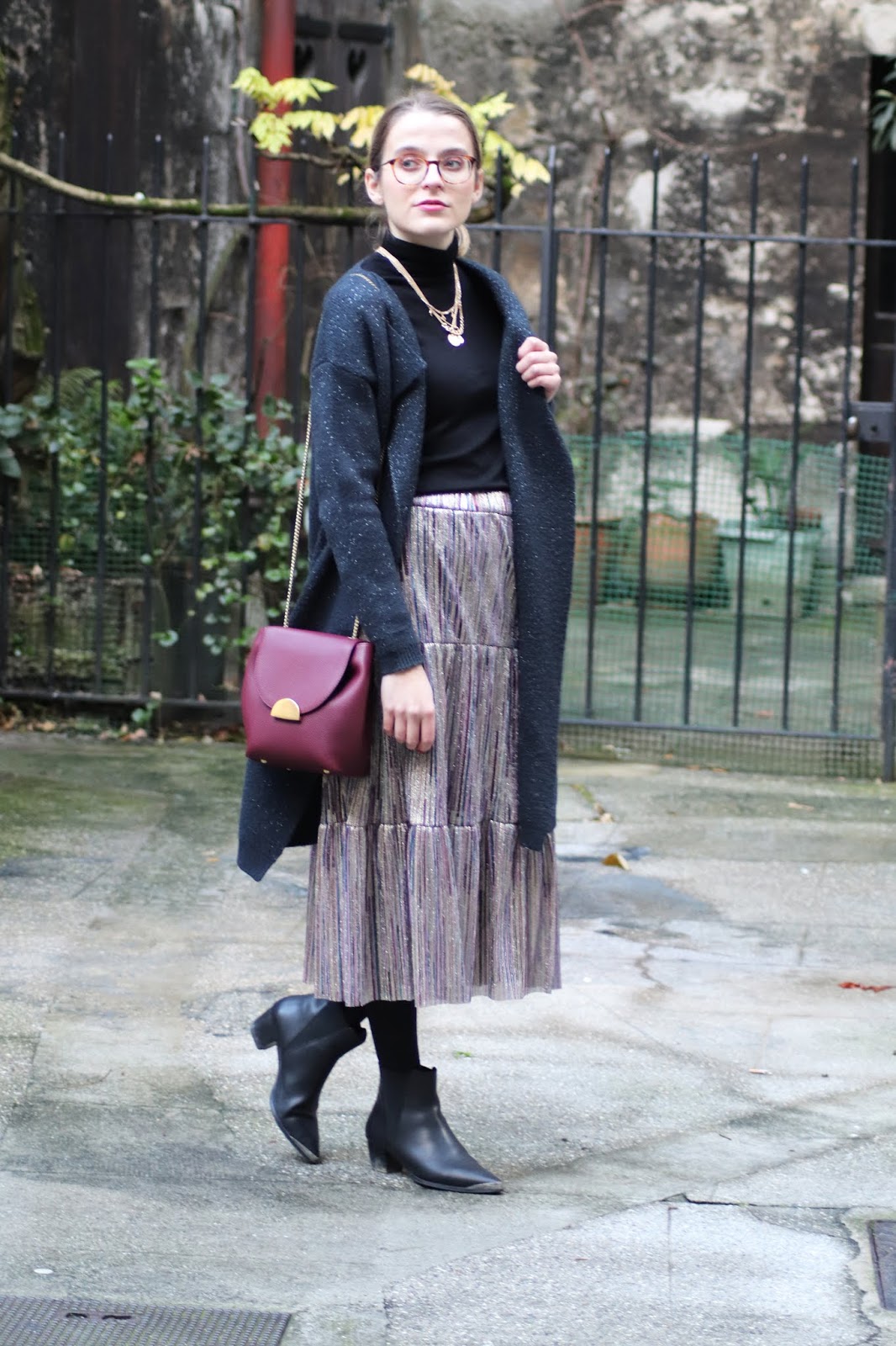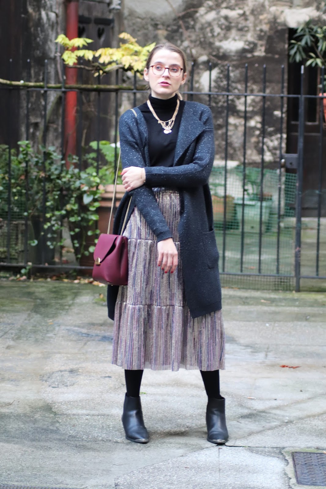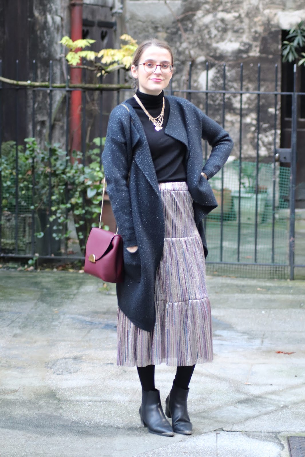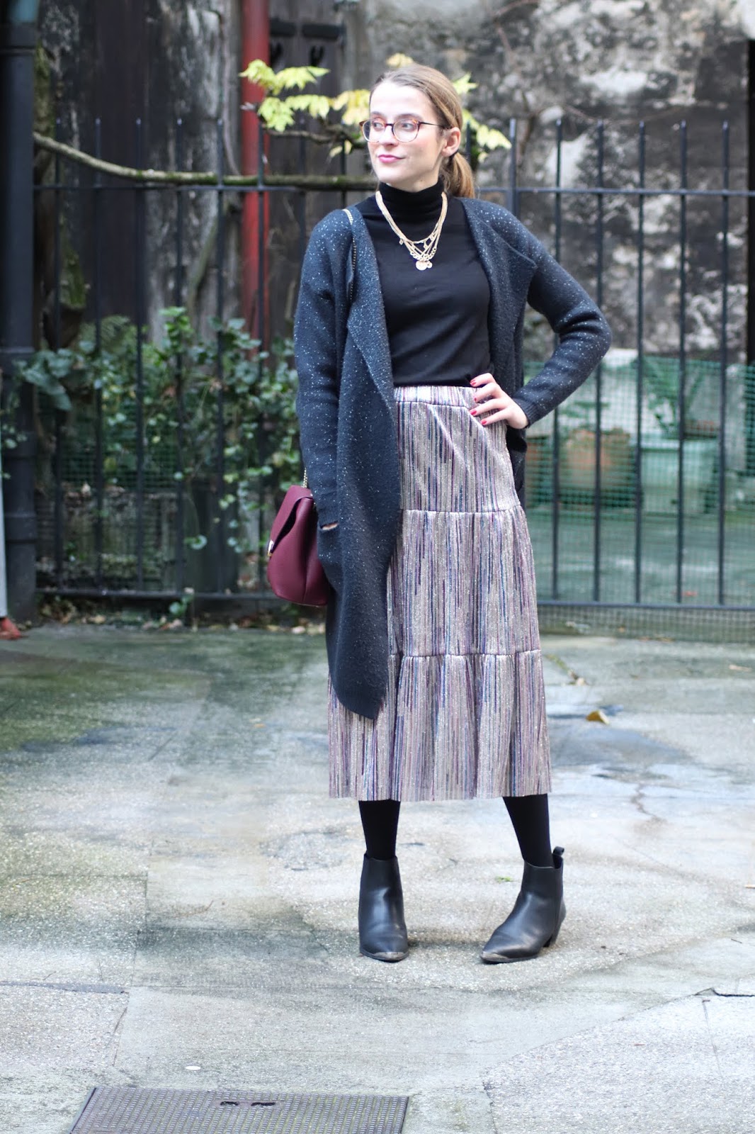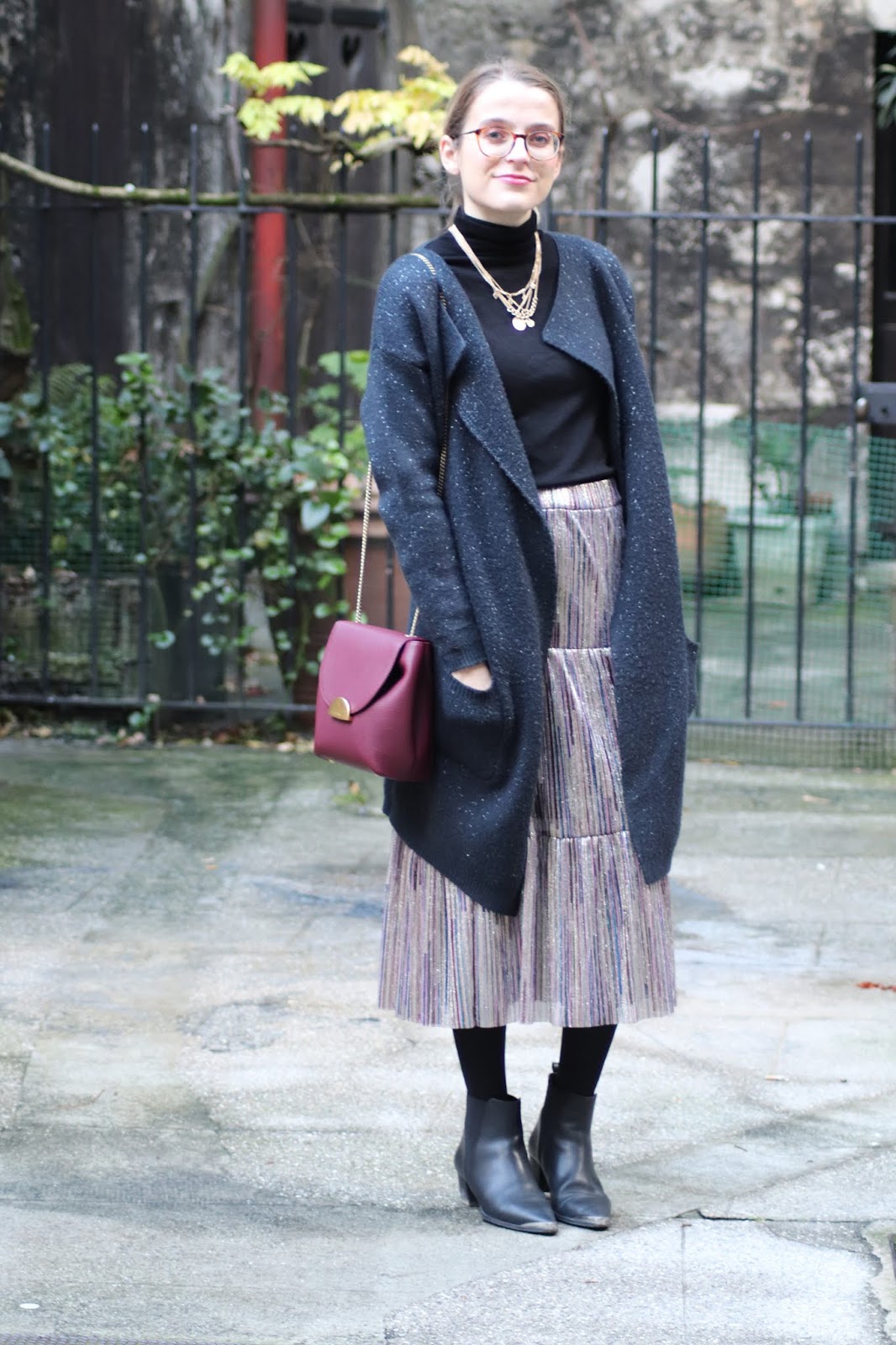 Gilet/Jacket: Promod; Haut/Top: Zara; Jupe/Skirt: Johanna Paris; Sac/Purse: Polene; Bottines/Booties: Asos